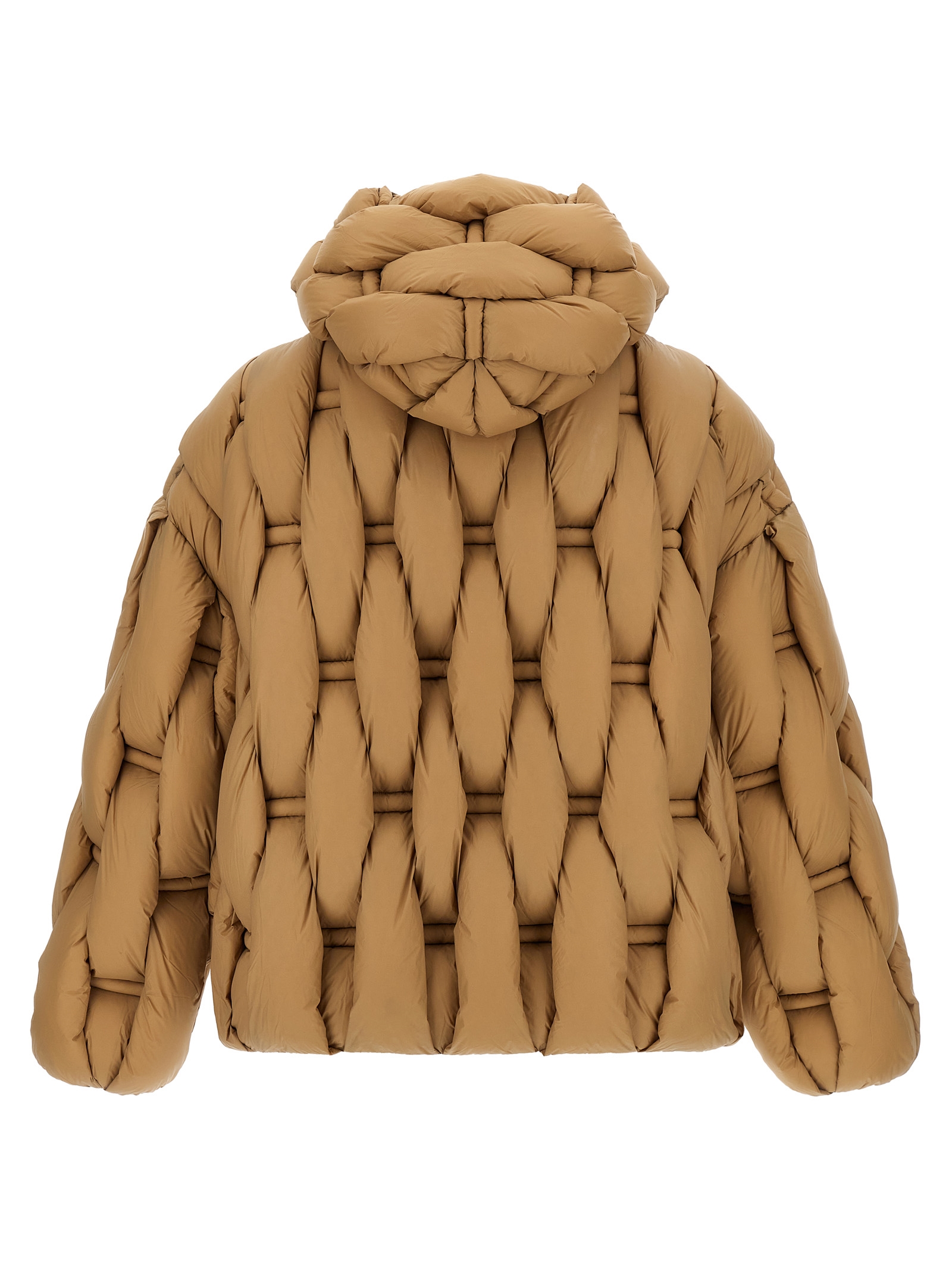 Nylon down jacket with braided 3D structure and goose feather padding, hood, high neck, front zip closure, pockets, long sleeves with cuffs and dropped shoulder, drawstring on the hem.Характеристики товара