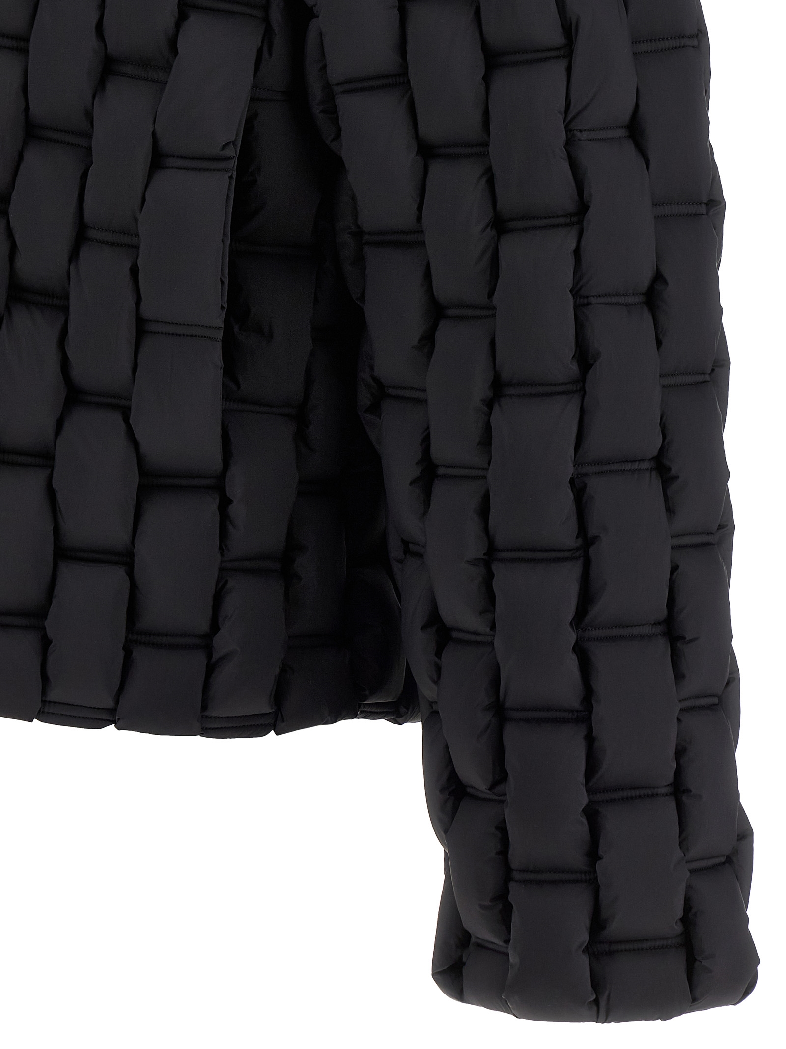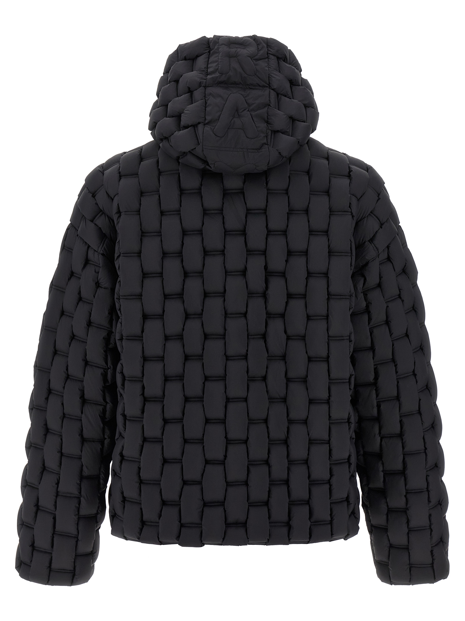 Nylon down jacket with 3D structure braided and goose feather padding, hood, high neck, front zip closure, pockets, long sleeves.