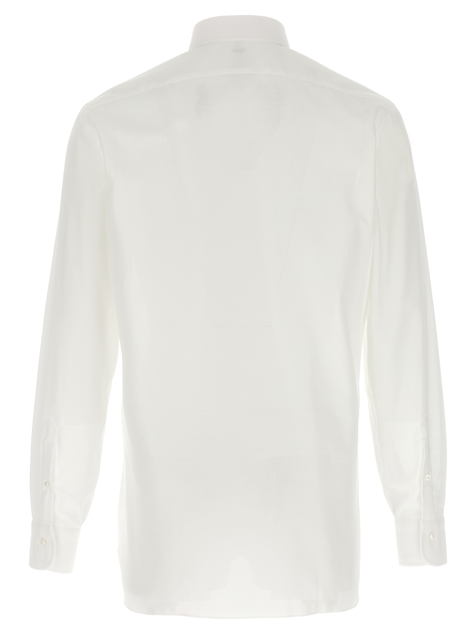 Honeycomb cotton shirt with front button closure, long cuffed sleeves.