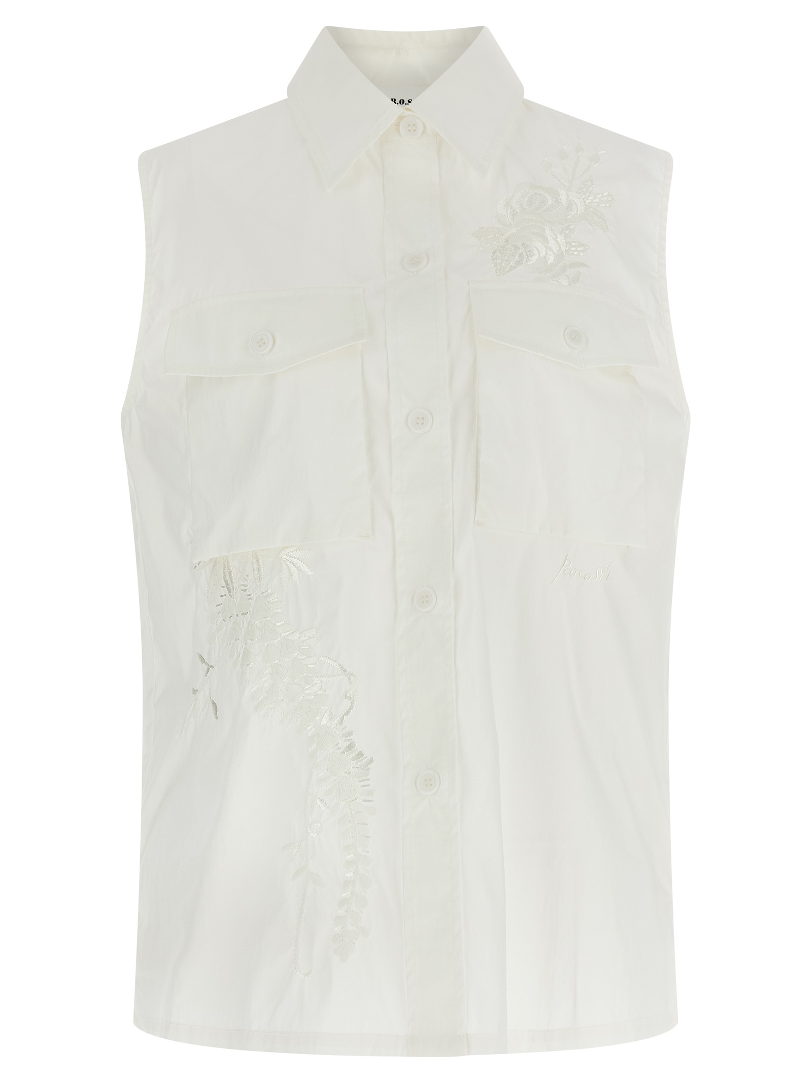 'Ninja26' shirt in technical fabric with tone-on-tone cotton embroideries on the sides, pockets, front button closure, side slits.