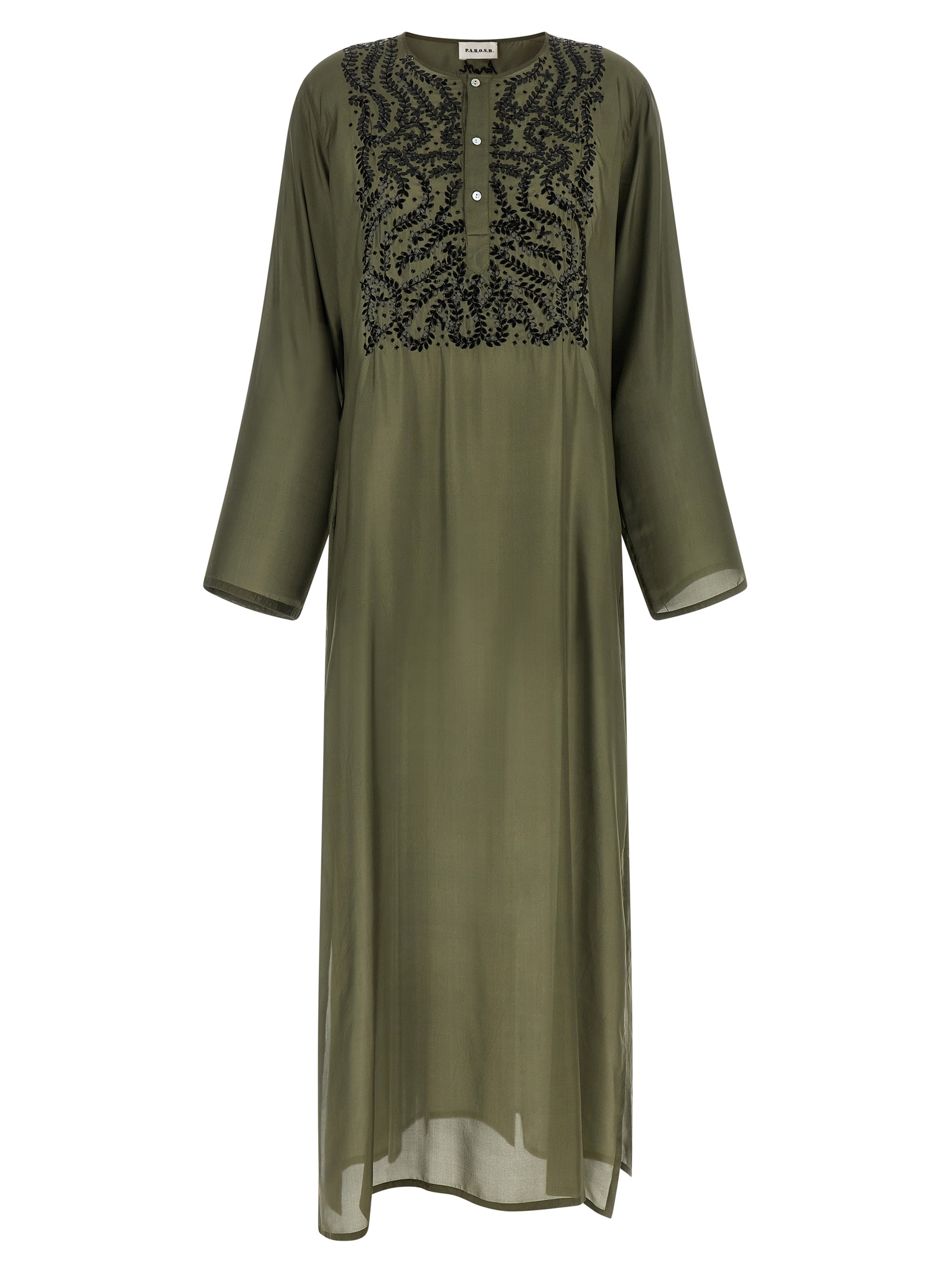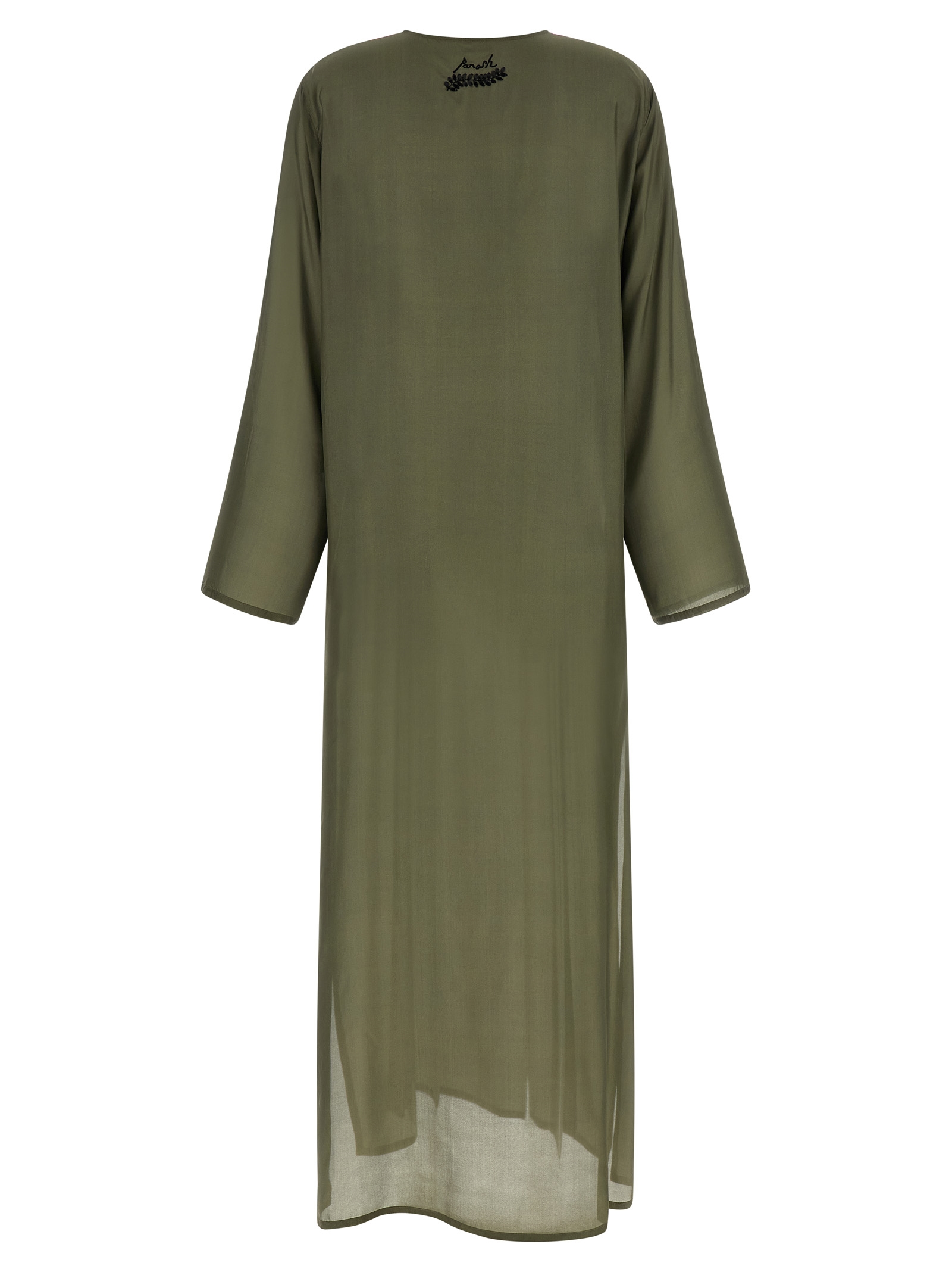 Long 'Sunset' dress in light silk with floral embroidery of sequins and beads front and back, tunic model, crew neck, front button closure, long wide sleeves, pockets, side slits.