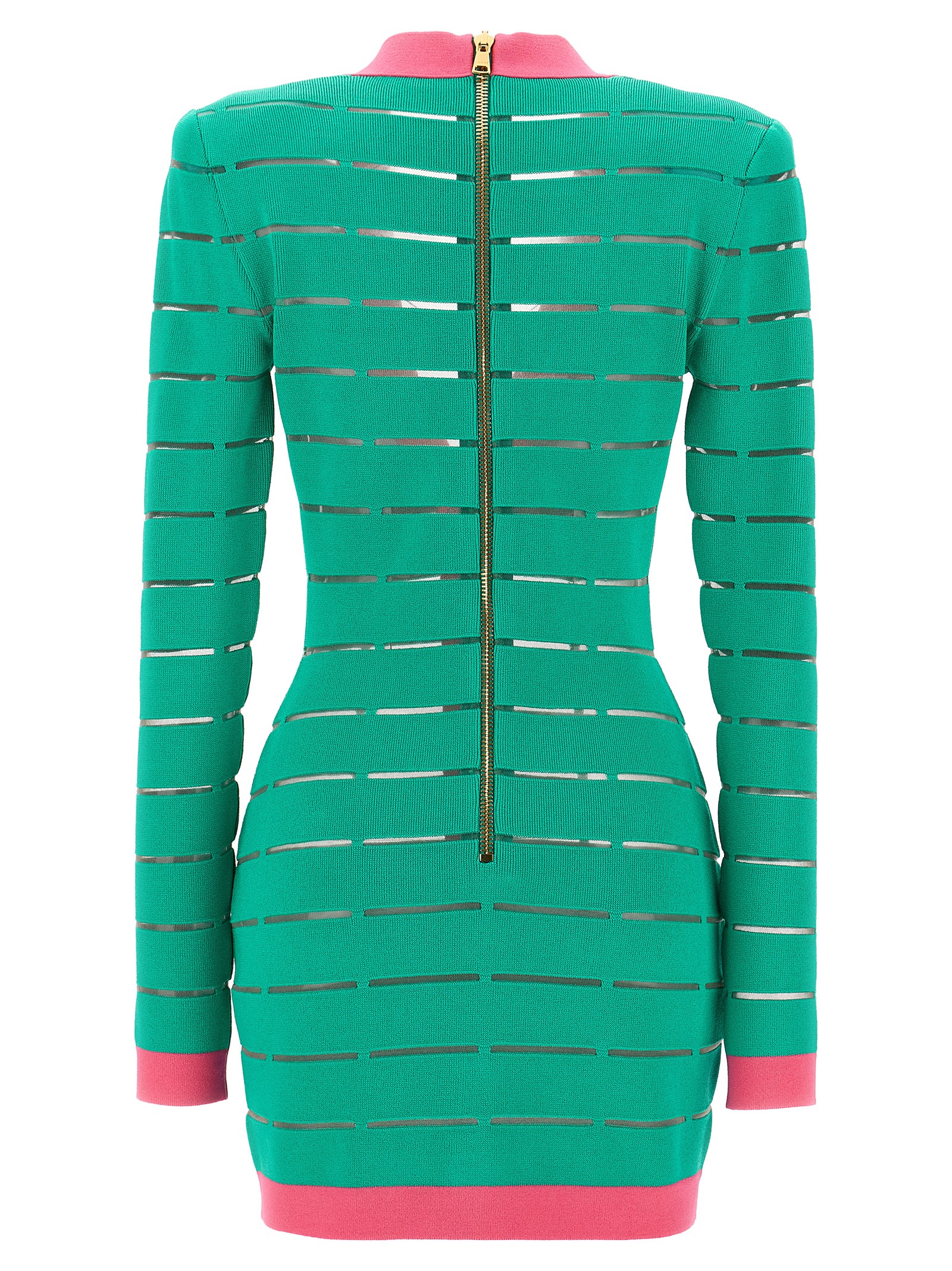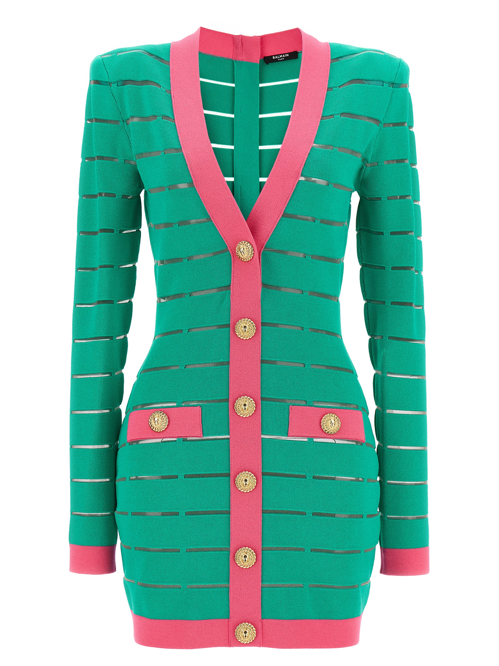 Two-tone viscose blend knit dress, sheer mesh inserts, V-neck with front logo buttons, back zip closure, padded shoulders, long sleeves.Характеристики товара