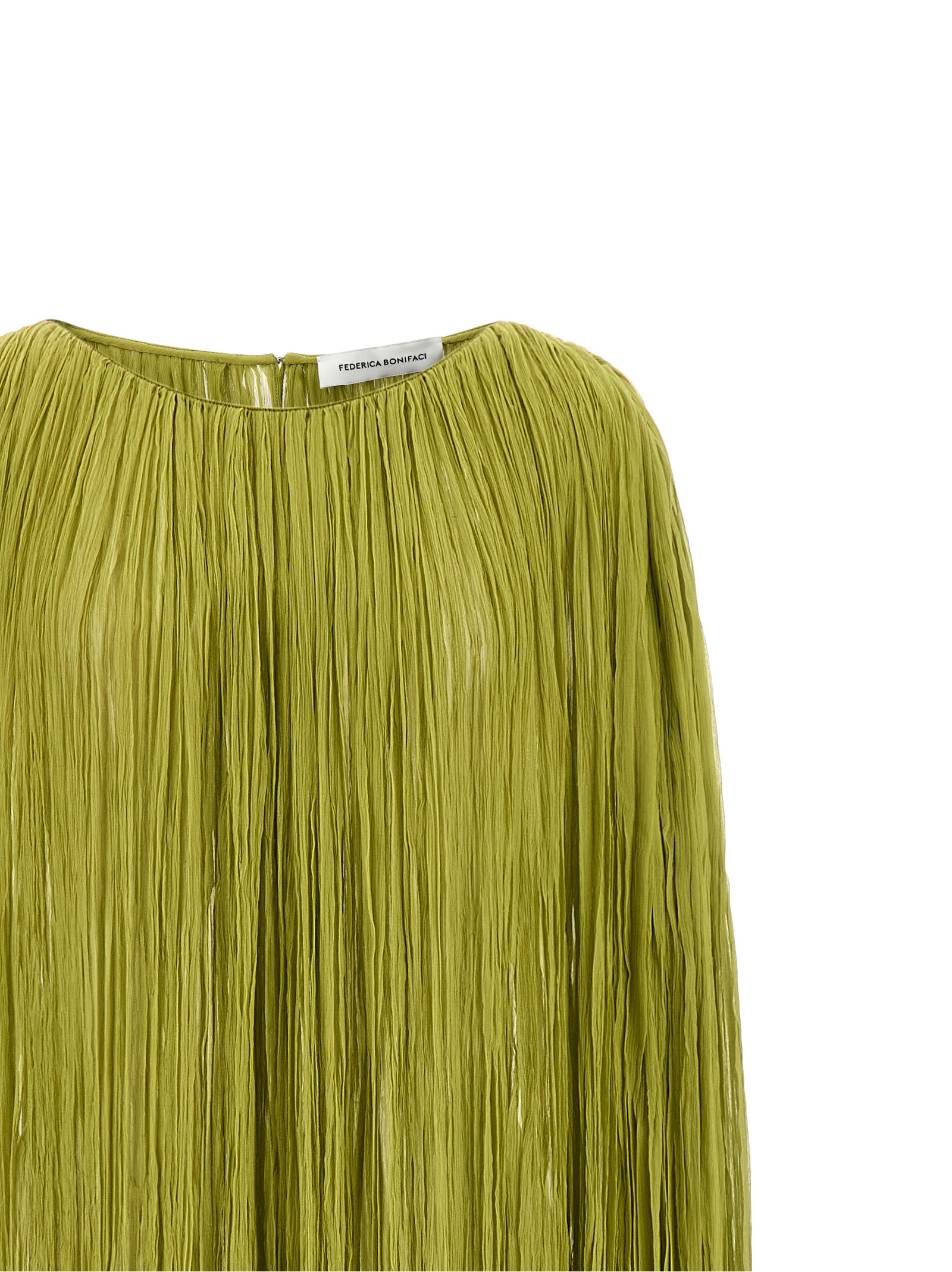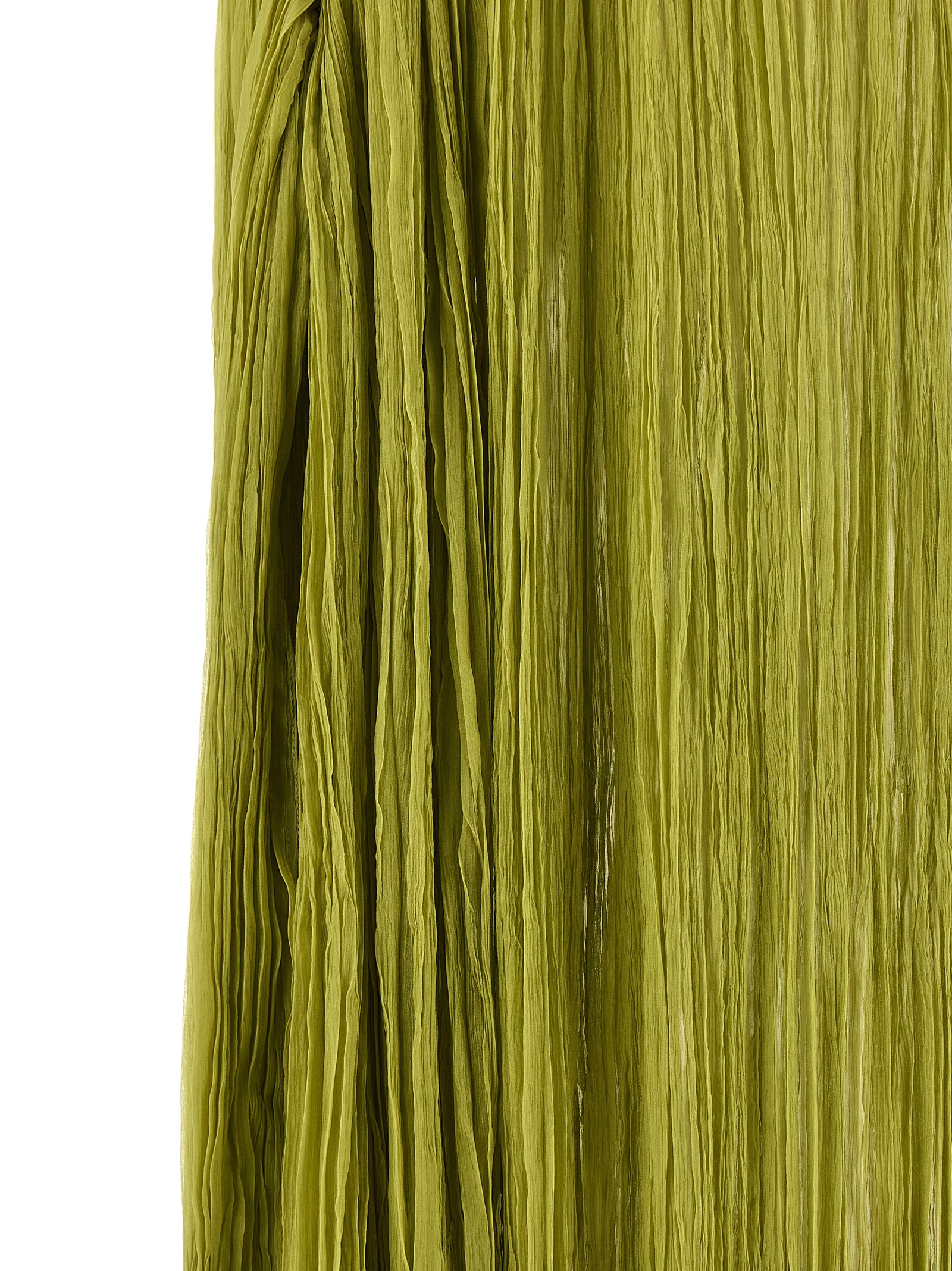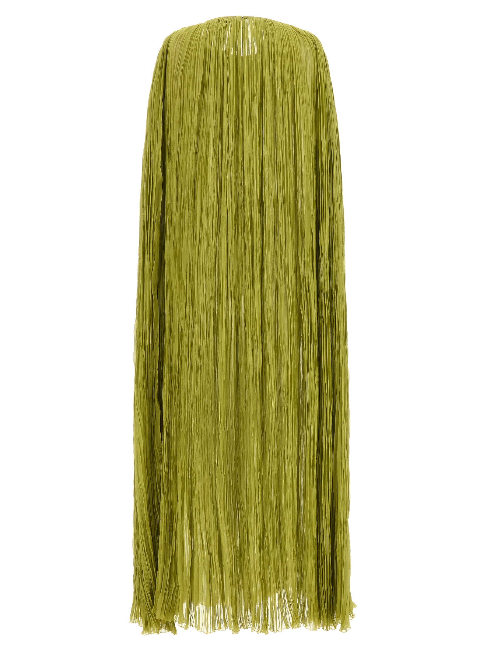 Длинное платье-накидка «Плиссированное платье» из мятого шелка с плиссировкой, модель с капюшоном и двухсекционной конструкцией, круглый вырез горловины, проймы рукавов, застежка на пуговицы сзади с вырезом в форме капли, боковые разрезы по низу.Характеристики товара