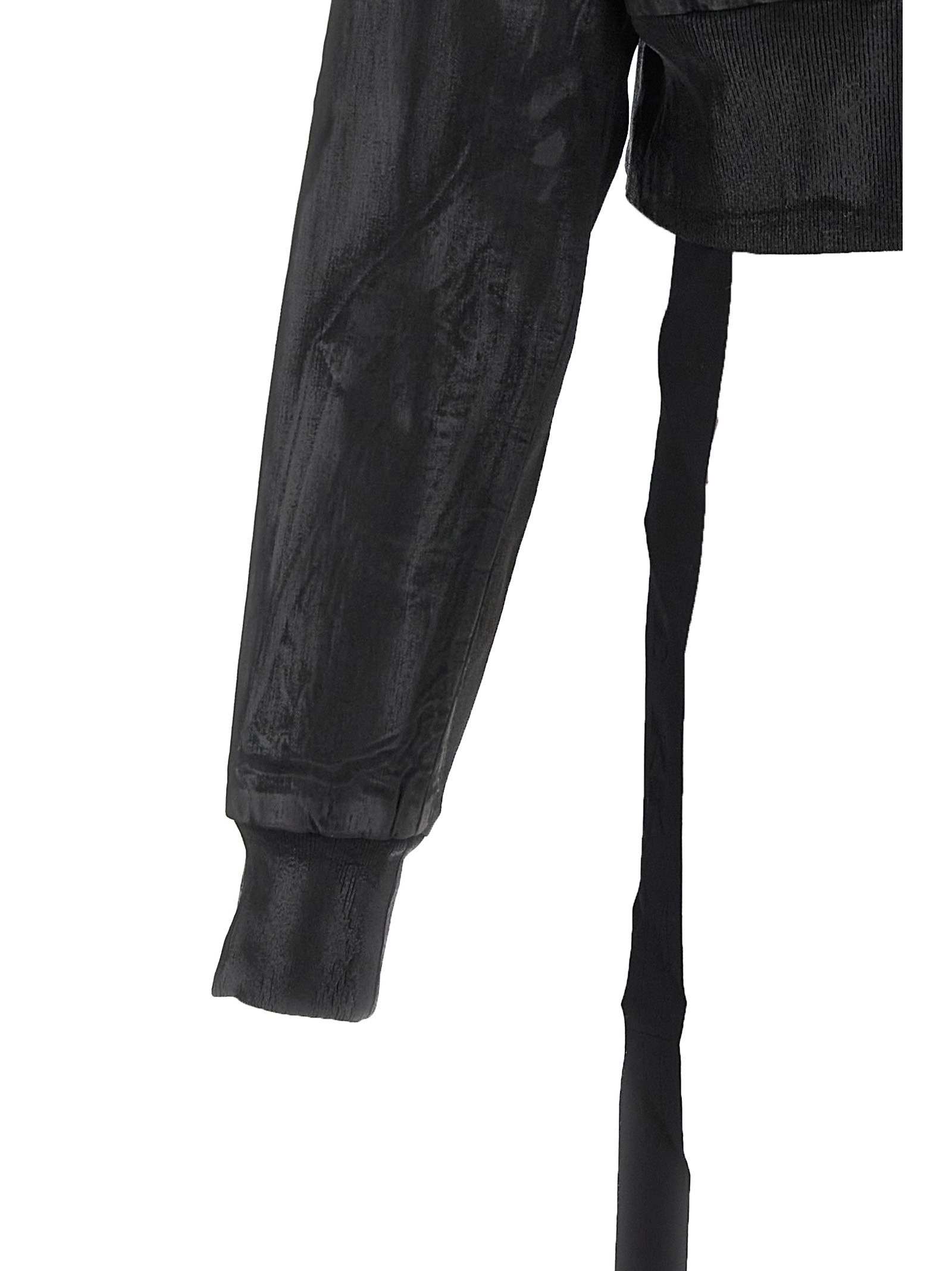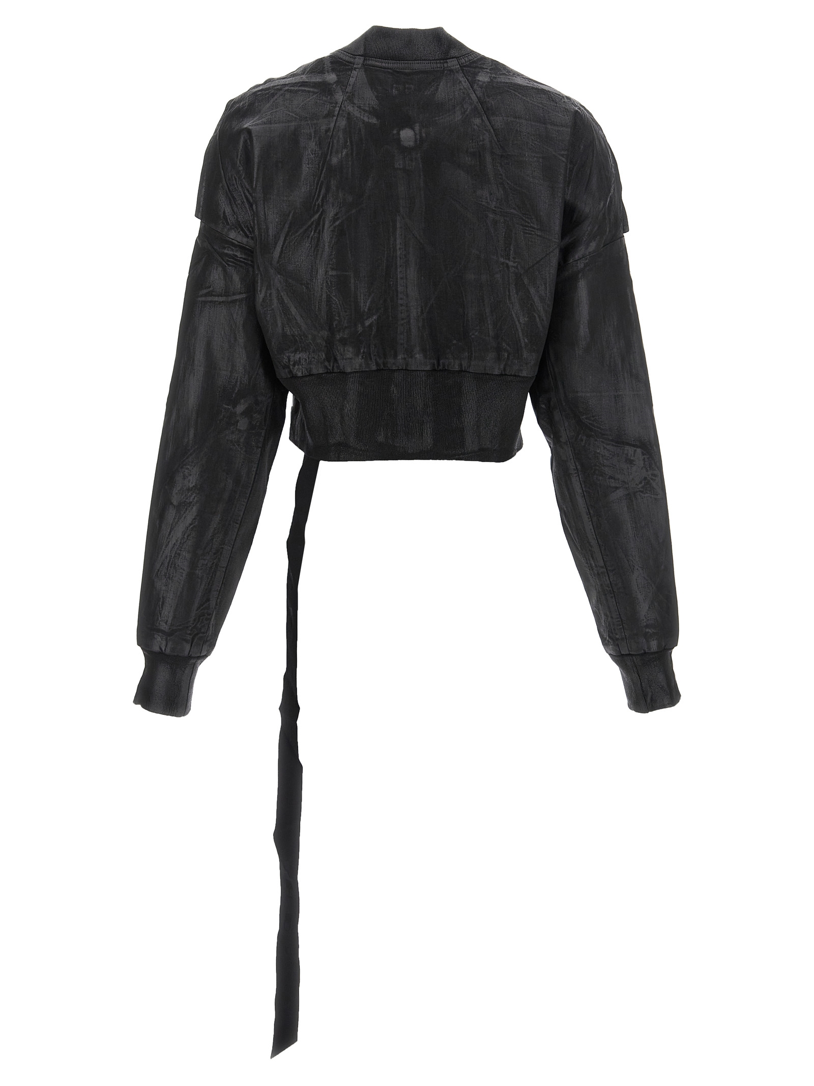 'Flight' foil overdyed stretch denim bomber jacket, crop model, zip closure, long sleeves with dropped shoulder cuffs and pockets. Since the film is pressed it will stick to the garment in a different way, this makes each piece unique.