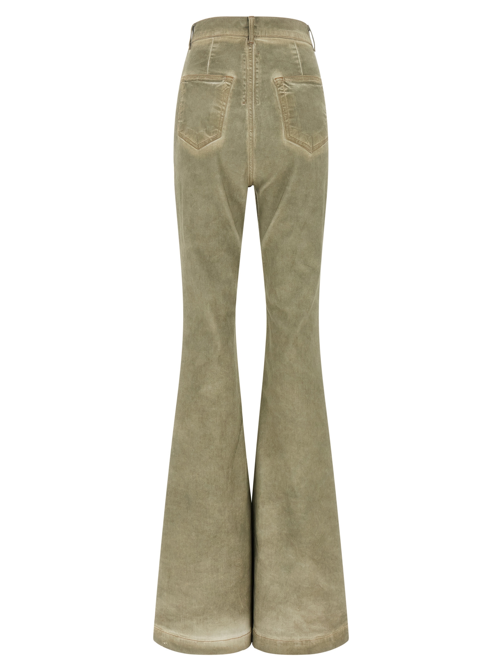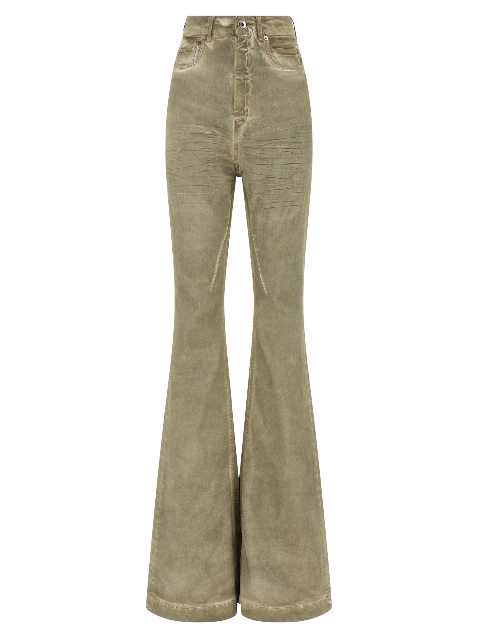 High-waisted stretch cotton denim Bolan Bootcut jeans with flared leg, five pockets, zip and front button closure. Since the foil, at the end of processing, is pressed over the garment to create a waxy touch, each piece will have a unique appearance and folds, as the foil will stick in different points depending on the garment.