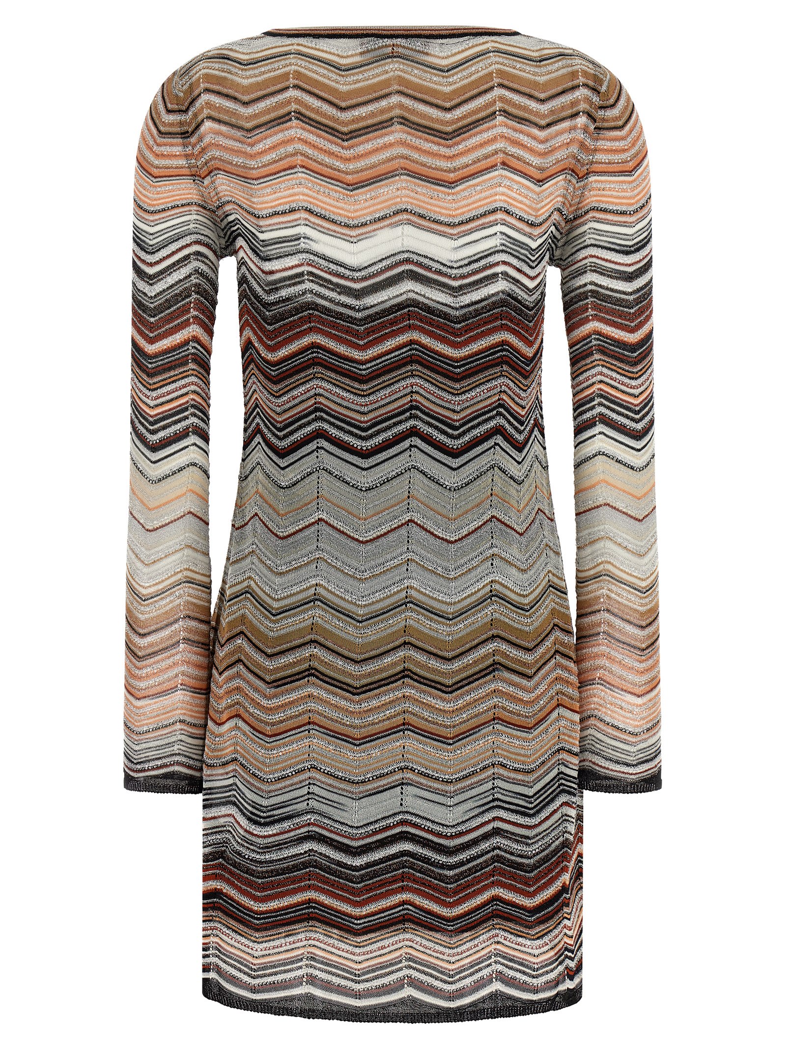 Chevron lamé viscose mini dress with all-over sequin appliqué, slightly flared silhouette, wide front neckline, long sleeves, petticoat with thin straps.