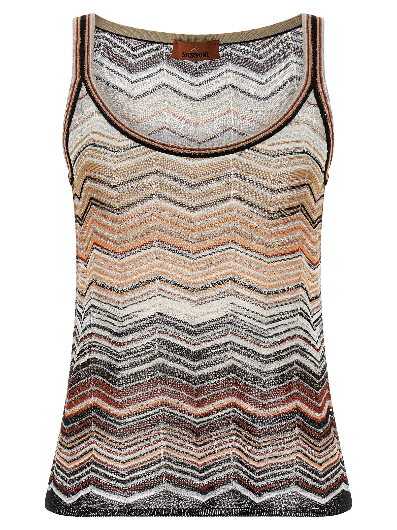 Tank top in viscose chevron lamé pattern with all-over sequin application, wide round neckline on the front.