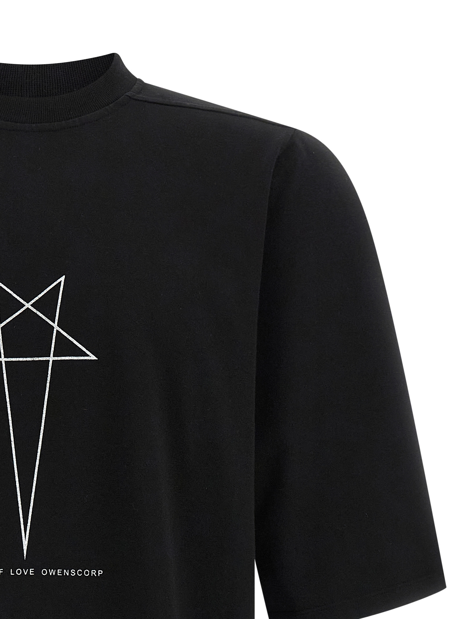 'Jumbo' heavy cotton t-shirt with front 'Temple of love Owenscorp' print, crew neck, short sleeves with dropped shoulders.