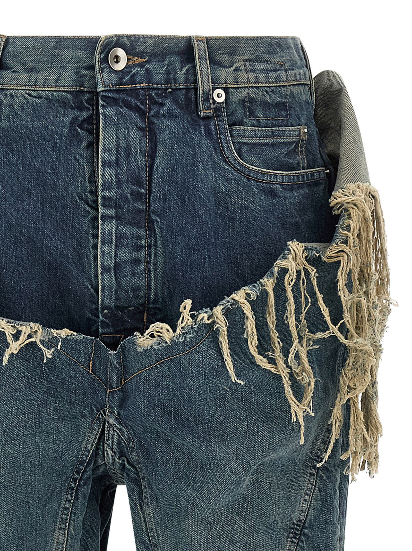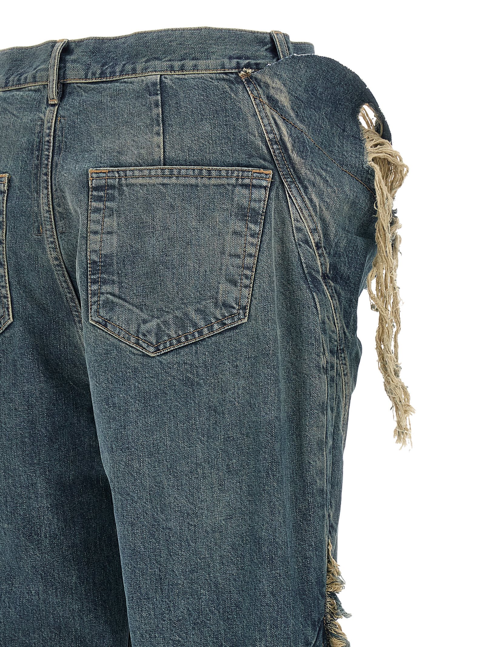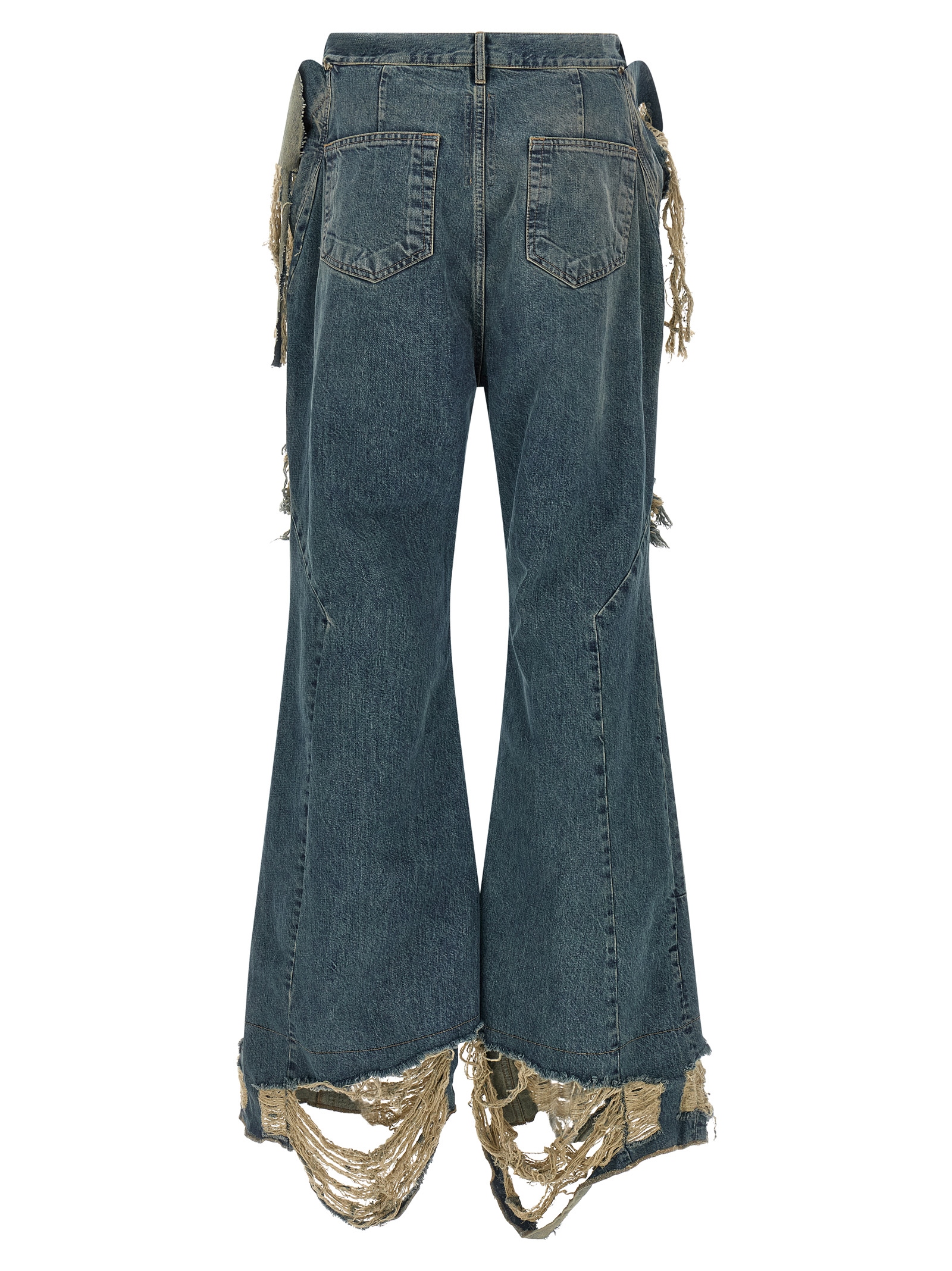 13oz stone-washed and hand-worn Japanese indigo denim Slivered Bootcut jeans, contrast stitching, laser rips, brittle corner insert from the outside of the hip to the crotch, and brittle inserts with stitching from the outside of the thigh to the brittle hem, high waist, extra long flared leg, front button closure. Five pockets.