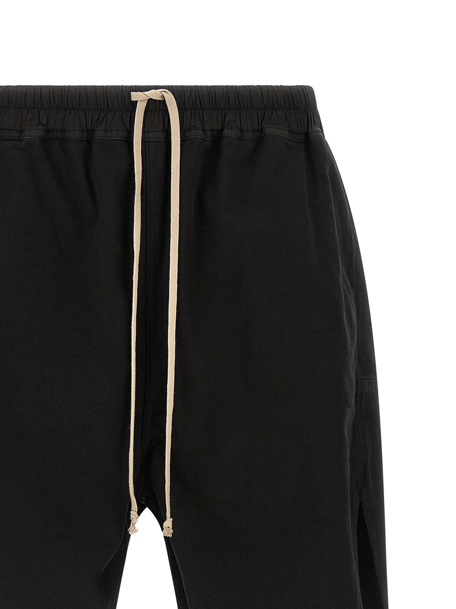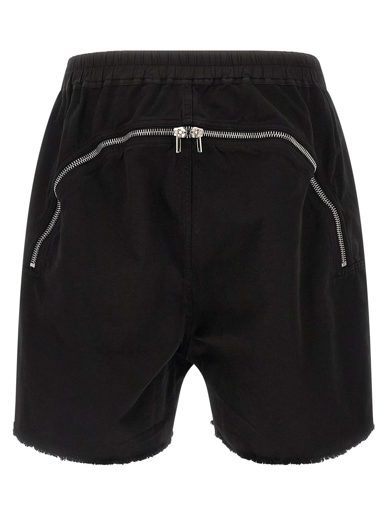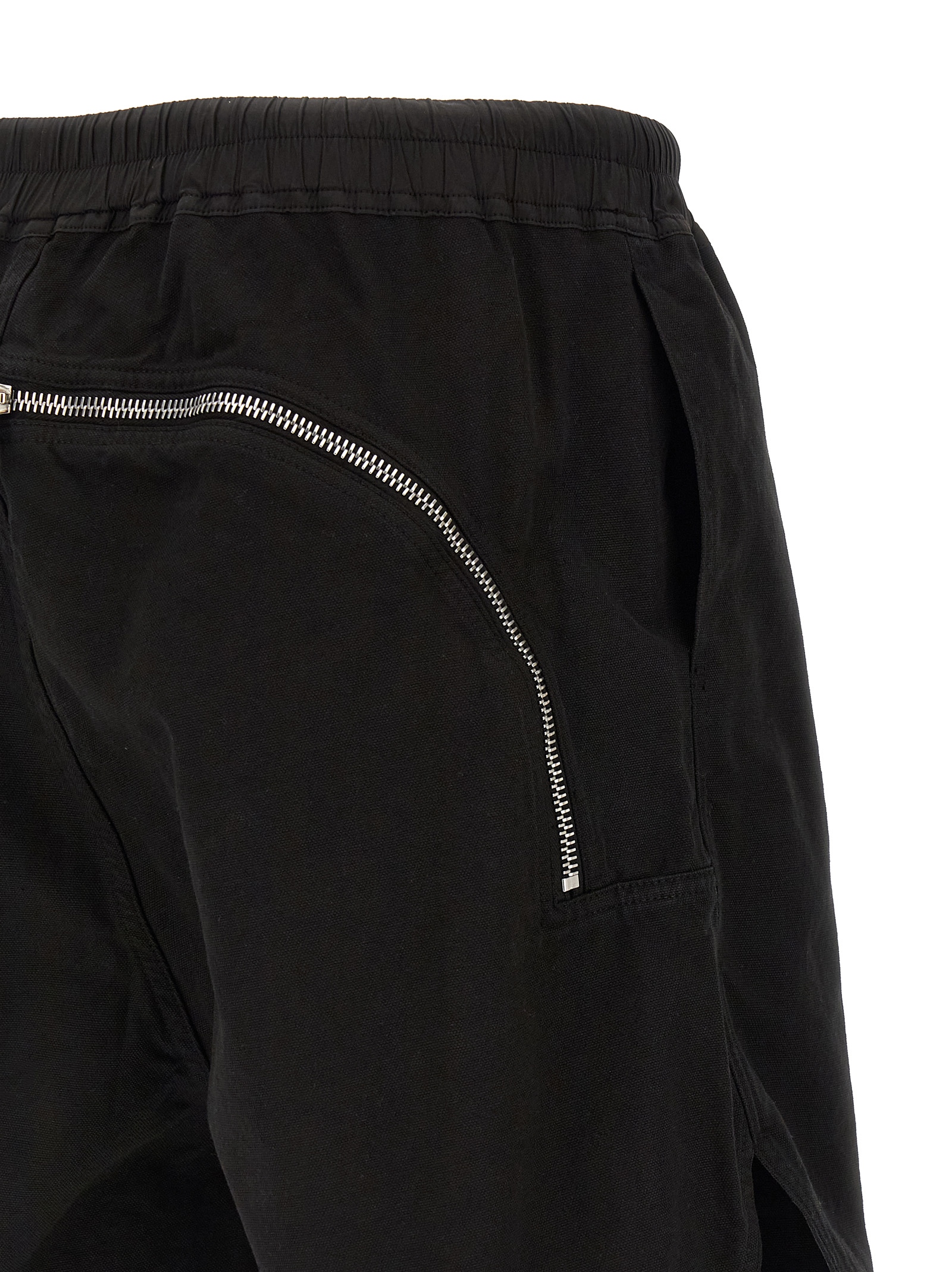 'Long Boxers Butt Zip' cotton canvas bermuda shorts, low crotch, drawstring elastic waistband, wide leg, pockets, back zip detail, side slits, raw cut hem.