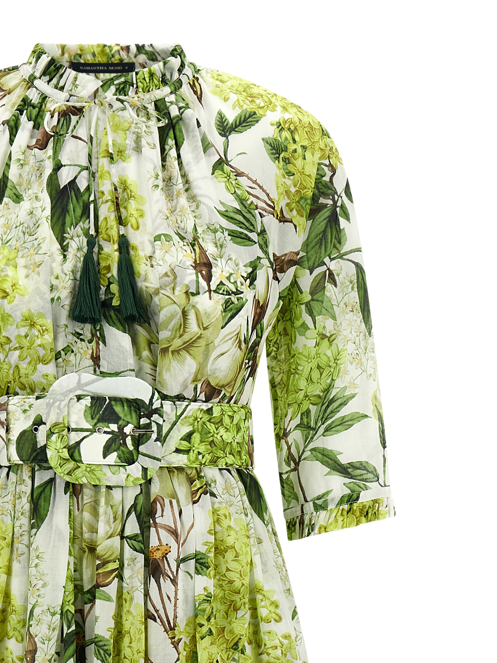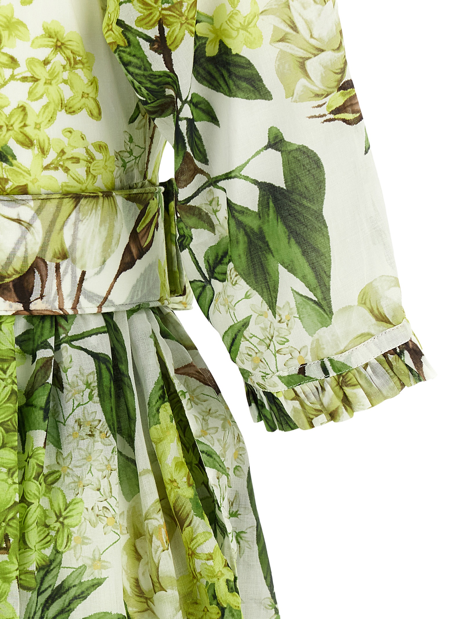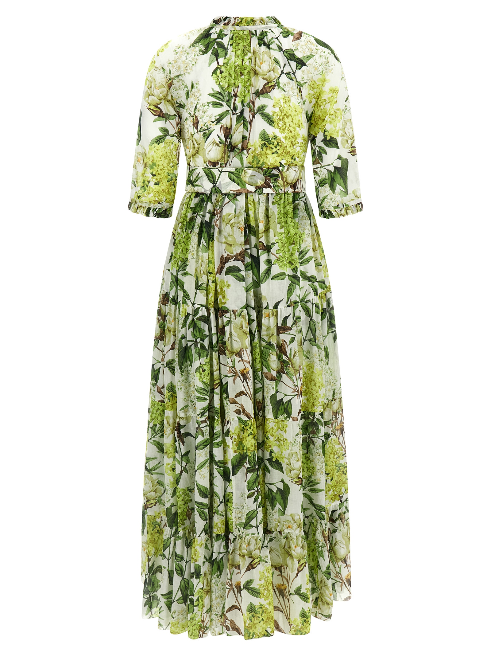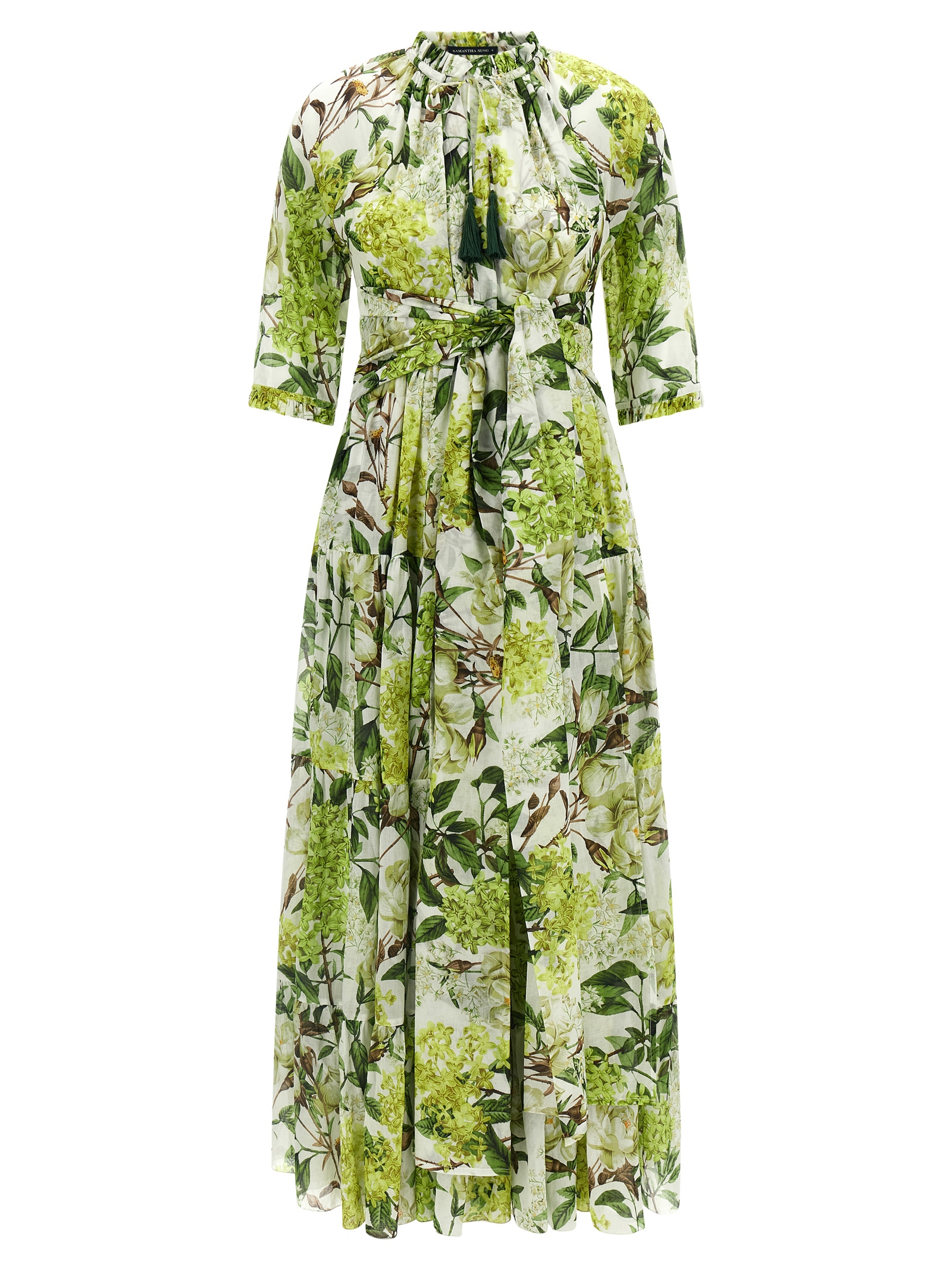 Длинное платье «Эдем» из хлопкового муслина с принтом по всей поверхности, V-образный вырез с застежкой на одну пуговицу, воротник с оборками и кулиской с кисточкой, широкая юбка, нижняя юбка, карманы, рукава 3/4 с оборками по низу рукавов, съемный пояс и лента в тон.