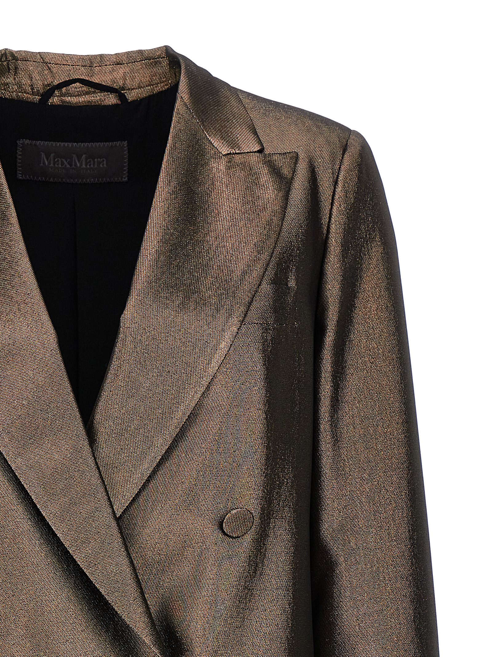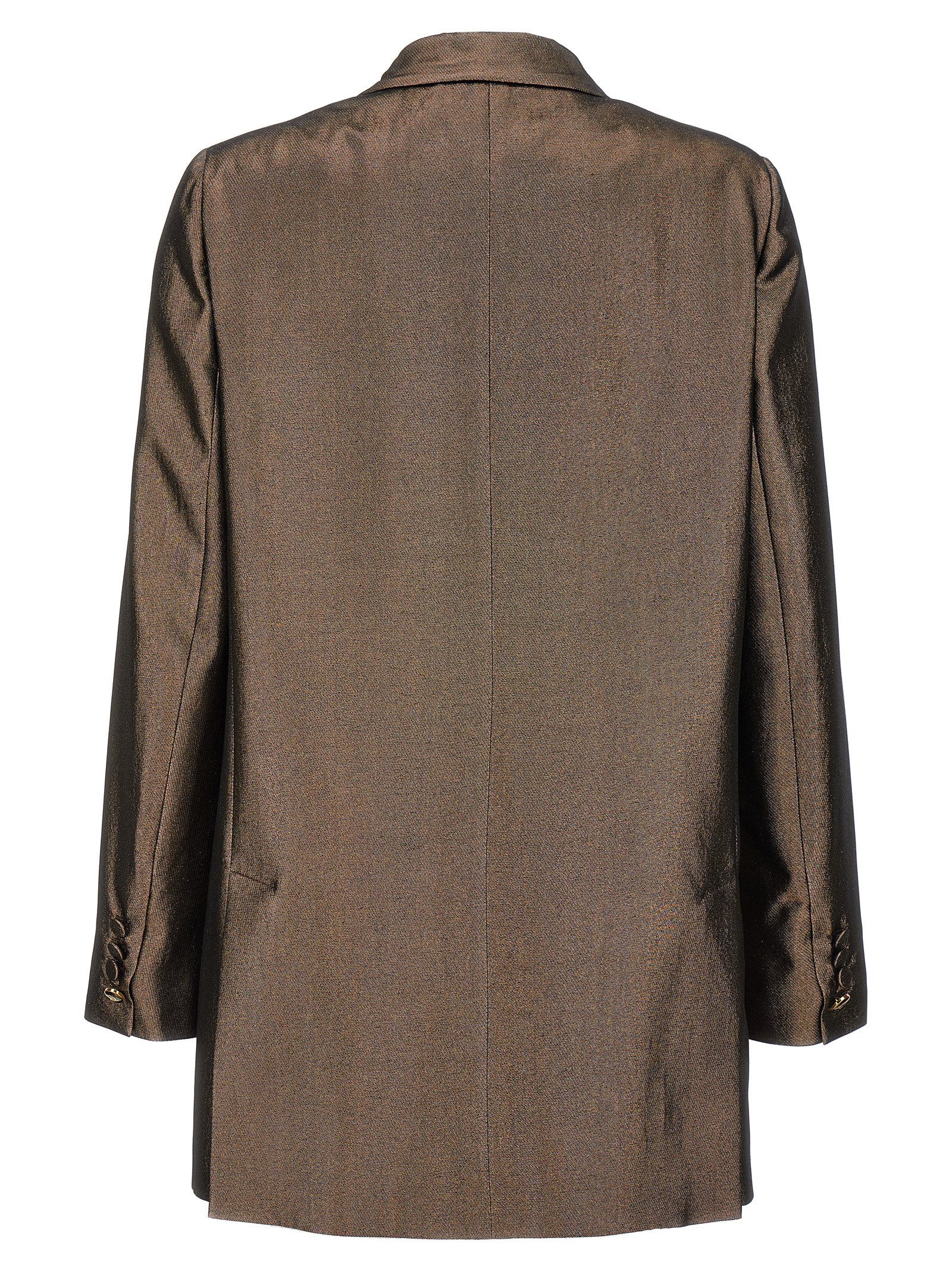 'Edro' lamé blazer jacket in brown silk charmeuse, double-breasted button closure, peak lapels, pockets, back vents, long sleeves.