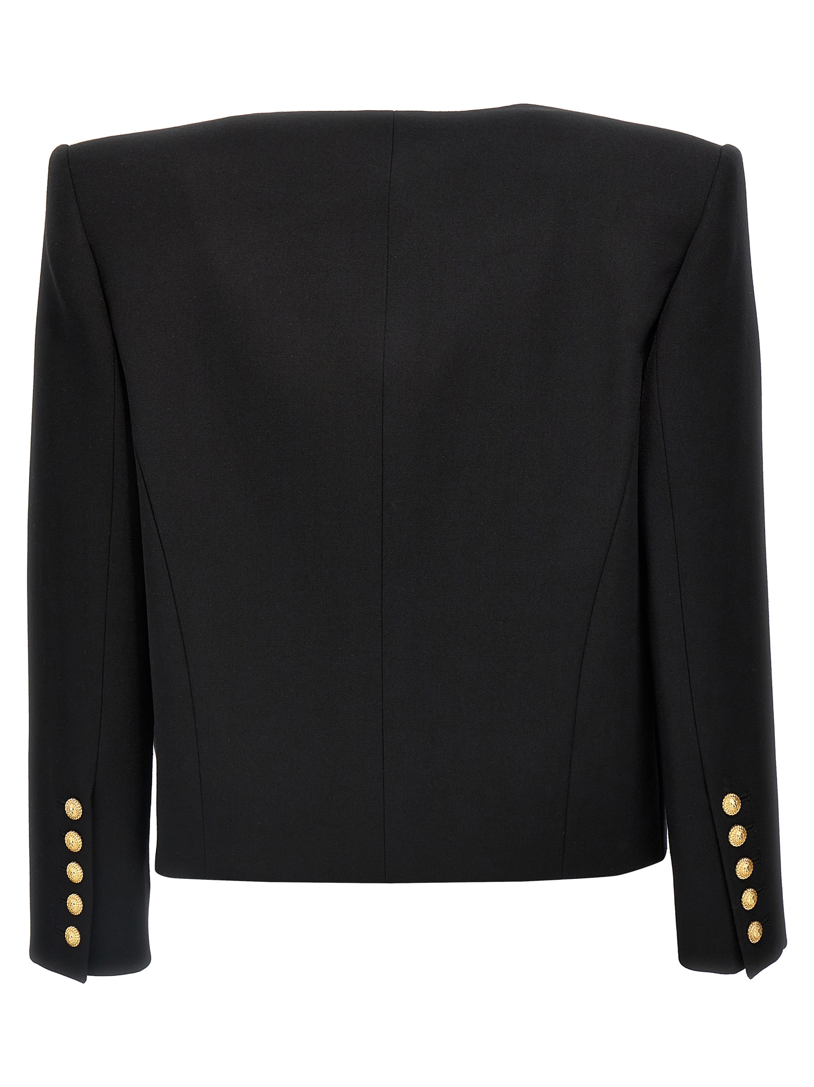 Grain de poudre blazer with 'Leone doppia catena' logo buttons, round neckline with cut-out Italian tailored collar, Spencer style spear satin lapels, padded structured shoulders, 3/4 sleeves.Характеристики товара