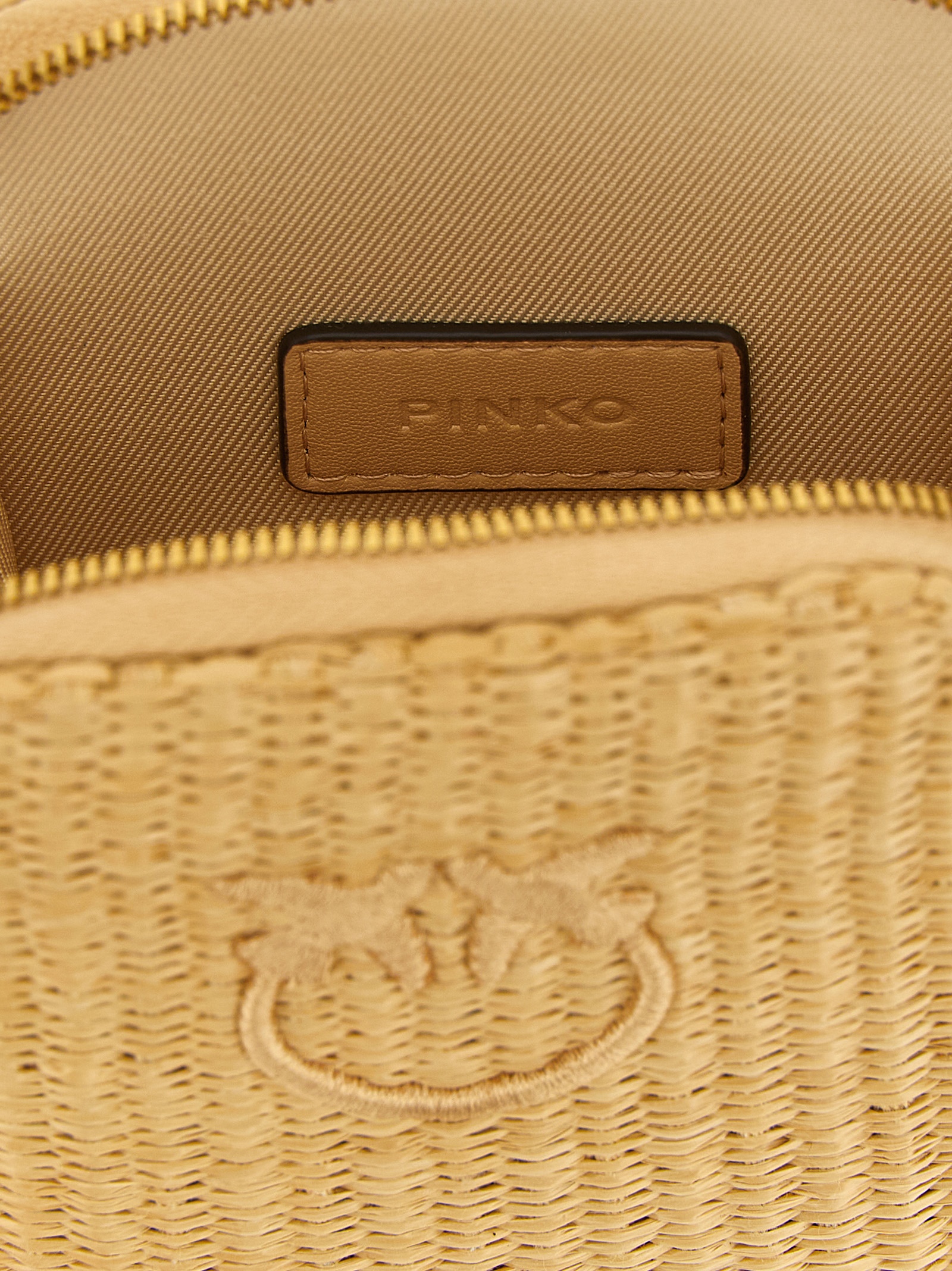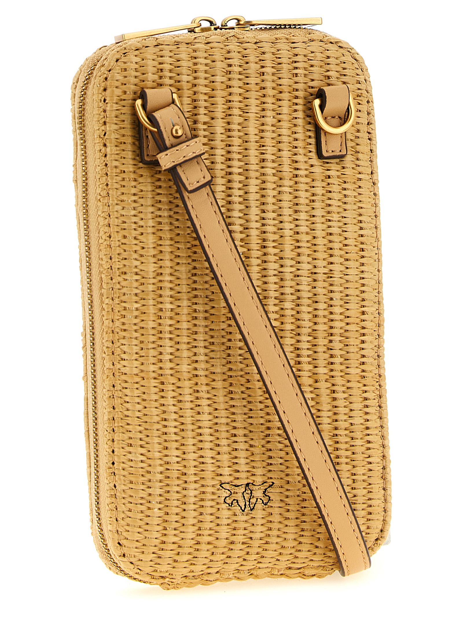 Braided raffia smartphone holder with tone-on-tone Love Birds Diamond embroidery on the front, zip-around closure, adjustable and removable leather handle and shoulder strap. Handcrafted product, any imperfections are to be considered characteristics of uniqueness.