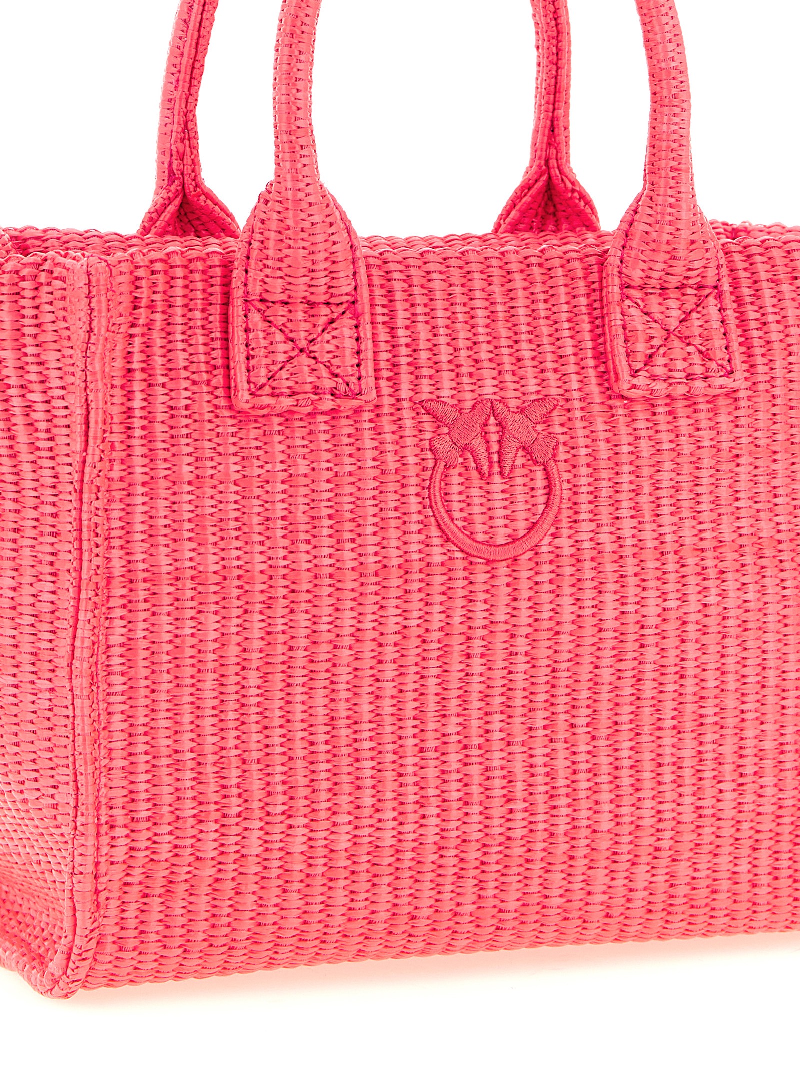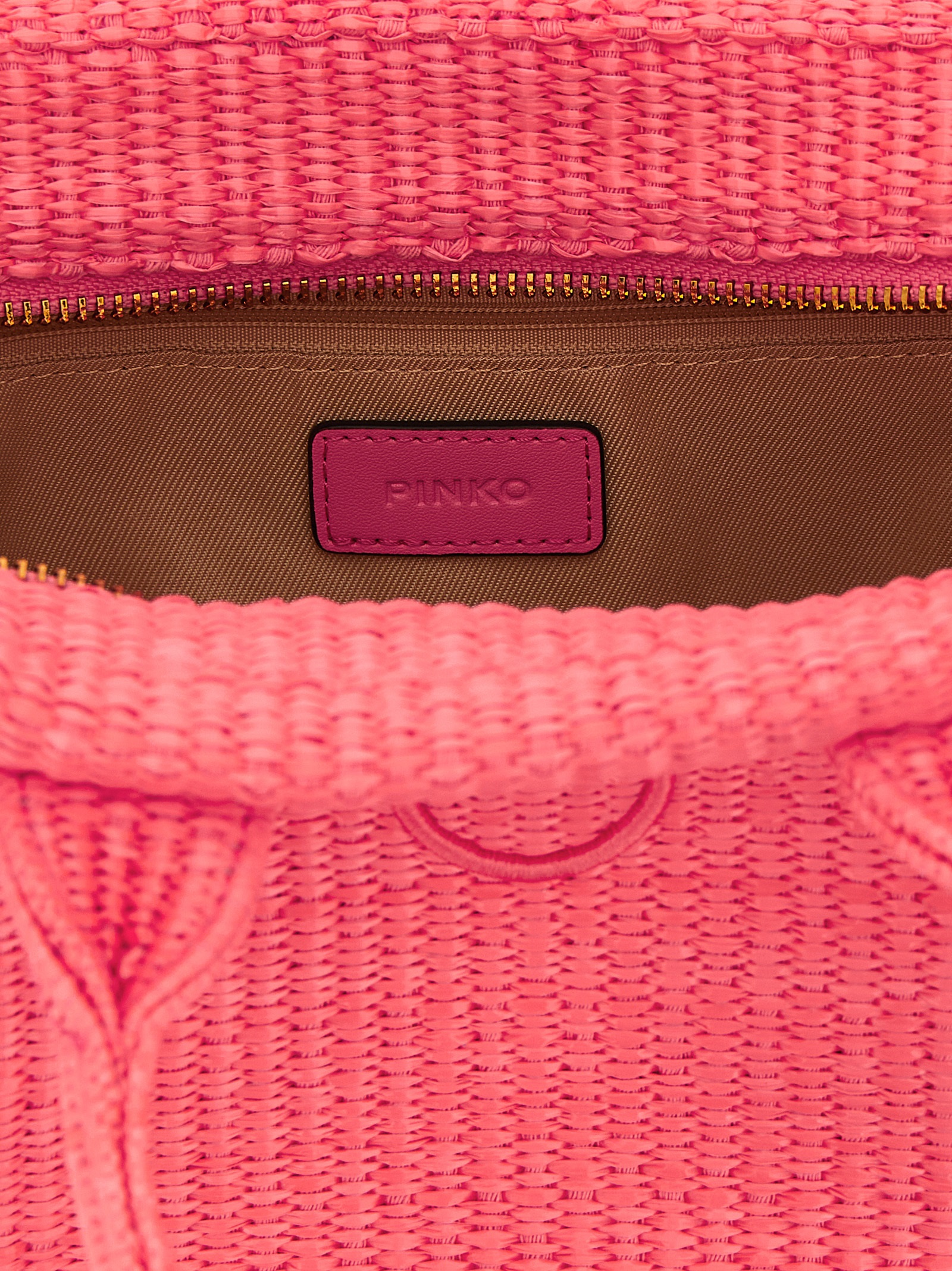 'Beach' mini shopping bag in woven raffia with tonal 'Love Birds Diamond' embroidery on the front, double fixed tubular handle, top zip closure, lining, two inner pockets. Handcrafted product, any imperfections are to be considered characteristics of uniqueness.