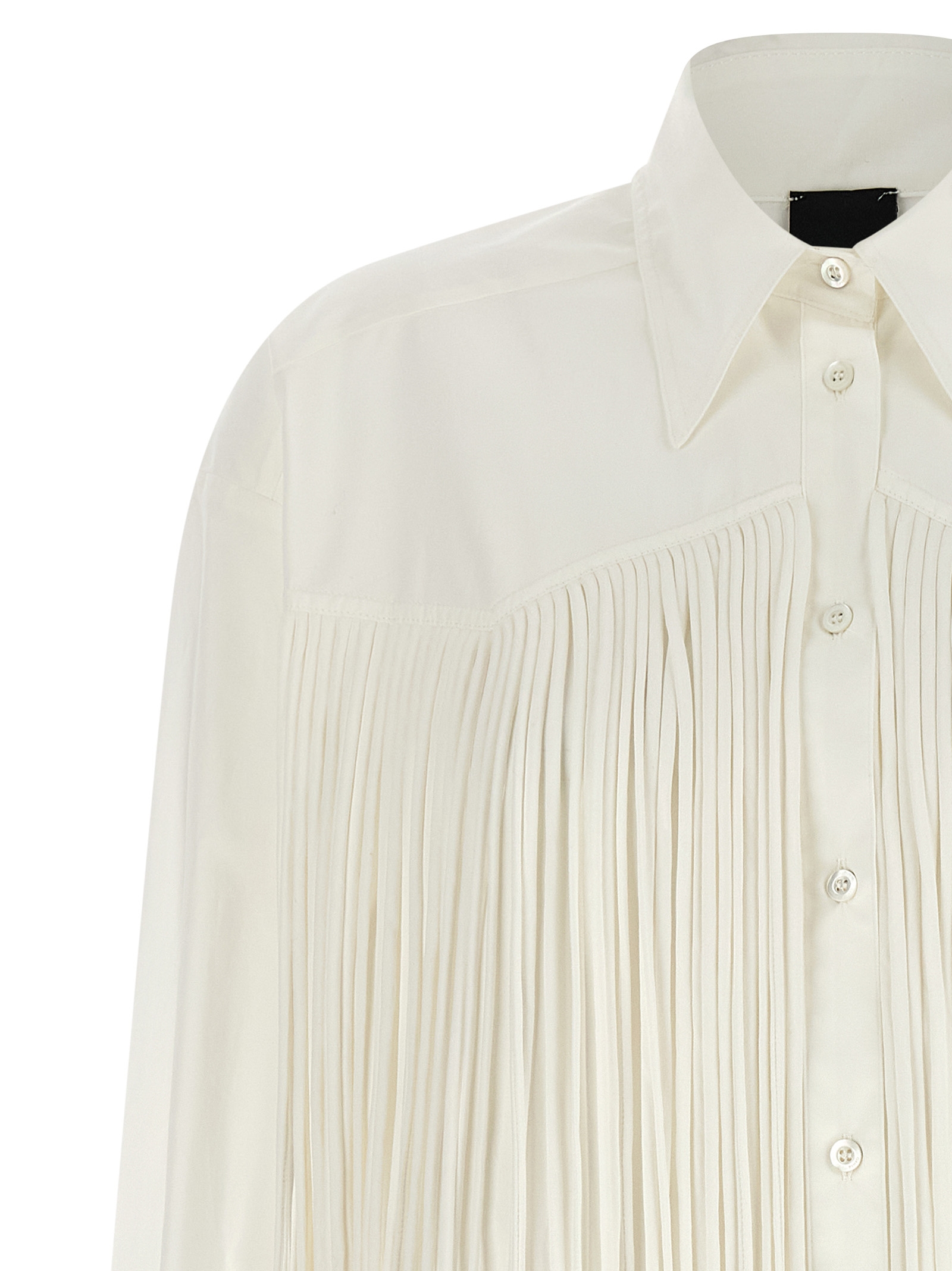 Mini 'Alife' dress in cotton poplin with long front tone-on-tone fringes, chemisier model, pointed collar, front mother-of-pearl button closure, long sleeves with cuffs and slightly dropped shoulder, back rack with cannon pleats, rounded hem.
