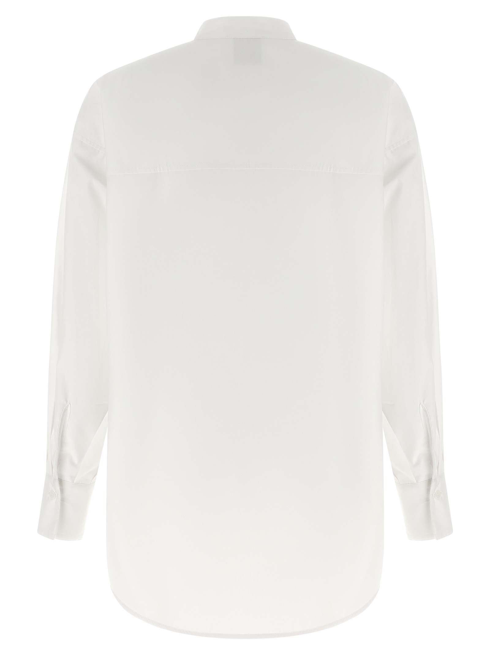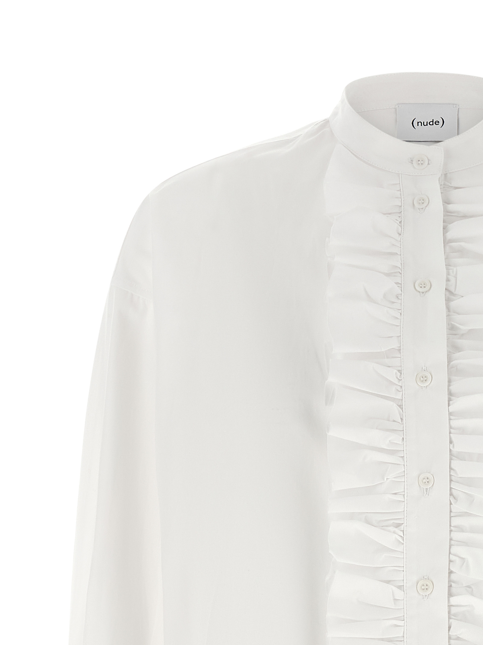 Cotton poplin shirt with mandarin collar, mother-of-pearl button closure with ruffle detail on the front, long wide sleeves with cuffs and dropped shoulders, side slits, rounded and asymmetrical hem.