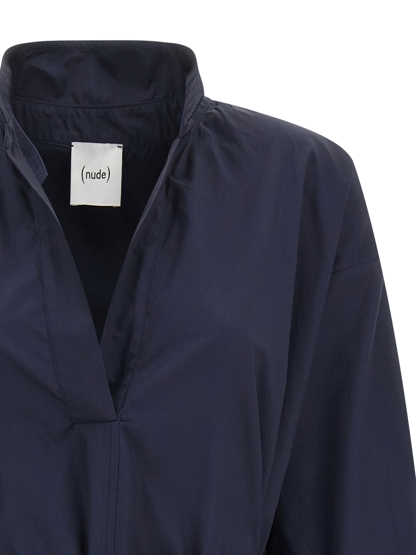 Chemisier midi dress in cotton poplin with open collar, long sleeves with cuffs and dropped shoulder, pockets, front and side slits, rounded hem, and removable matching belt.