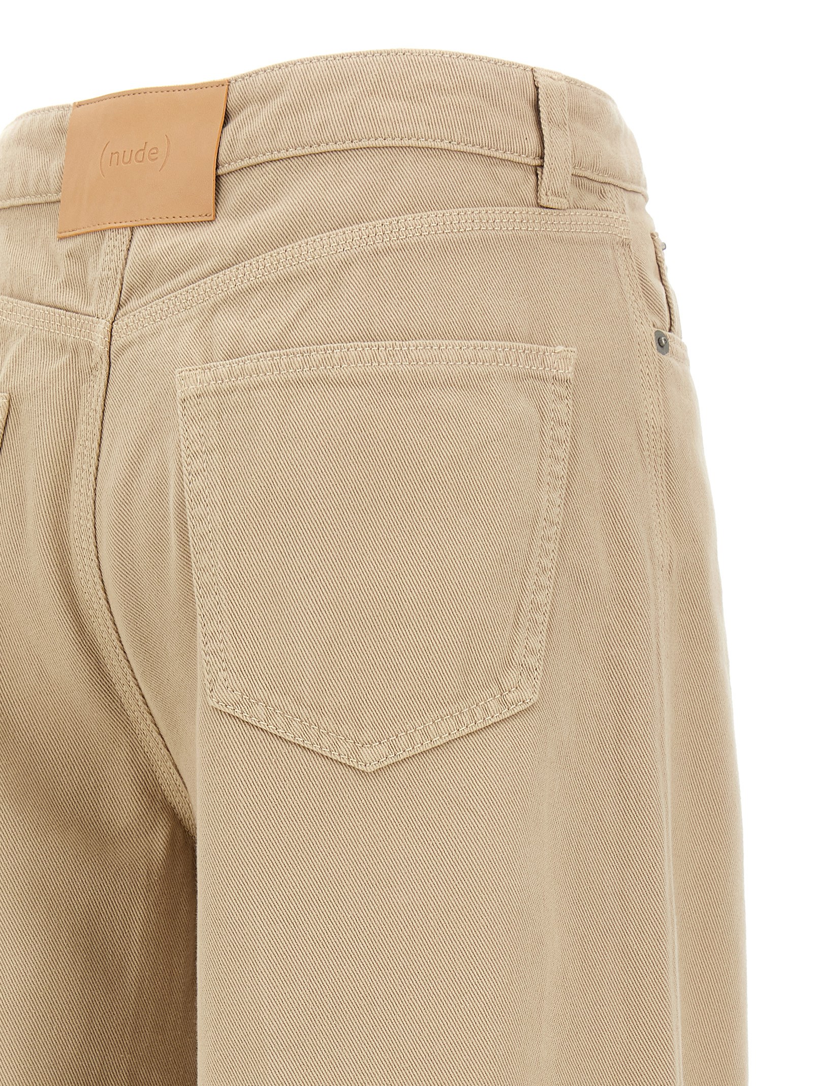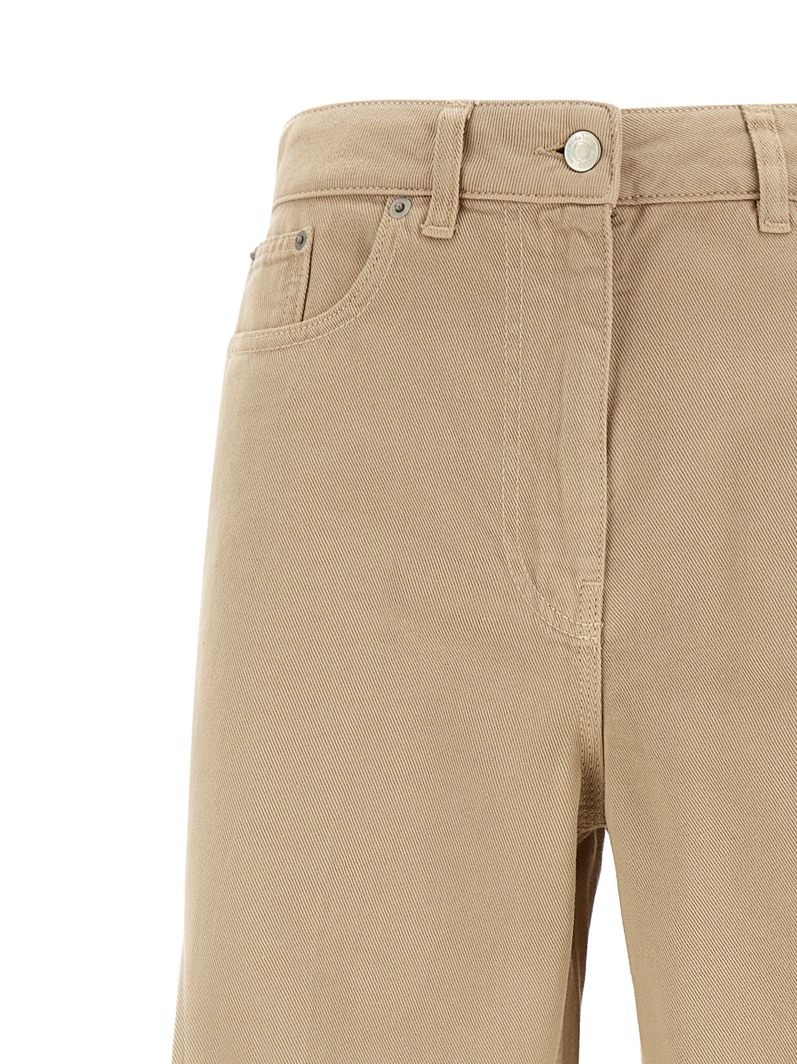 'Tilda' cotton drill trousers, loose and flared leg, medium waist, zip and front button closure, five pockets. Back logo tag.