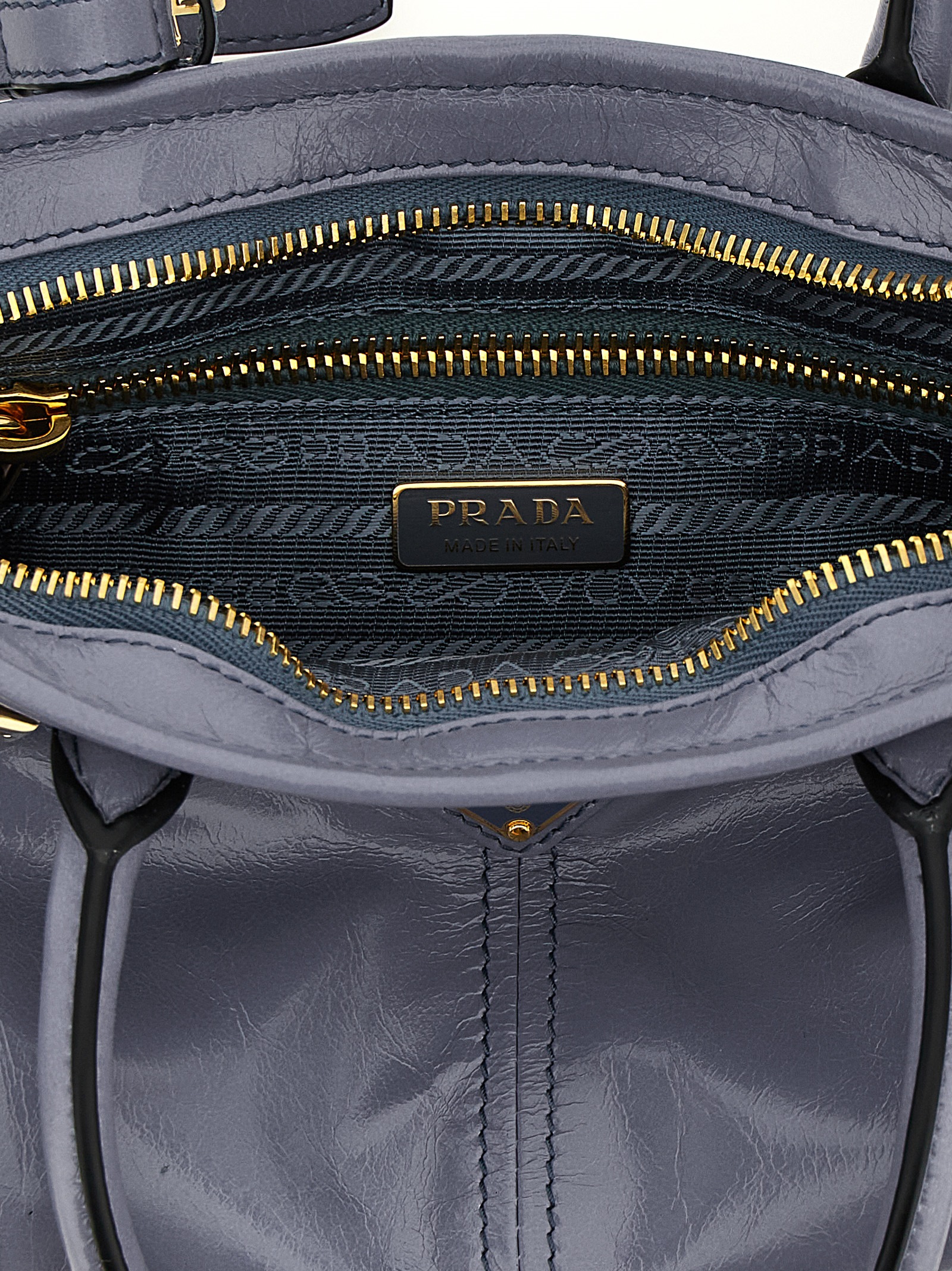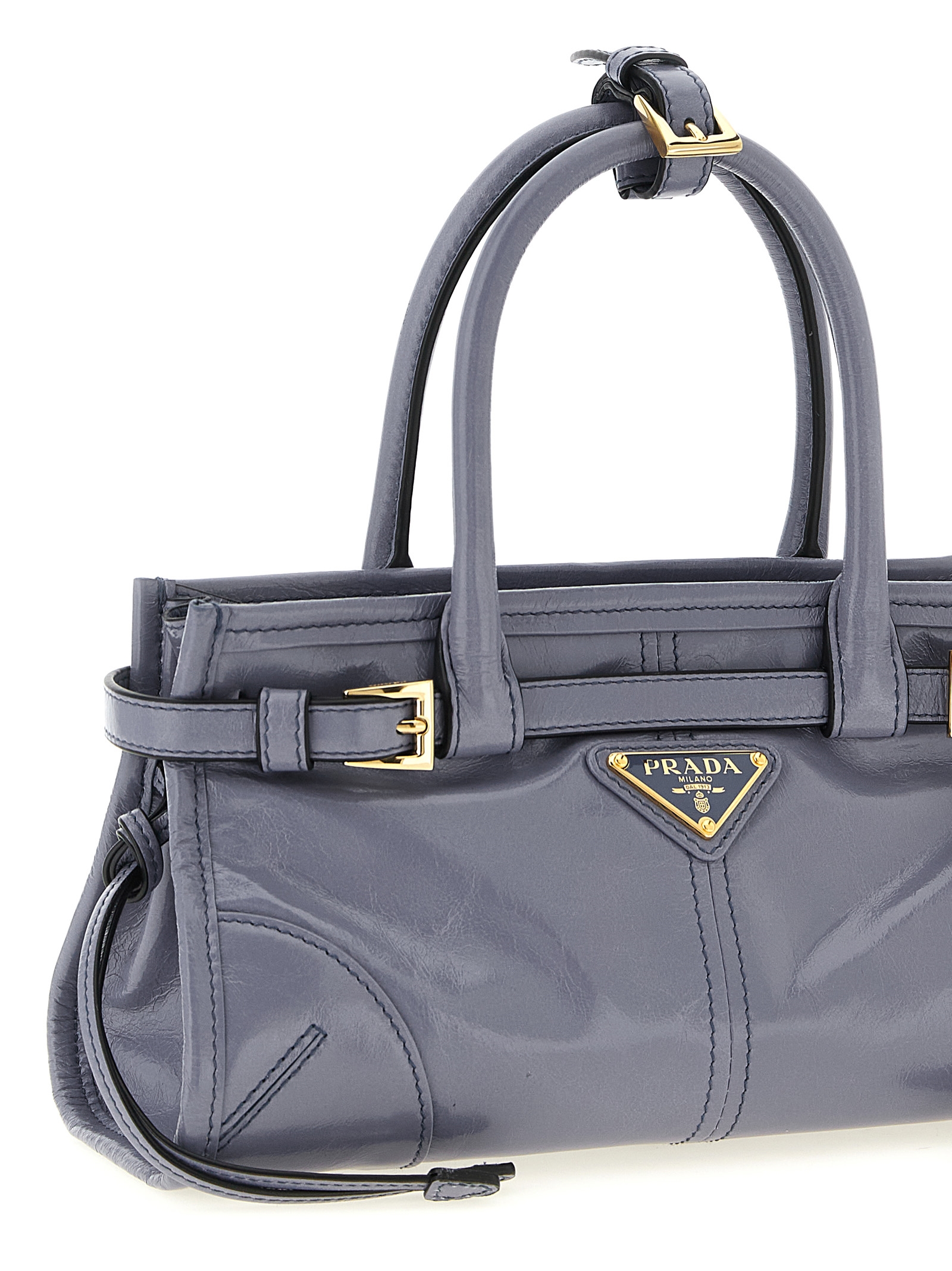 'Bonnie' mini leather handbag with brilliant finish, fixed leather handles, zip closure, adjustable and removable shoulder strap, strap with gold metal finish, enameled triangle front logo.