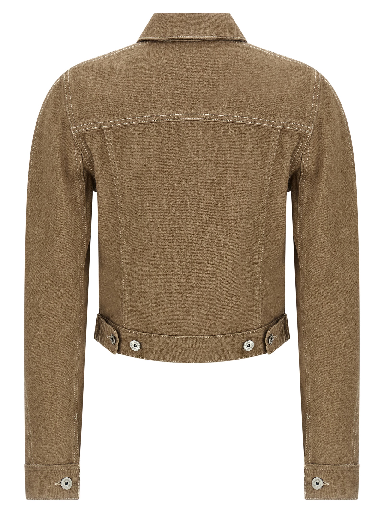 Workwear 'la veste ovalo cargo' cotton denim jacket with oval cut, pointed collar, front closure with hidden buttons, patch pocket with 'J' stitching detail, adjustable side tabs with buttons, long sleeves with cuffs and buttons.