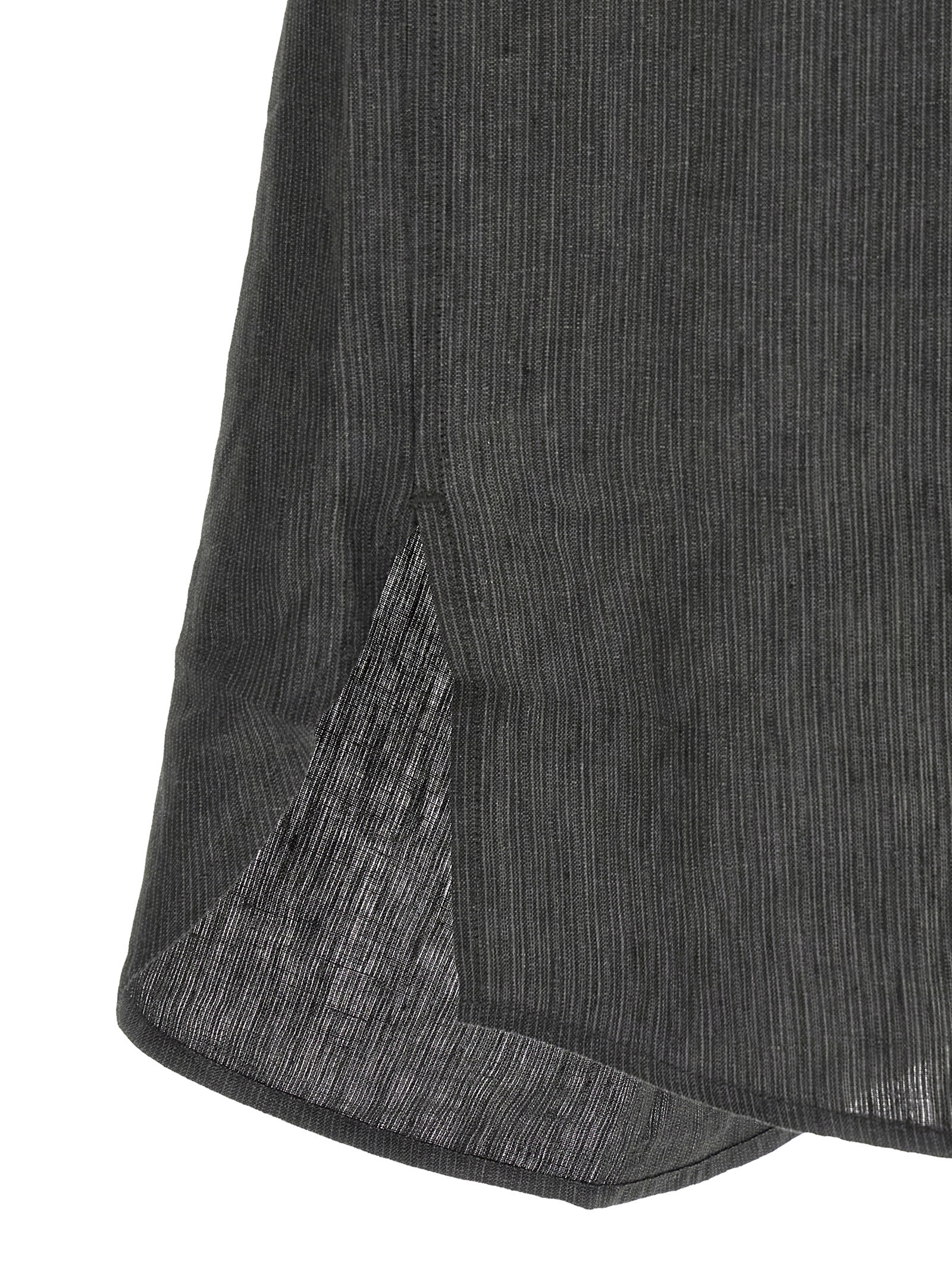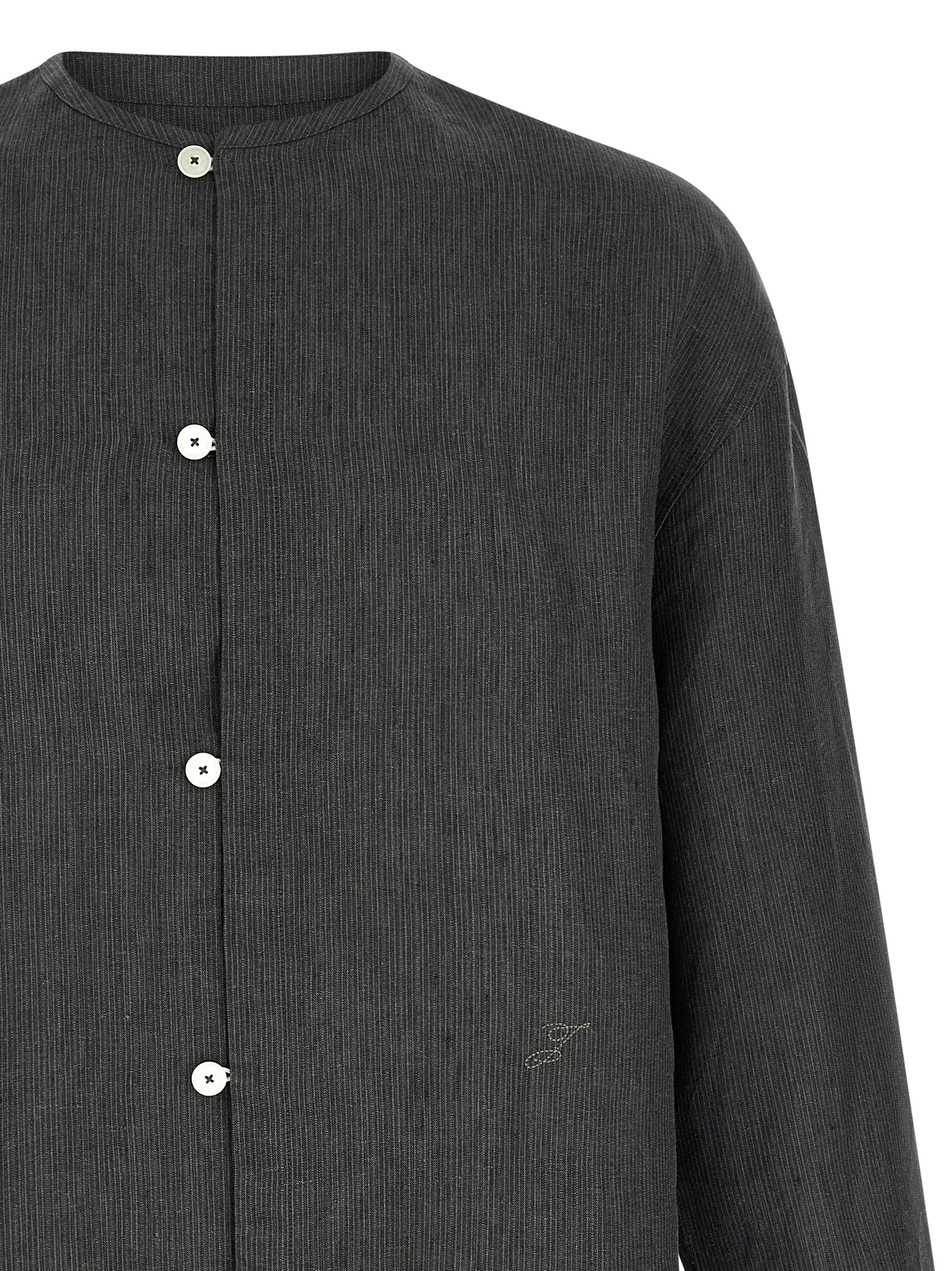 'La Chemise Pastro' micro-striped linen shirt, crew neck, logo embroidery and front button closure, long sleeves with cuffs and dropped shoulders, back rack with cannon pleats, rounded and asymmetrical hem.