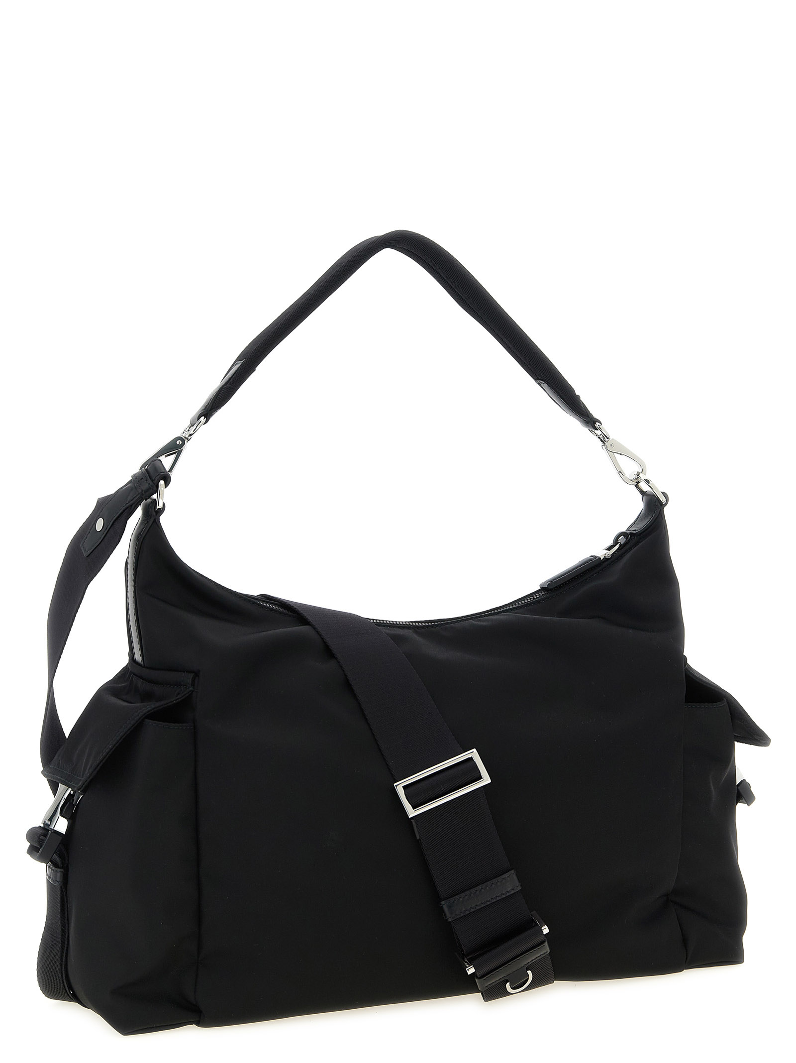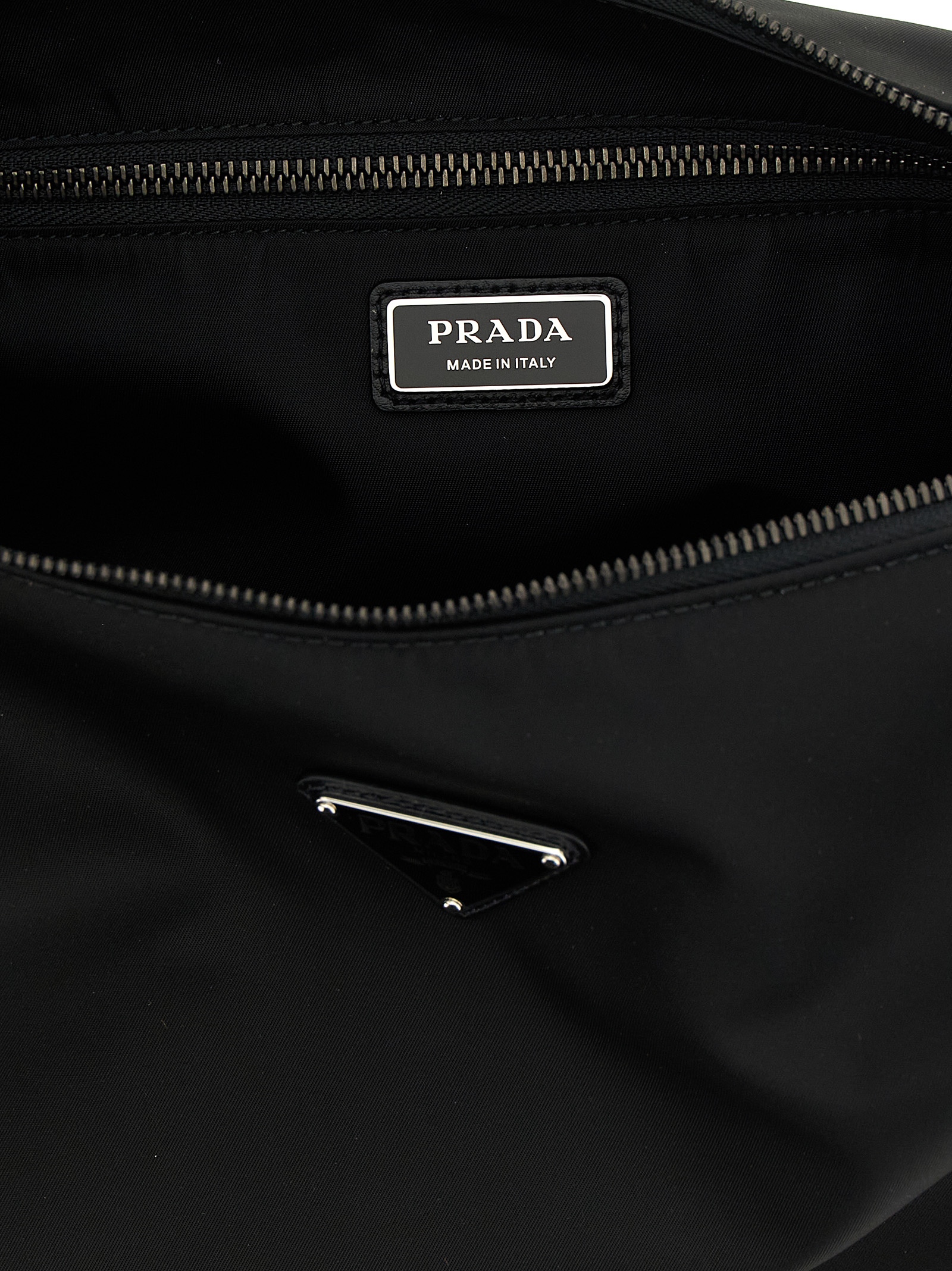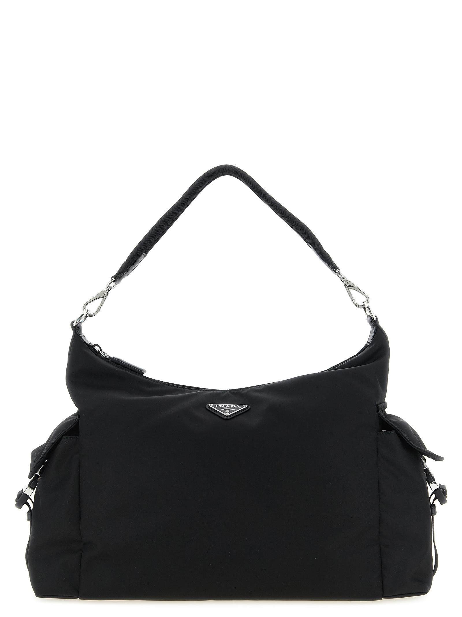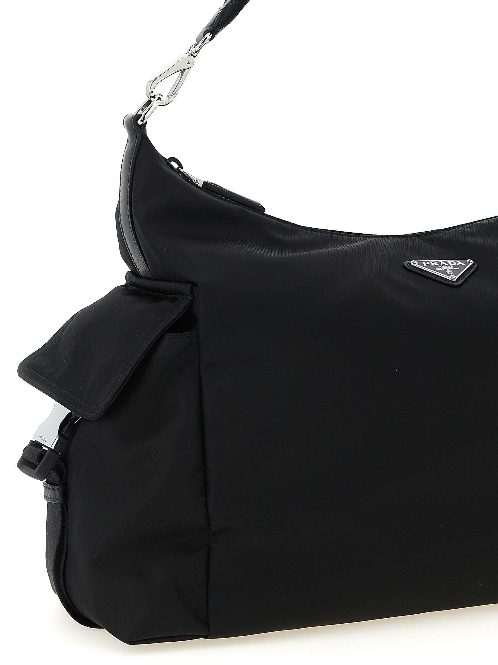 'Prada Explore' large shoulder bag in Re-Nylon and leather, multi-pocket design, top zip closure, front enameled metal triangle logo, side flap pockets, removable padded handle, Re-Nylon lining, adjustable and removable logo tape shoulder strap. SUSTAINABLE: This product is made with Re-Nylon, a regenerated yarn made from recycled and purified plastic collected in oceans, fishery nets and textile fibers.