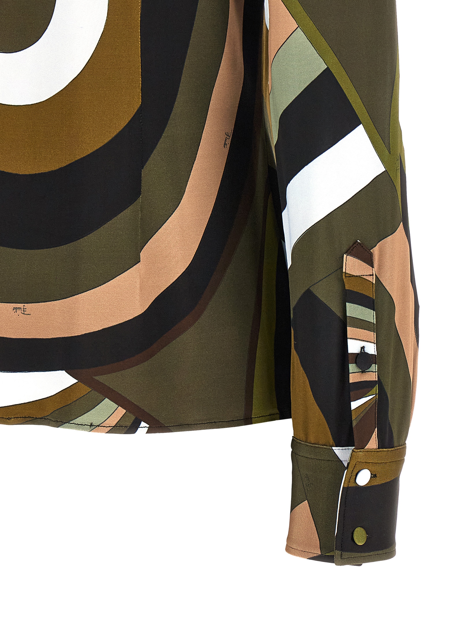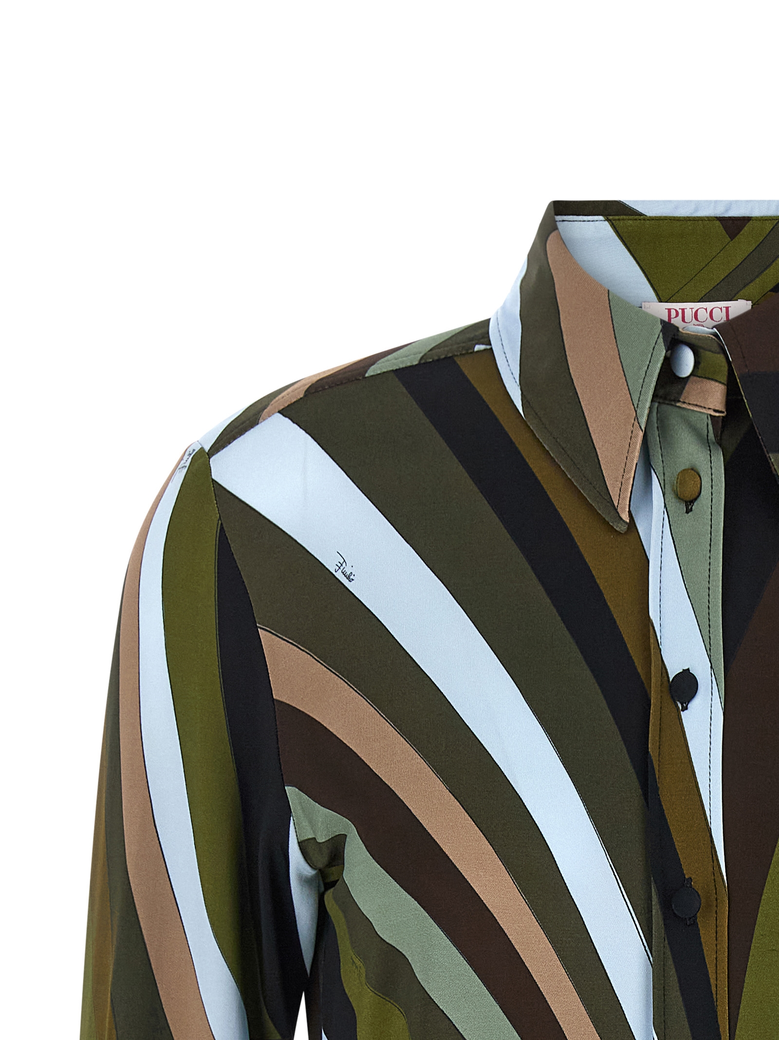 All-over stretch viscose shirt with all-over 'Iride' print, pointed collar, front covered button closure, long cuffed sleeves. This product, like many other Pucci items, is made with an all-over print that falls differently on each garment; The product shipped may differ from the one in the picture.