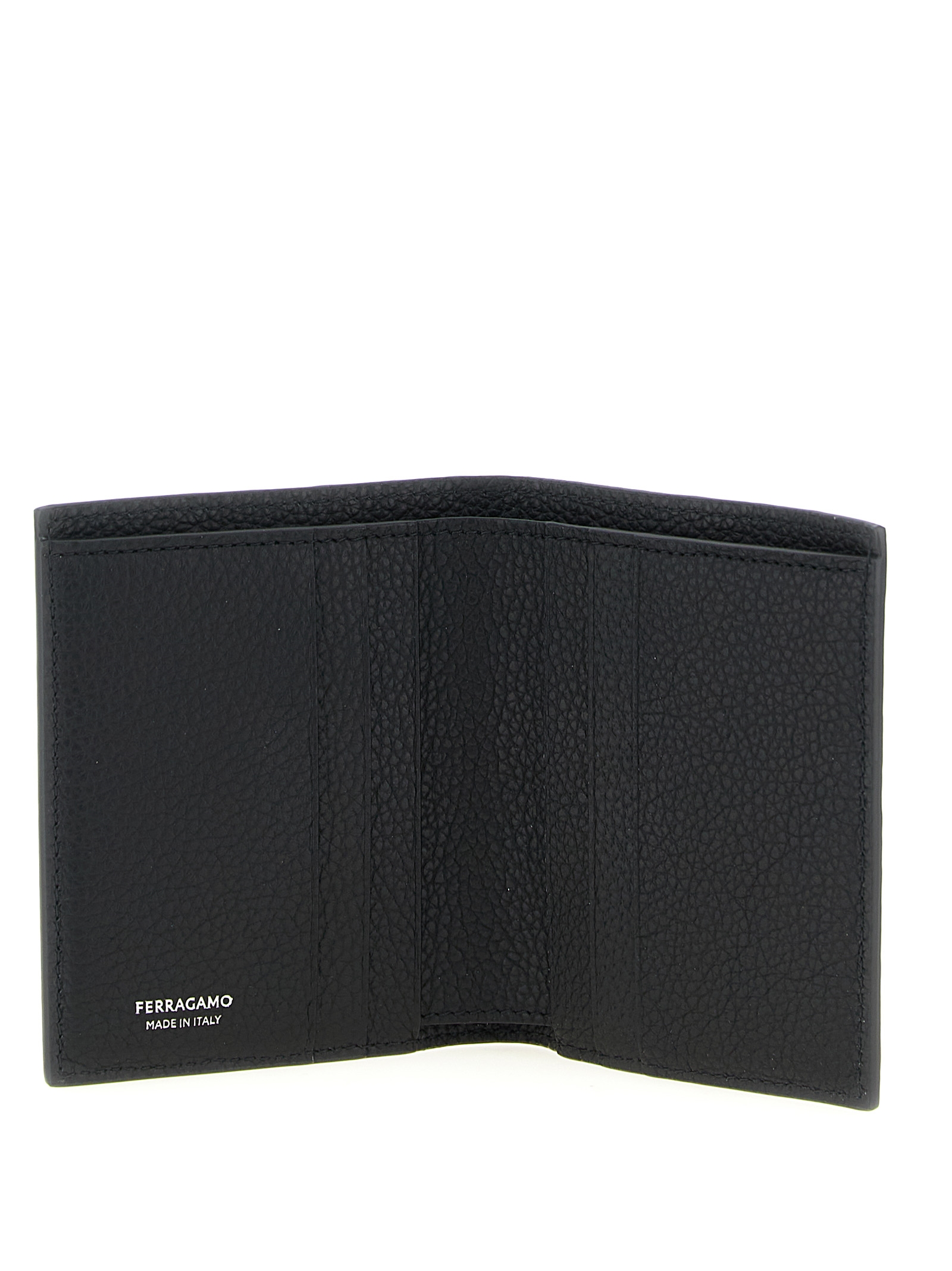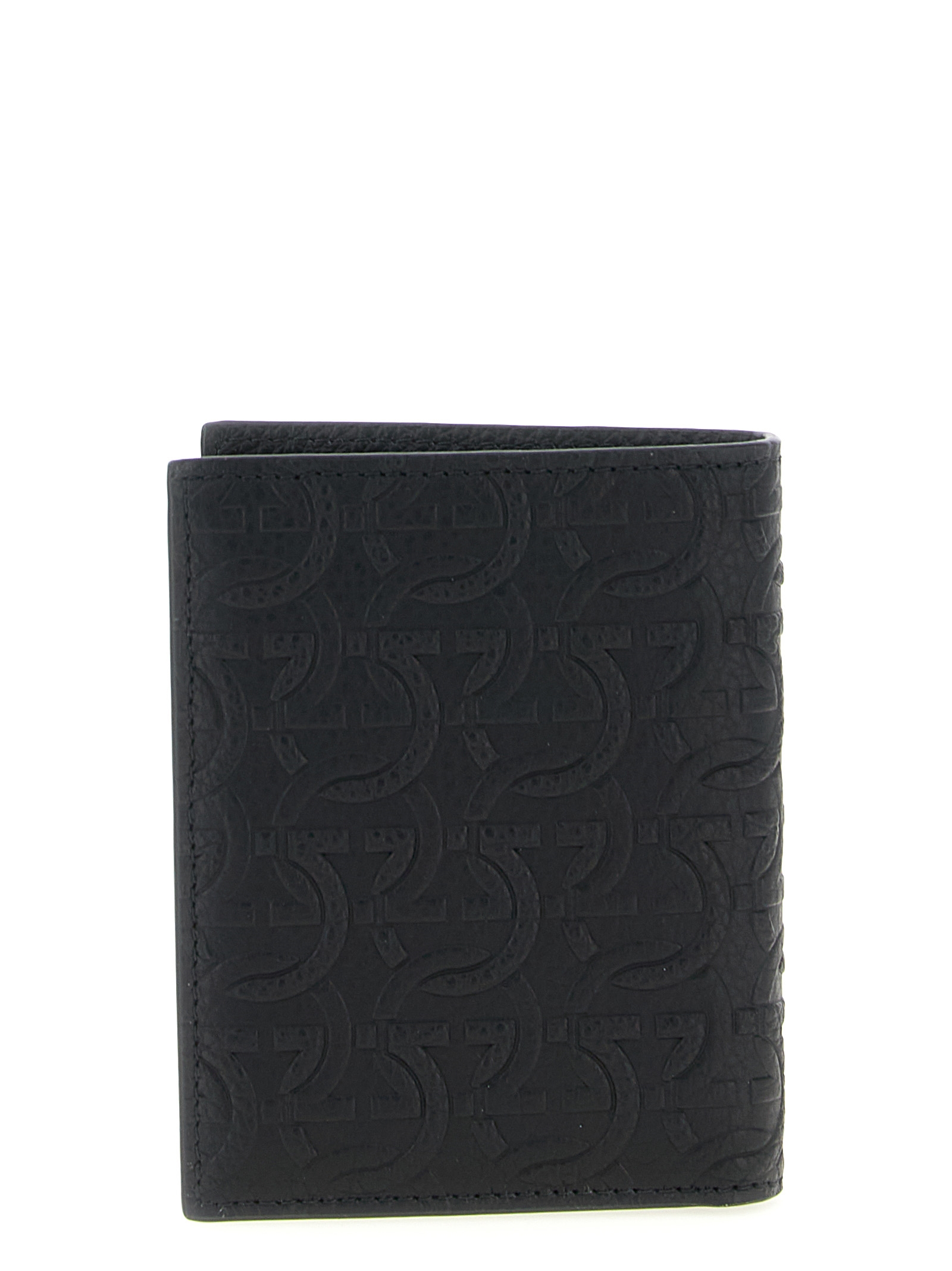 Hammered calf leather wallet with embossed embossed 'Gancini' pattern, metal 'Gancini' logo on the front, and a book opening.