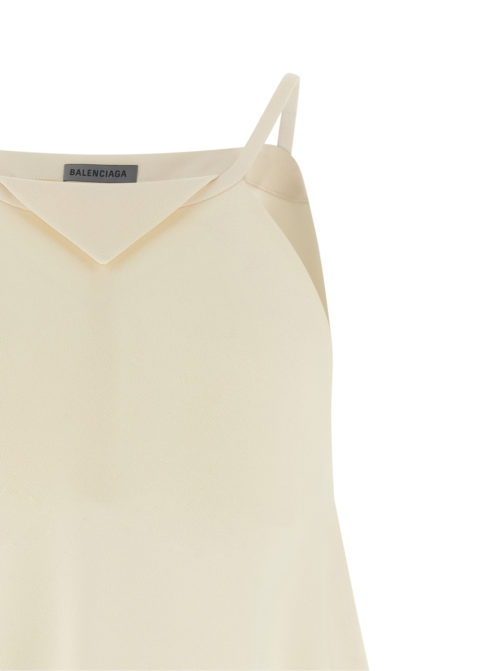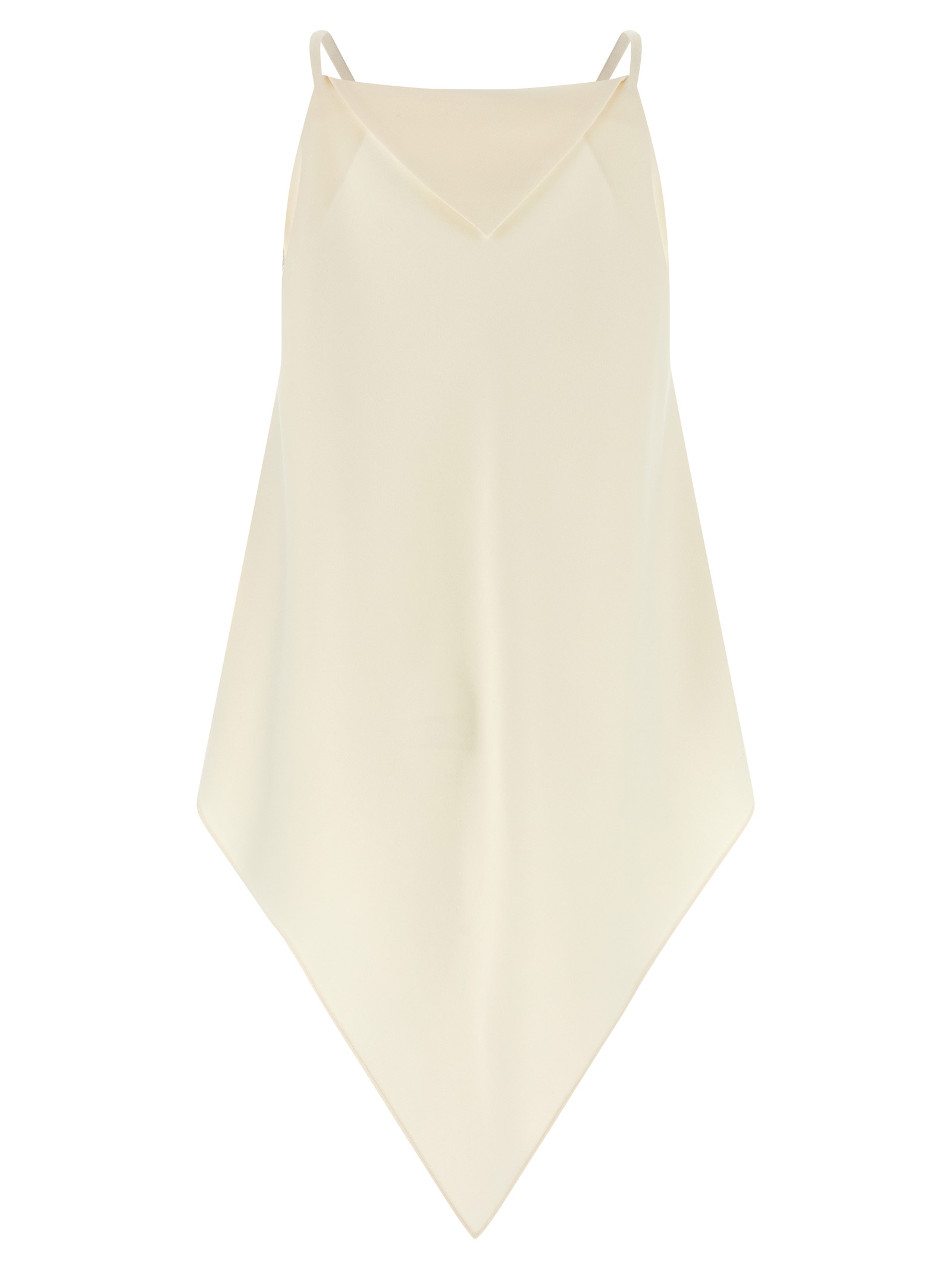'A Sciarpa' wool and silk crêpe top with pointed draped panel construction, square neckline with pointed insert at the front and back, thin straps, single seam on each side, asymmetrical hem.