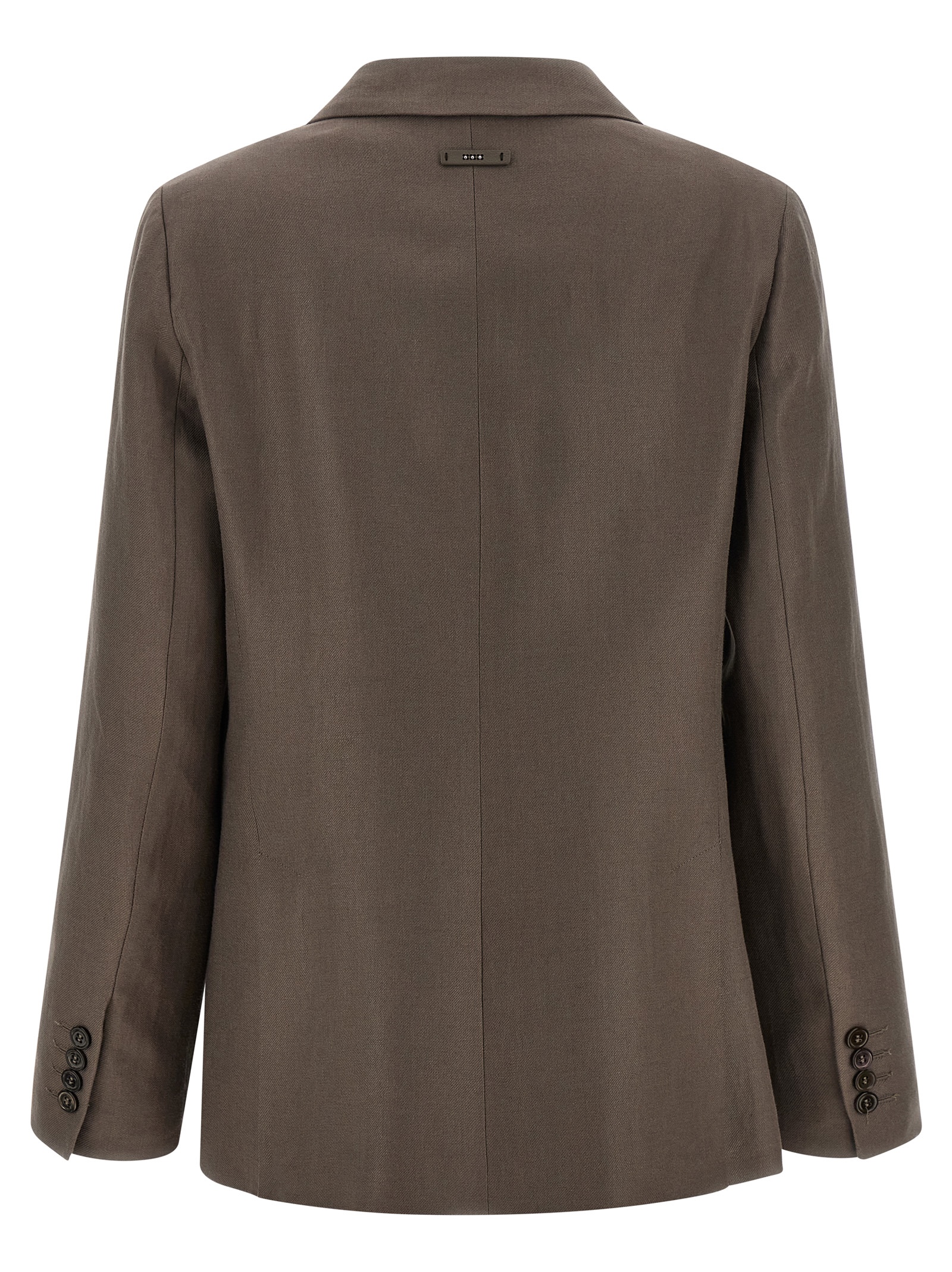 Double-breasted linen blazer with front horn button closure, tone-on-tone satin peak lapels, pocket with metal detail, patch pockets, structured shoulder strap, back vents, viscose lining.