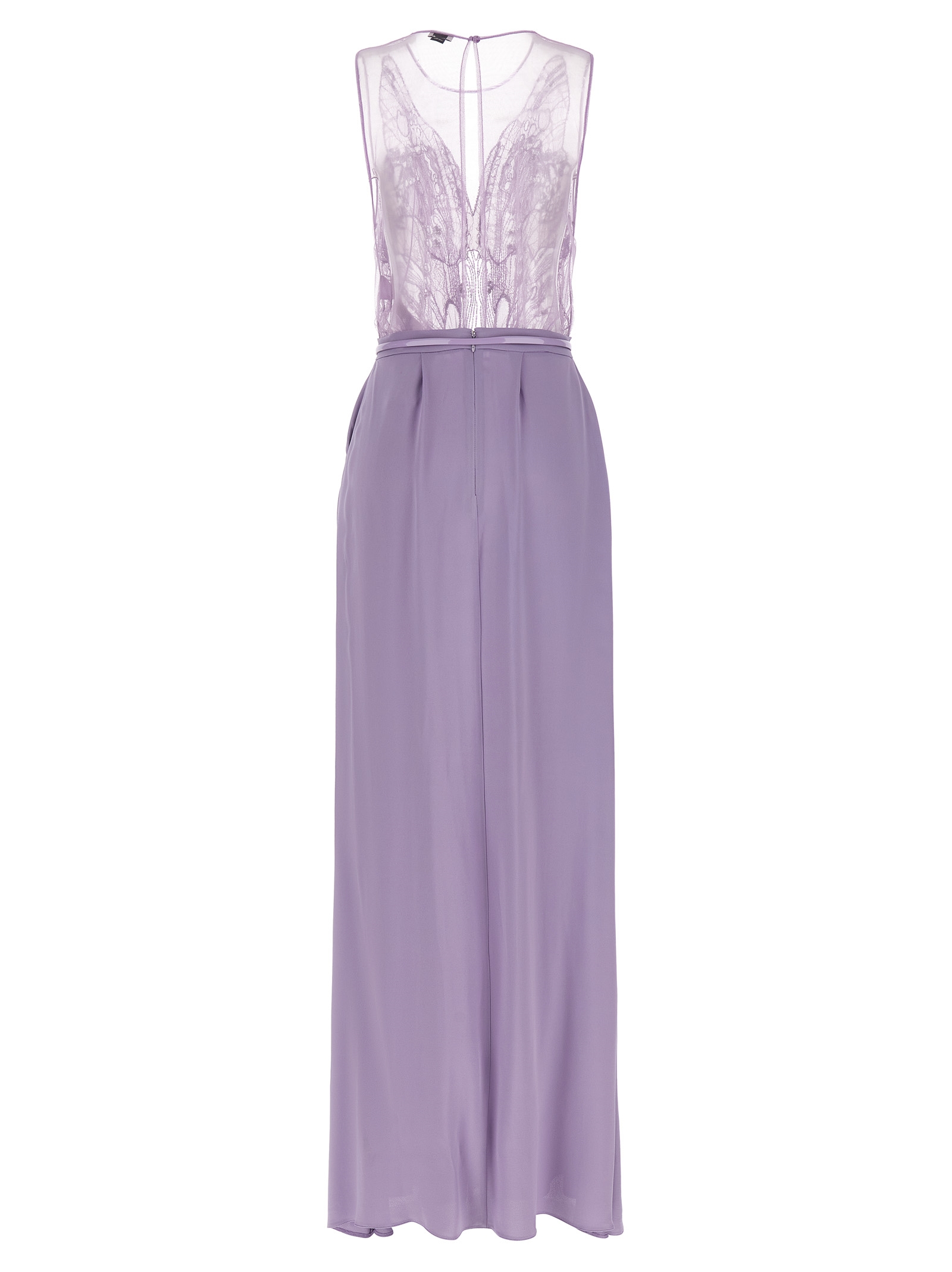 'Red Carpet' long dress consisting of removable tulle top embroidered with sequins and micro-crystals dégradé effect on the front, crew neck with back button closure and wide teardrop cut-out, sleeveless and wide georgette skirt, wheel model with front pinces, flared silhouette, pockets, back zip closure, removable vinyl matching belt.