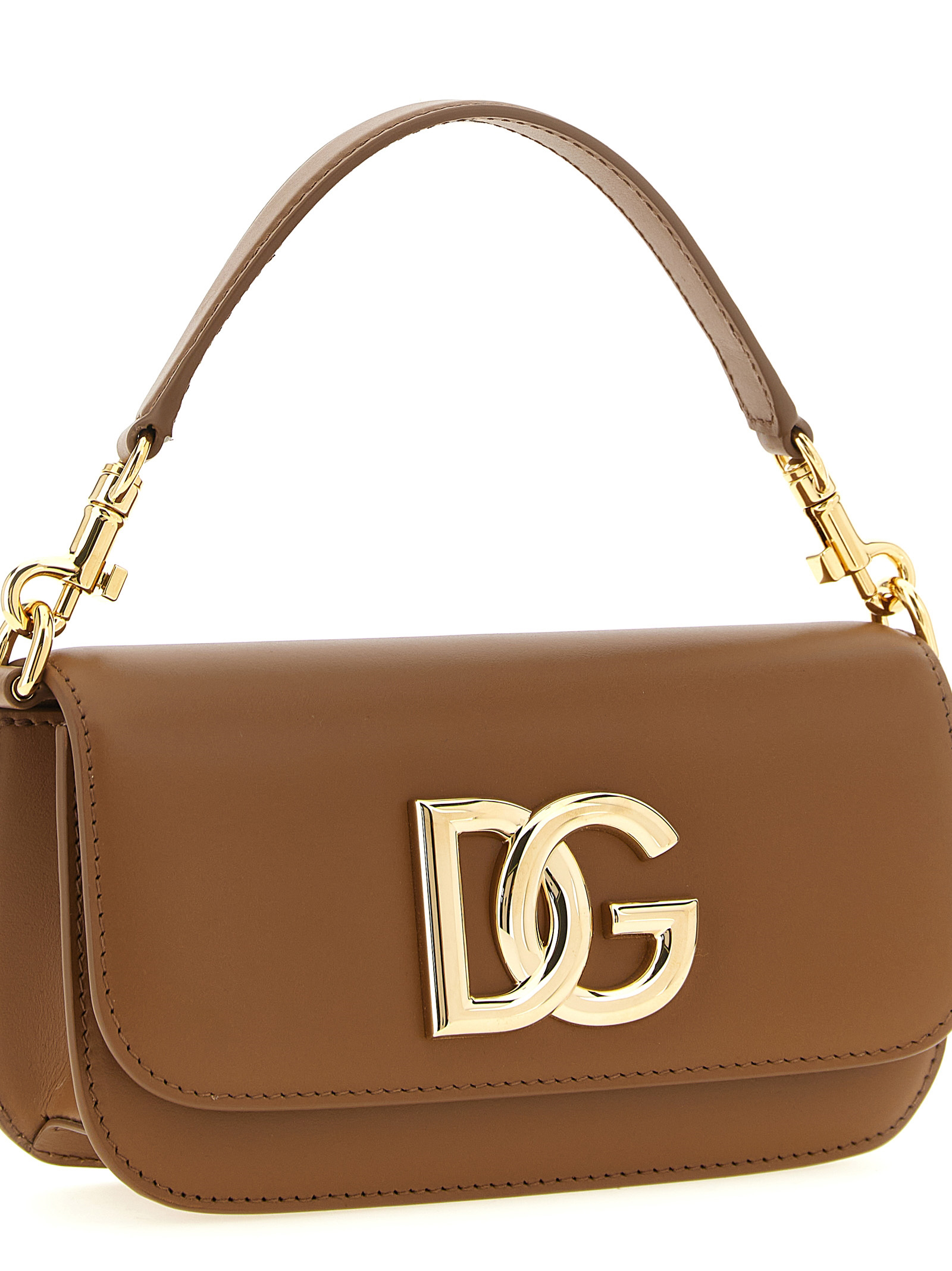 '3.5' calf leather handbag, magnetic flap closure with front metal logo, removable handle, removable chain shoulder strap.