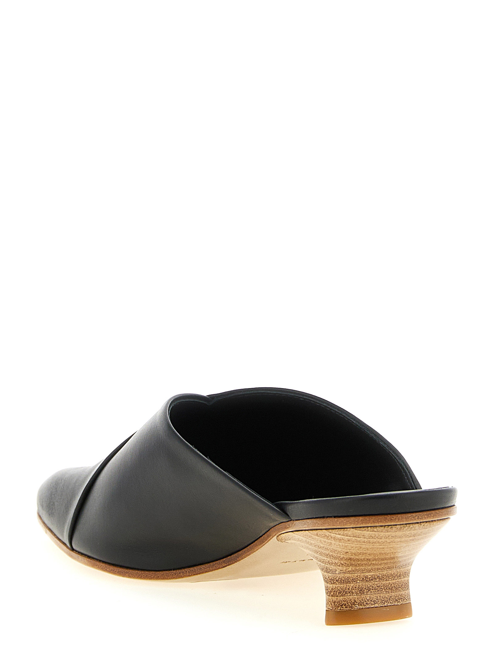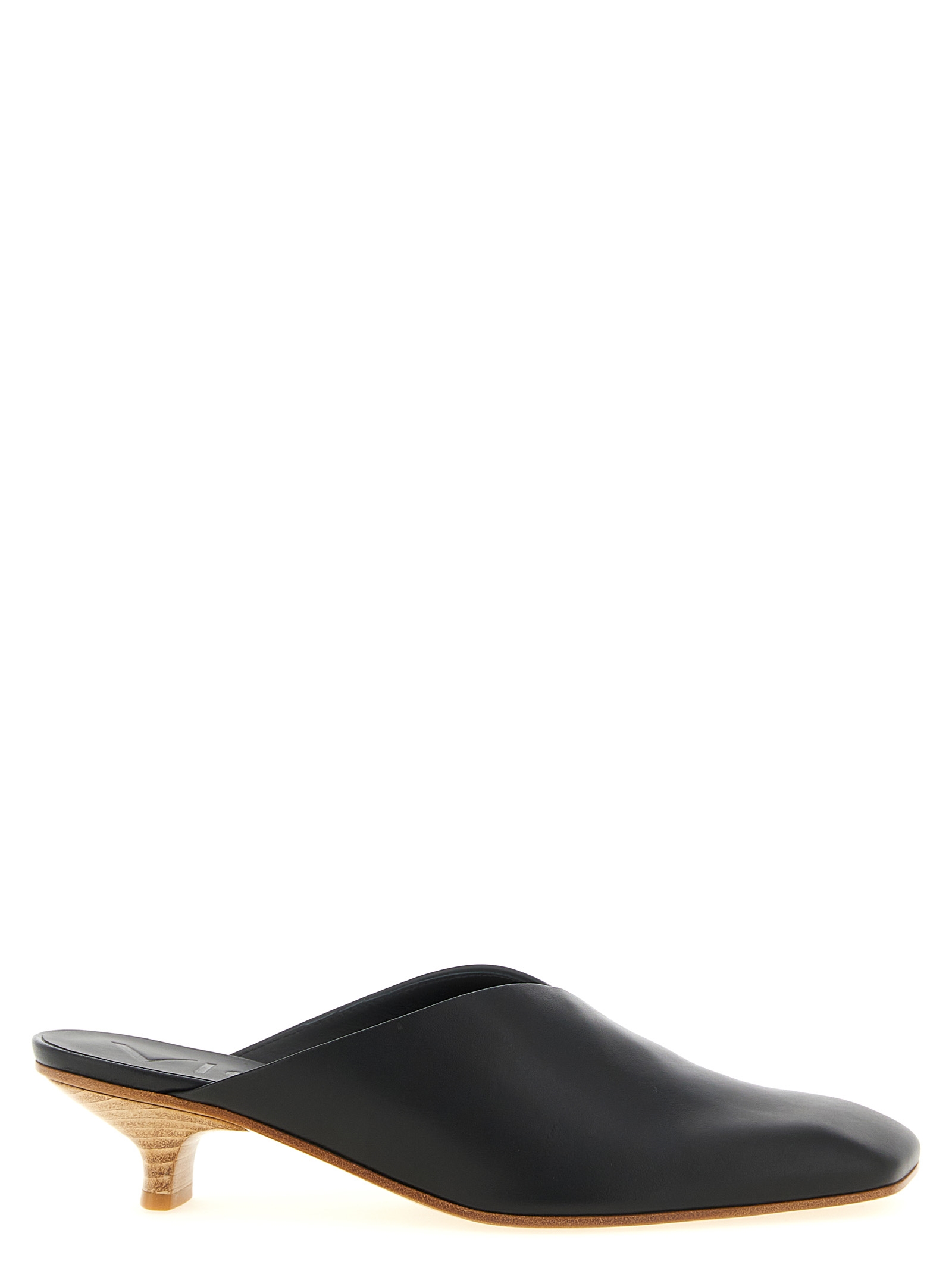 'Lavenue' leather sabots with square toe, crossed bands, wooden spool heel, leather sole.