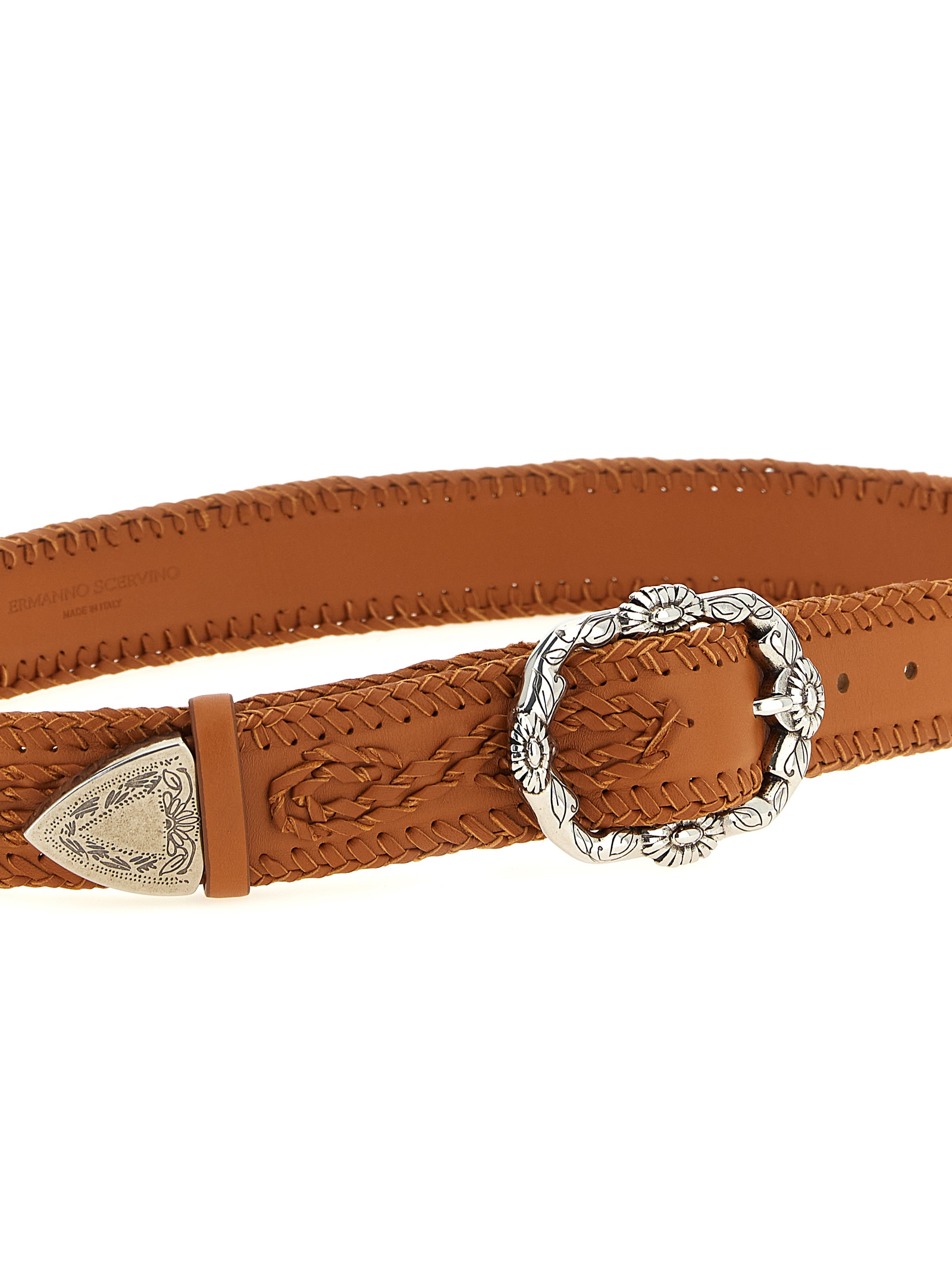 Smooth calf leather belt of the highest quality with 'Majaro' embroidery in tone-on-tone nappa leather tape, lasered toe cap and metal daisies buckle.