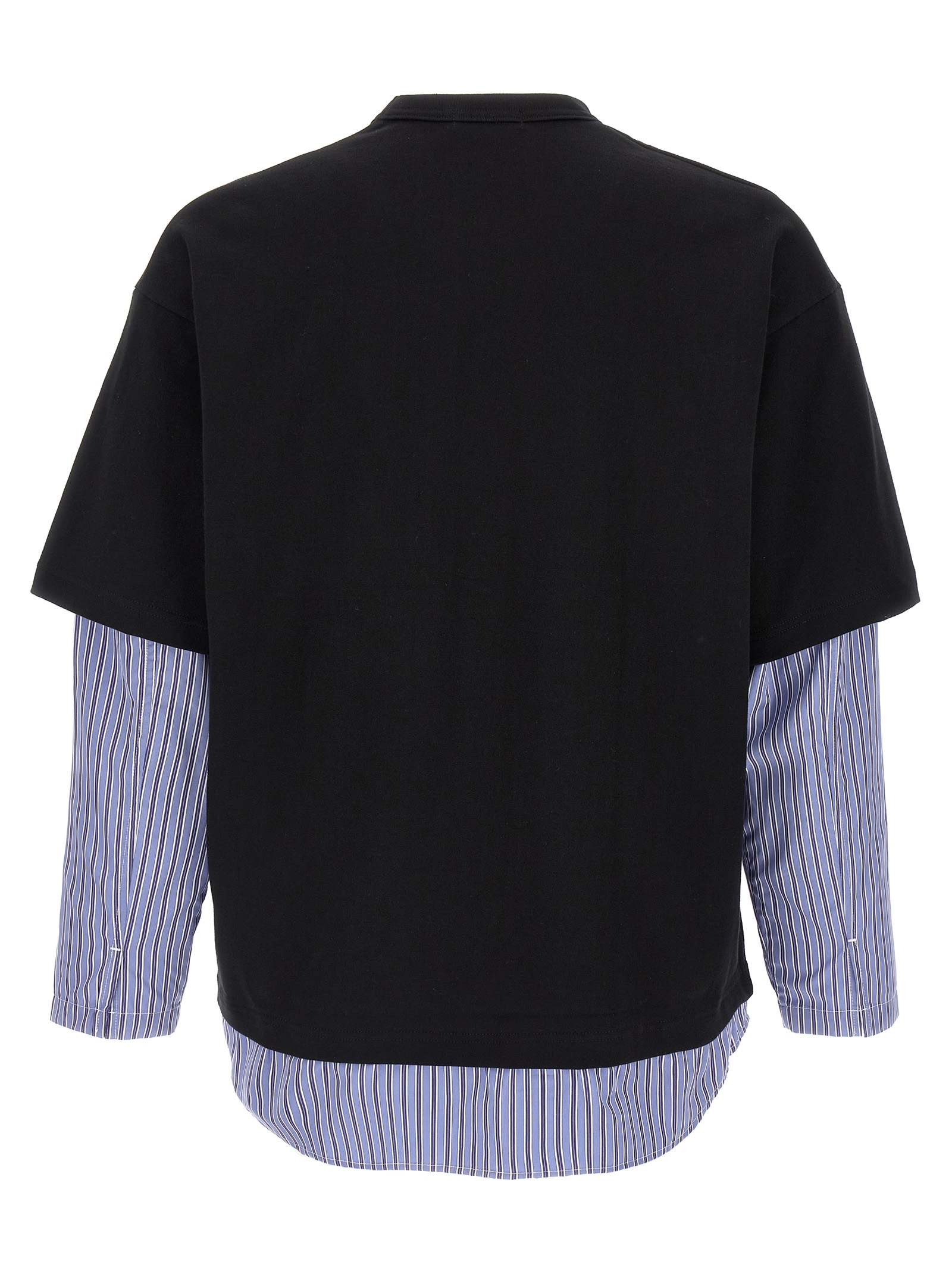 Heavy cotton t-shirt with shirt inserts in contrasting striped cotton poplin, crew neck, chest pocket, long sleeves with slit on the sleeve hem and dropped shoulders, rounded hem.