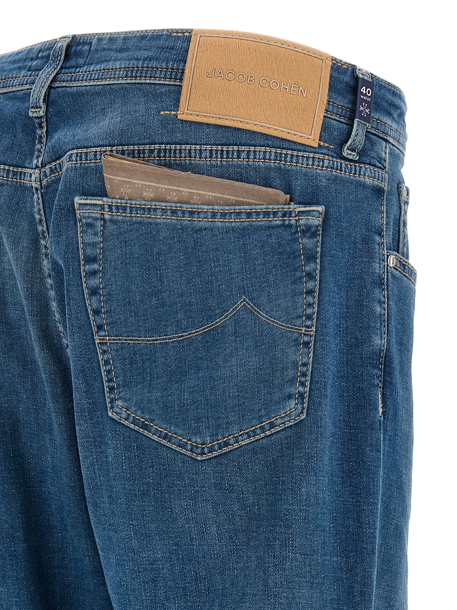 'Bard' stone-washed cotton denim jeans with contrast stitching, mid waist, straight leg, button closure, five pockets with tone-on-tone logo embroidery on the front, back logo tag. Supplied with printed clutch bag and wire spool.