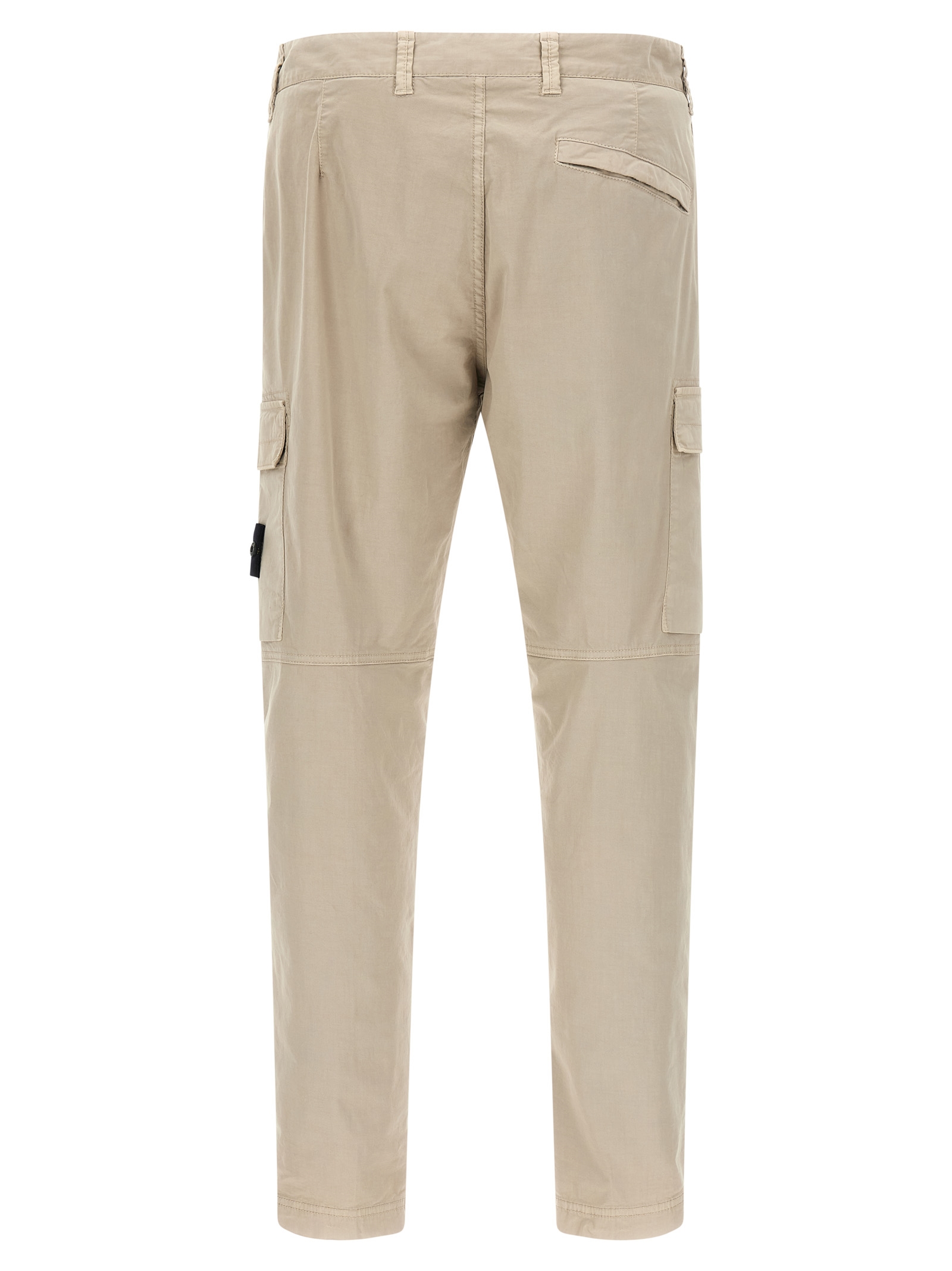 '3100032' trousers in garment-dyed stretch cotton twill, cargo style with side pockets and logo badge, straight leg with shaped knees, zip and front button closure, reinforced inner waist with contrast lining, pockets.