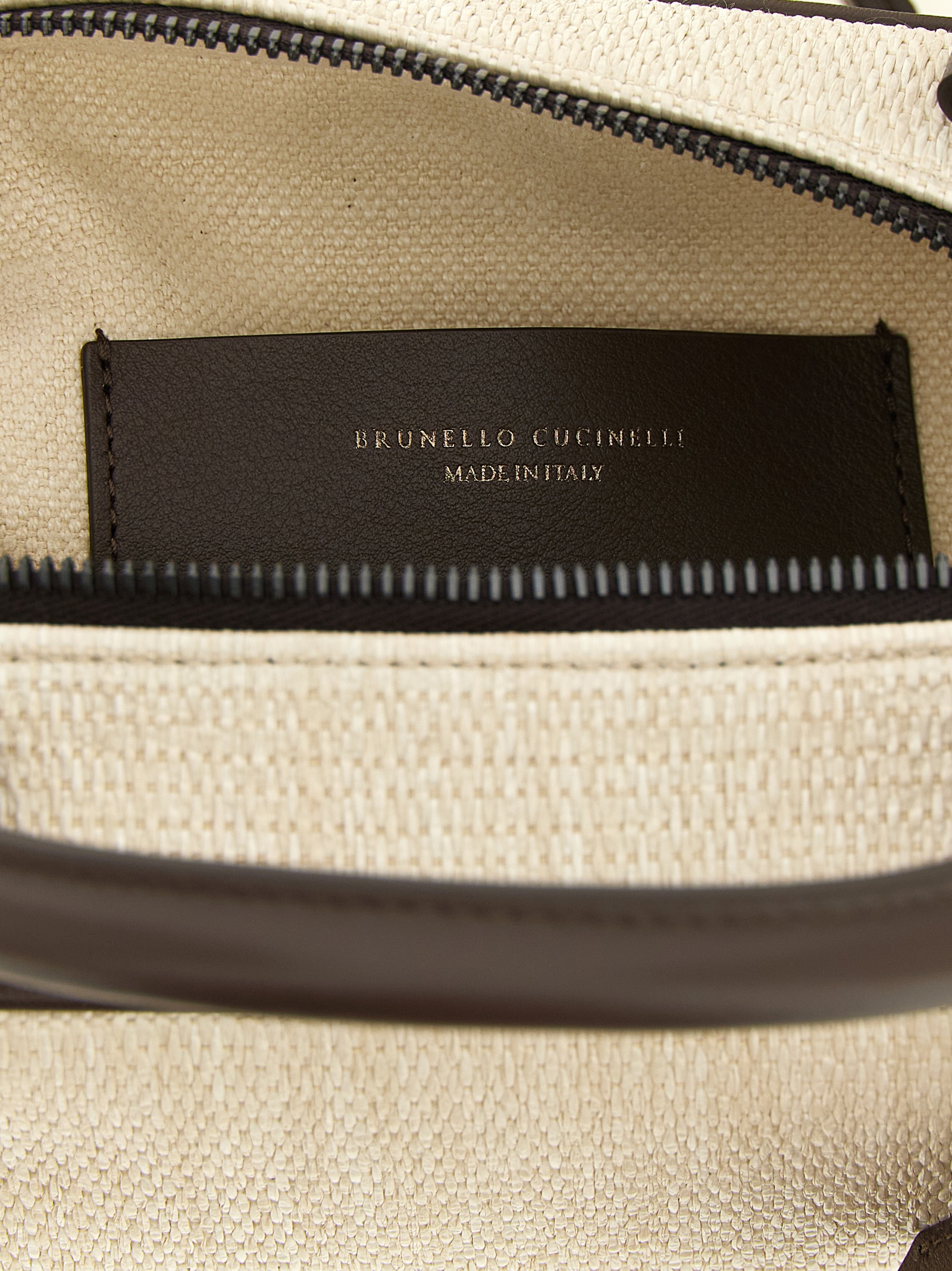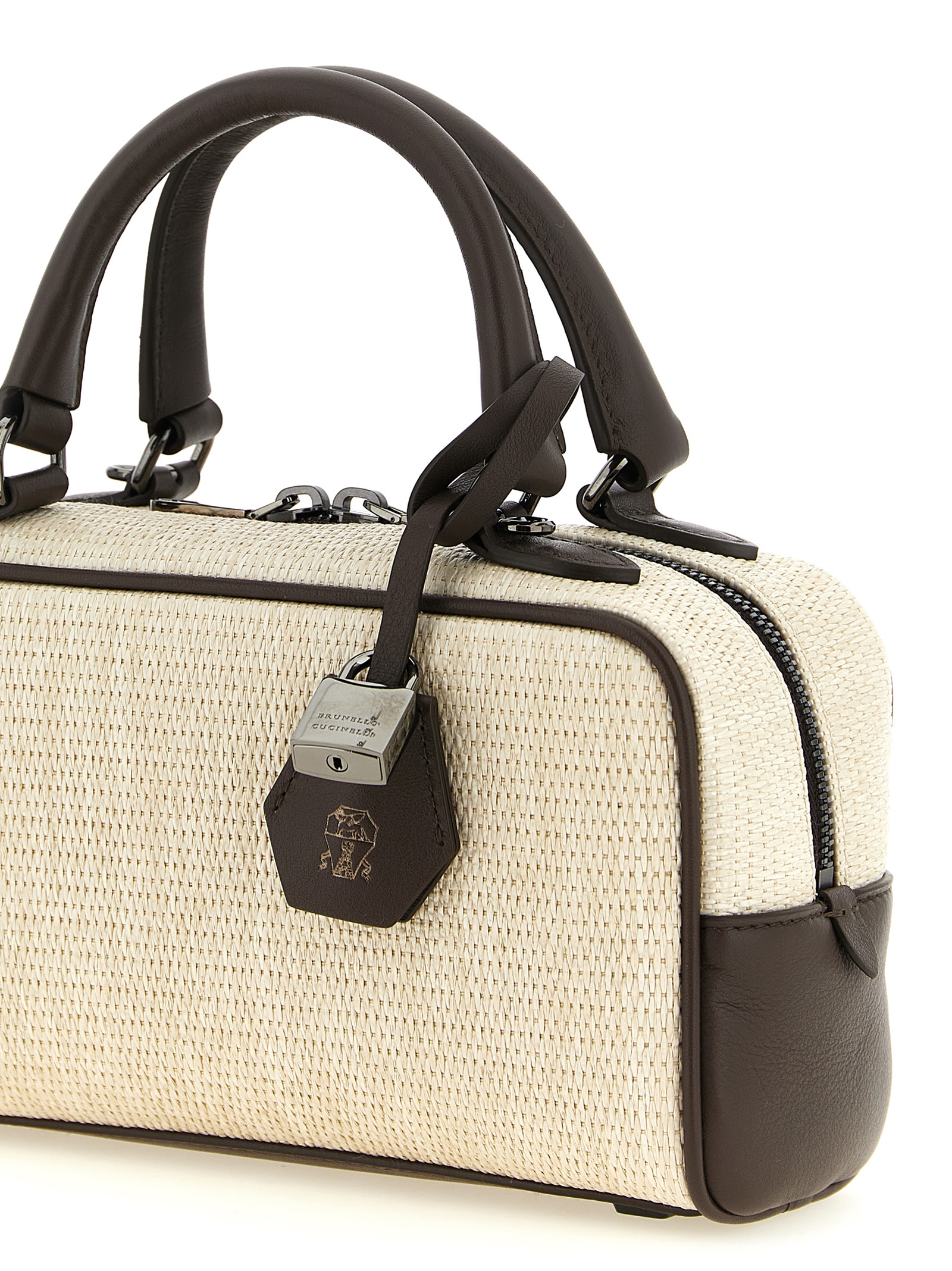 Small 'Boston Explorer' handbag in techno raffia with contrast leather details, double fixed tubular handle, top zip closure, rigid base with metal feet, adjustable and removable shoulder strap, keyring with removable metal padlock. Handcrafted product, any imperfections are to be considered characteristics of uniqueness.