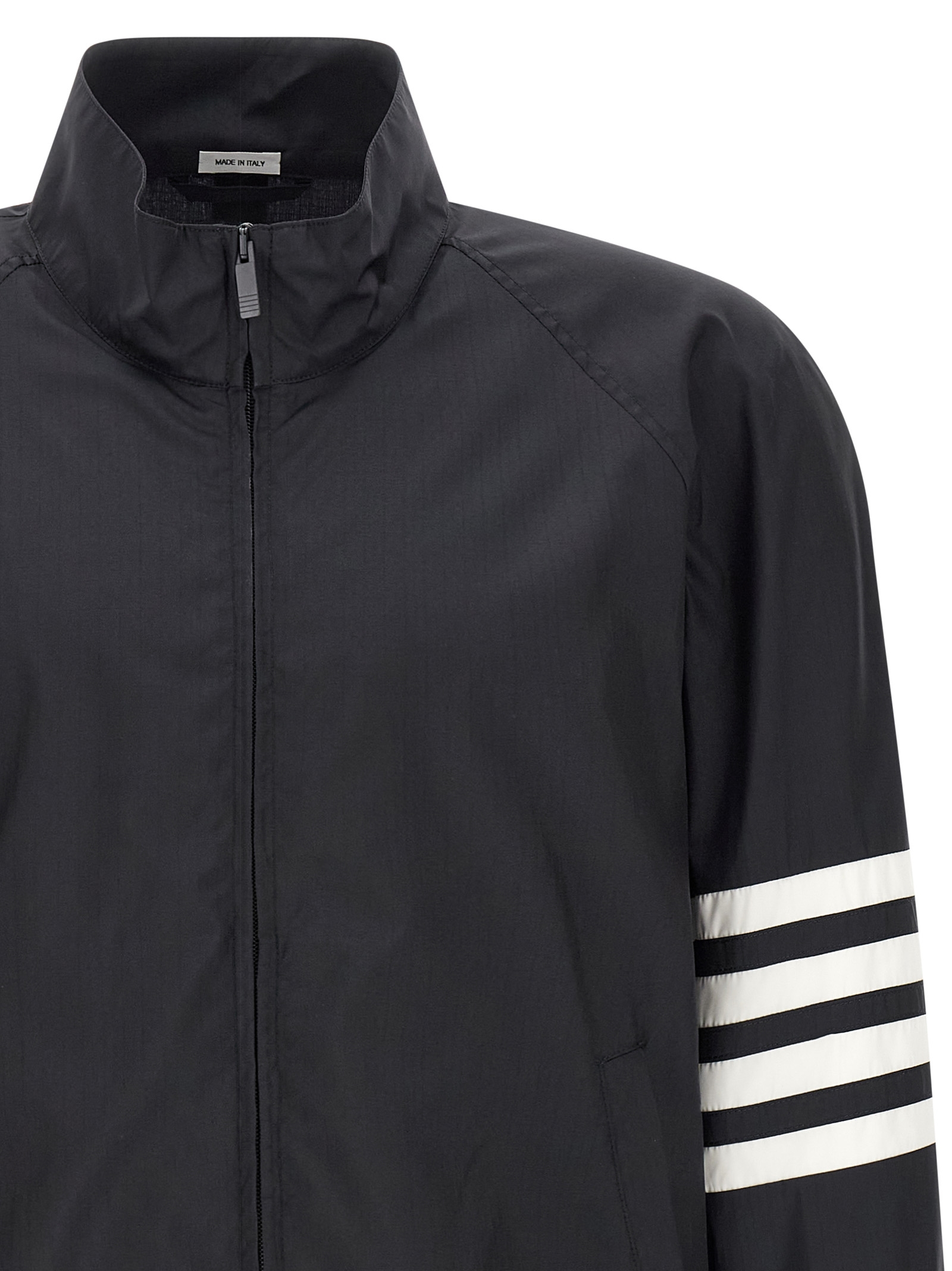 Shiny ripstop fabric jacket, unlined, high neck, front zip closure, pockets, long raglan sleeves with '4Bar' detail and elastic cuffs, elastic on the hem.