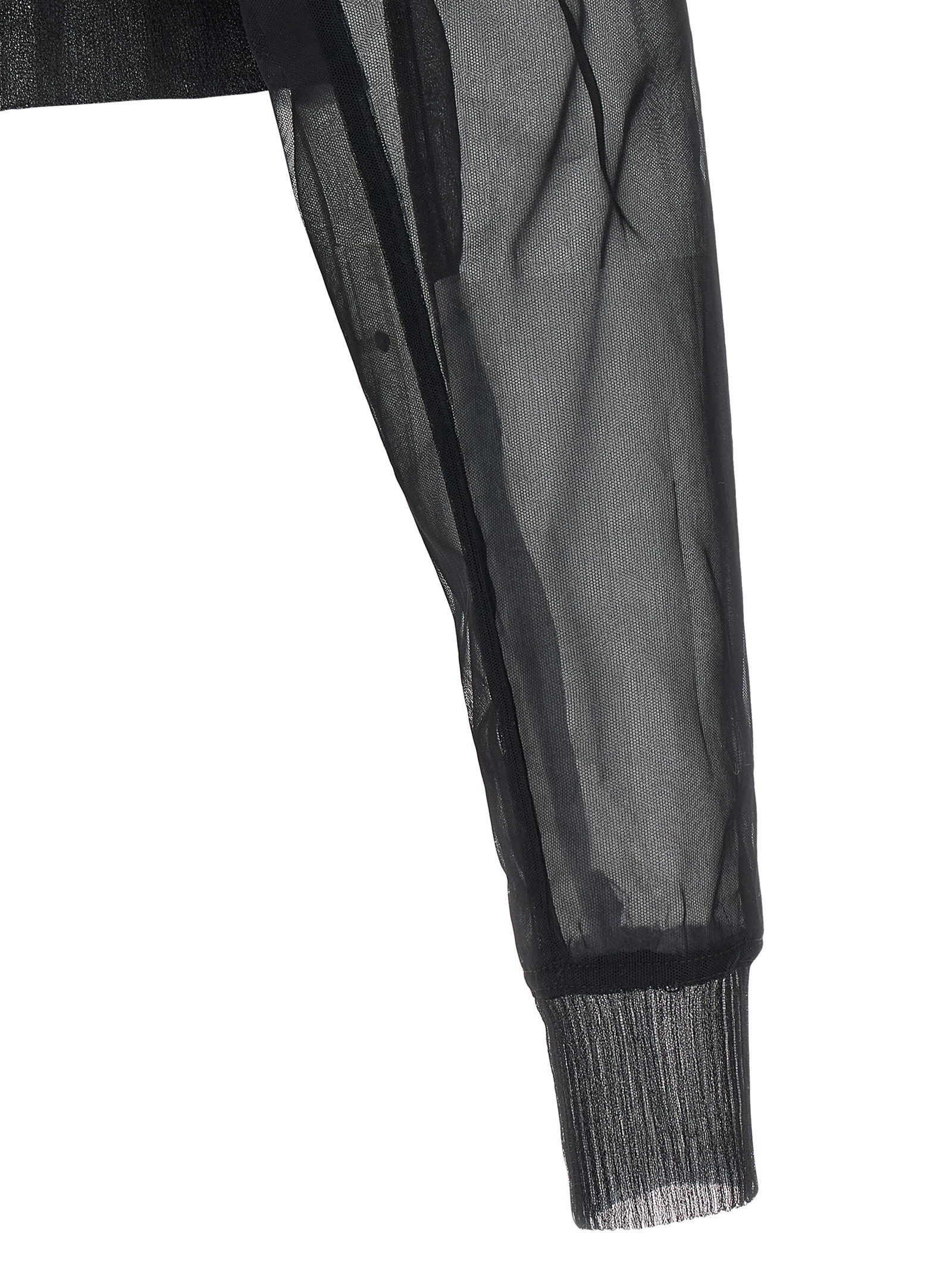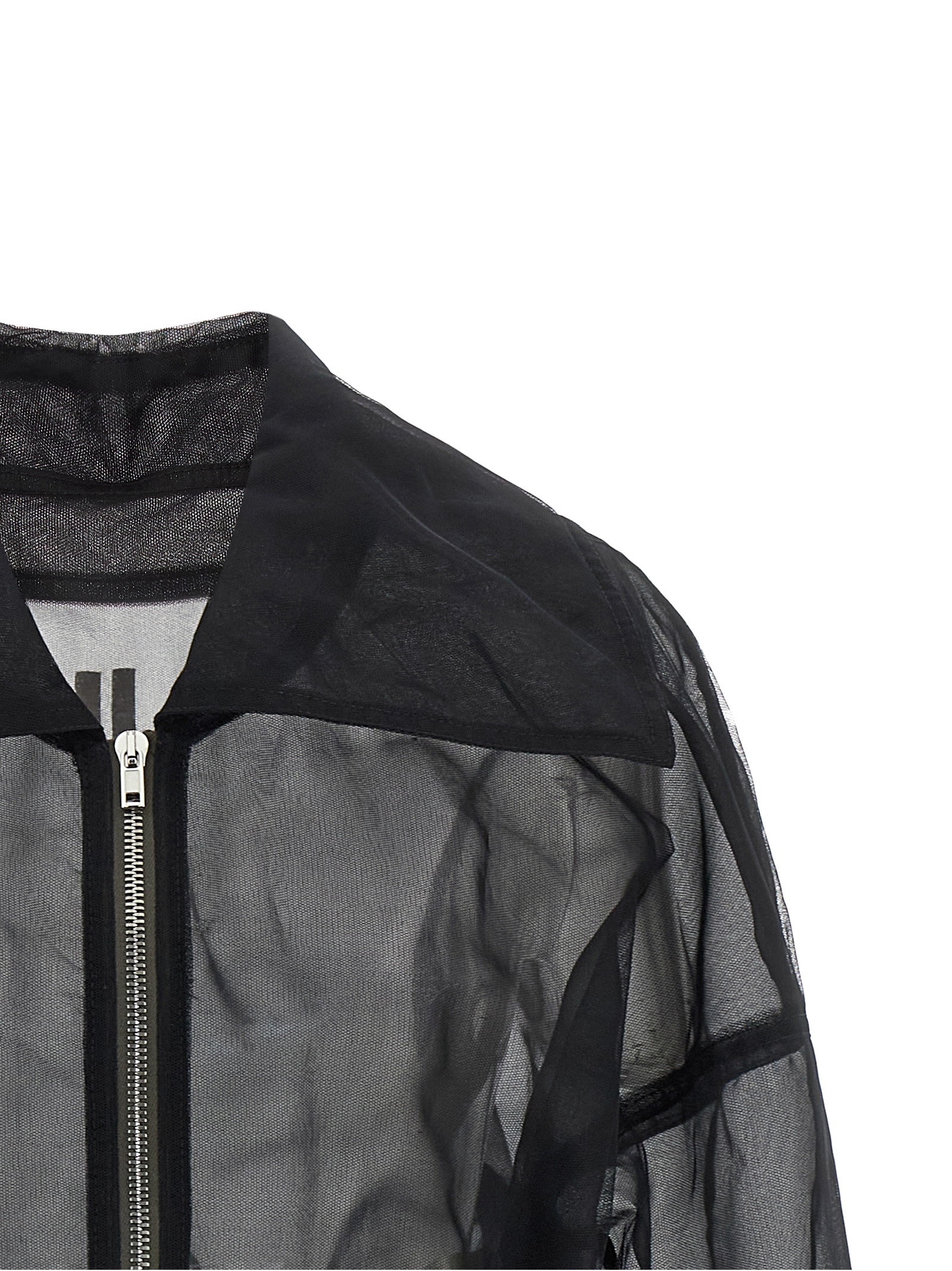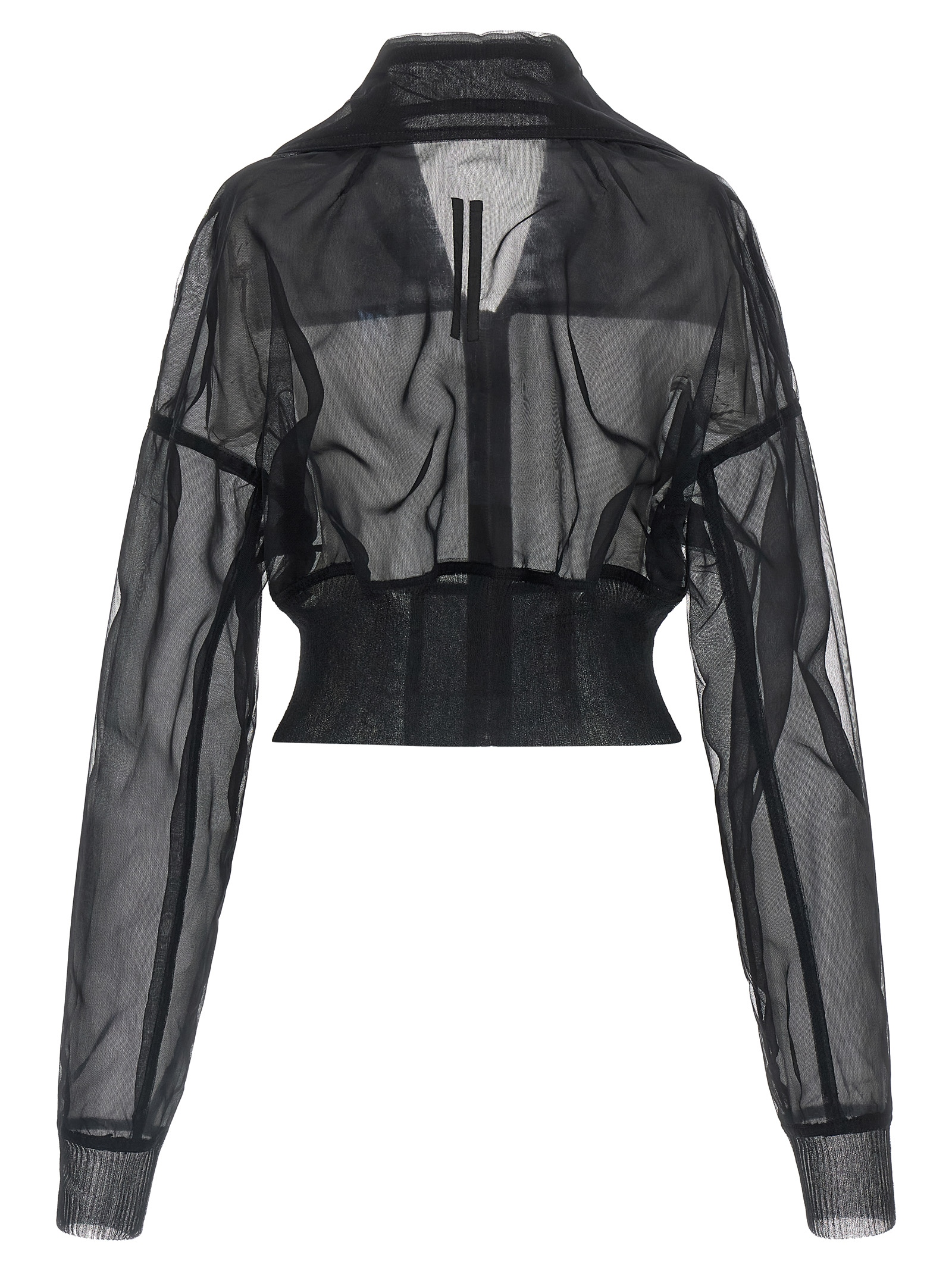 'Dracucollar cropped' bomber jacket in semi-transparent doubled tulle, short model with maxi elasticized knit hem on the hem, front closure with metal zip, maxi pointed collar, wide maiches, long with cuffs on the bottom.