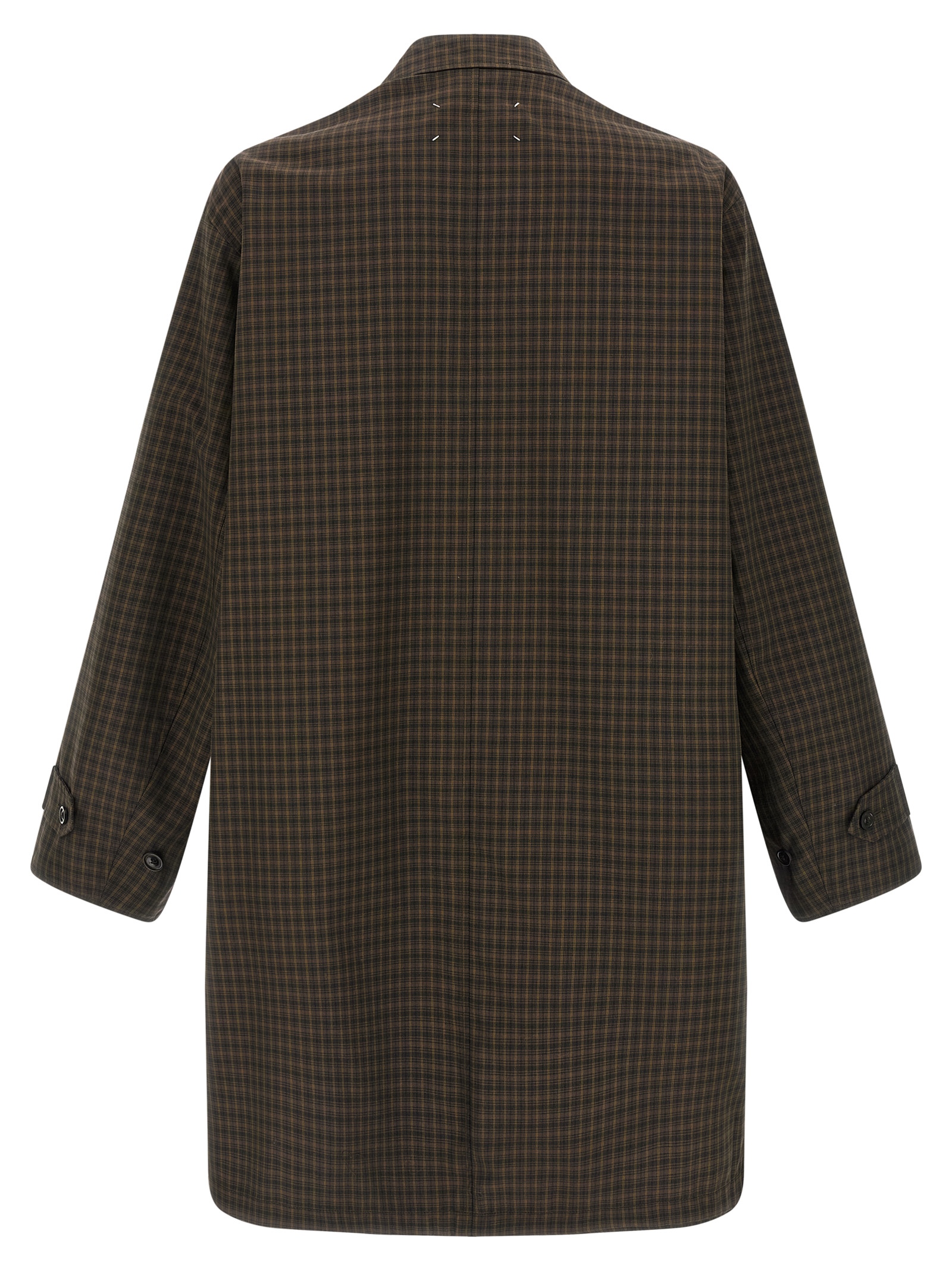 Reversible trench coat in iridescent taffeta solid color and check pattern, shirt collar, front button closure, pockets, long sleeves with adjustable cuffs and dropped shoulder, 'Four Stitches' at the back.