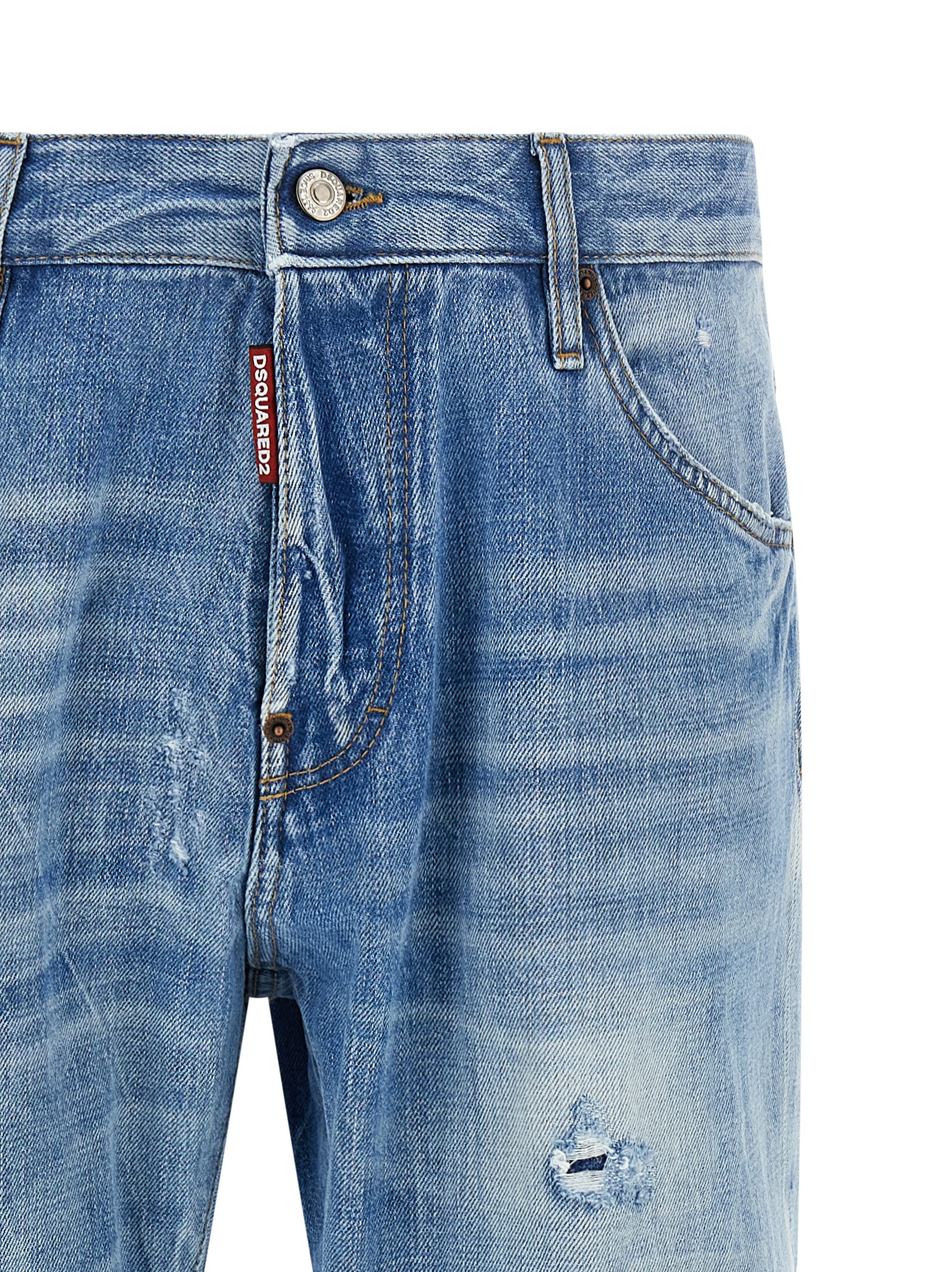Teddy' used-effect stone washed stretch cotton denim jeans with rips, patches and paint stains, low waist, front button closure, five pockets, straight leg, and back leather logo tag.