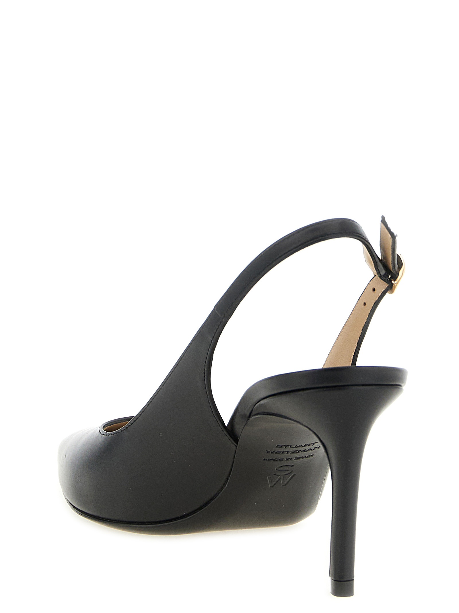 'Stuart Power' smooth calf leather slingbacks with tapered toe, modernized construction for extra support, adjustable strap, covered stiletto heel, foam insole, leather sole.