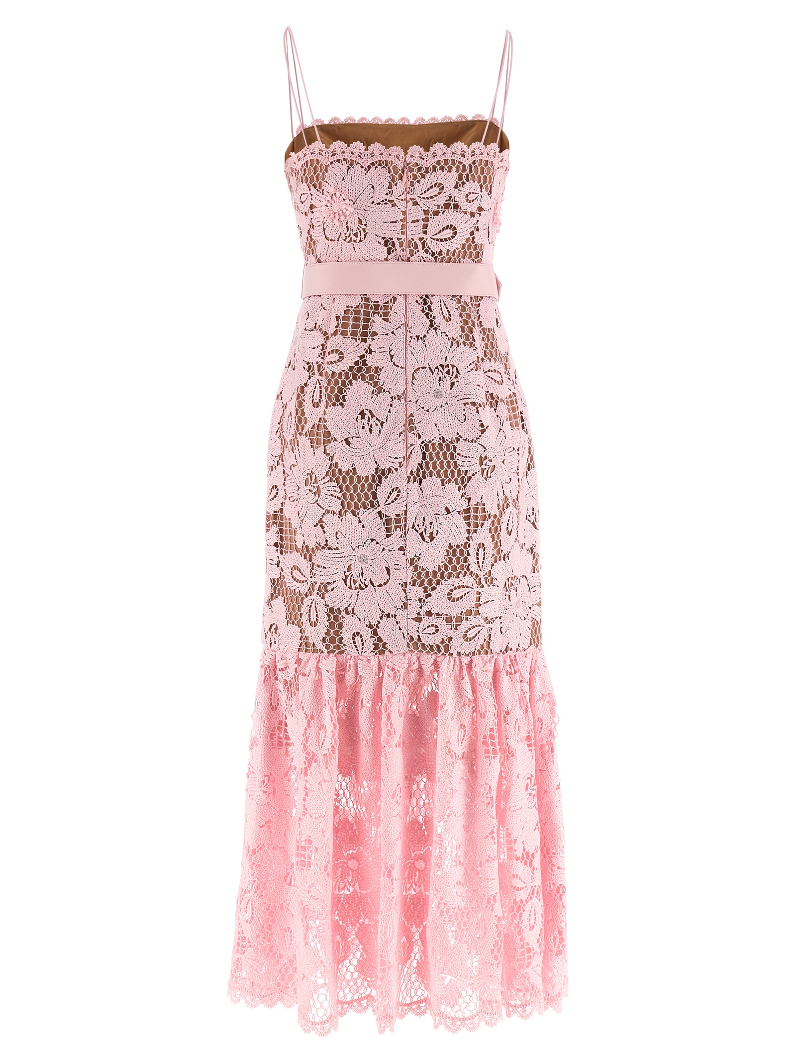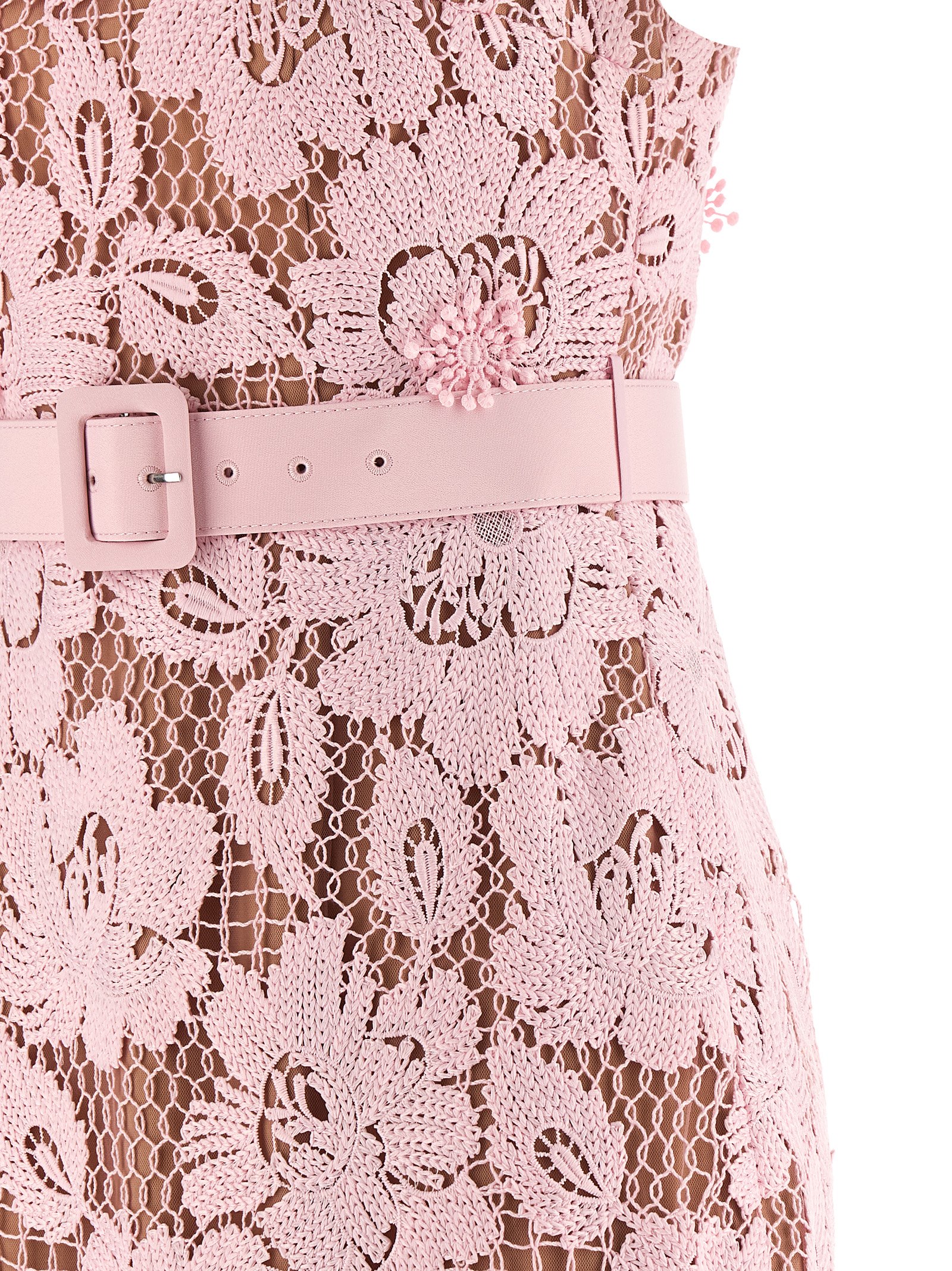 'Pink Crochet Lace Midi' lace dress with a see-not-see effect, lining, flared silhouette with wide flounces on the hem, thin straps, sleeveless, back zip closure, removable matching belt.