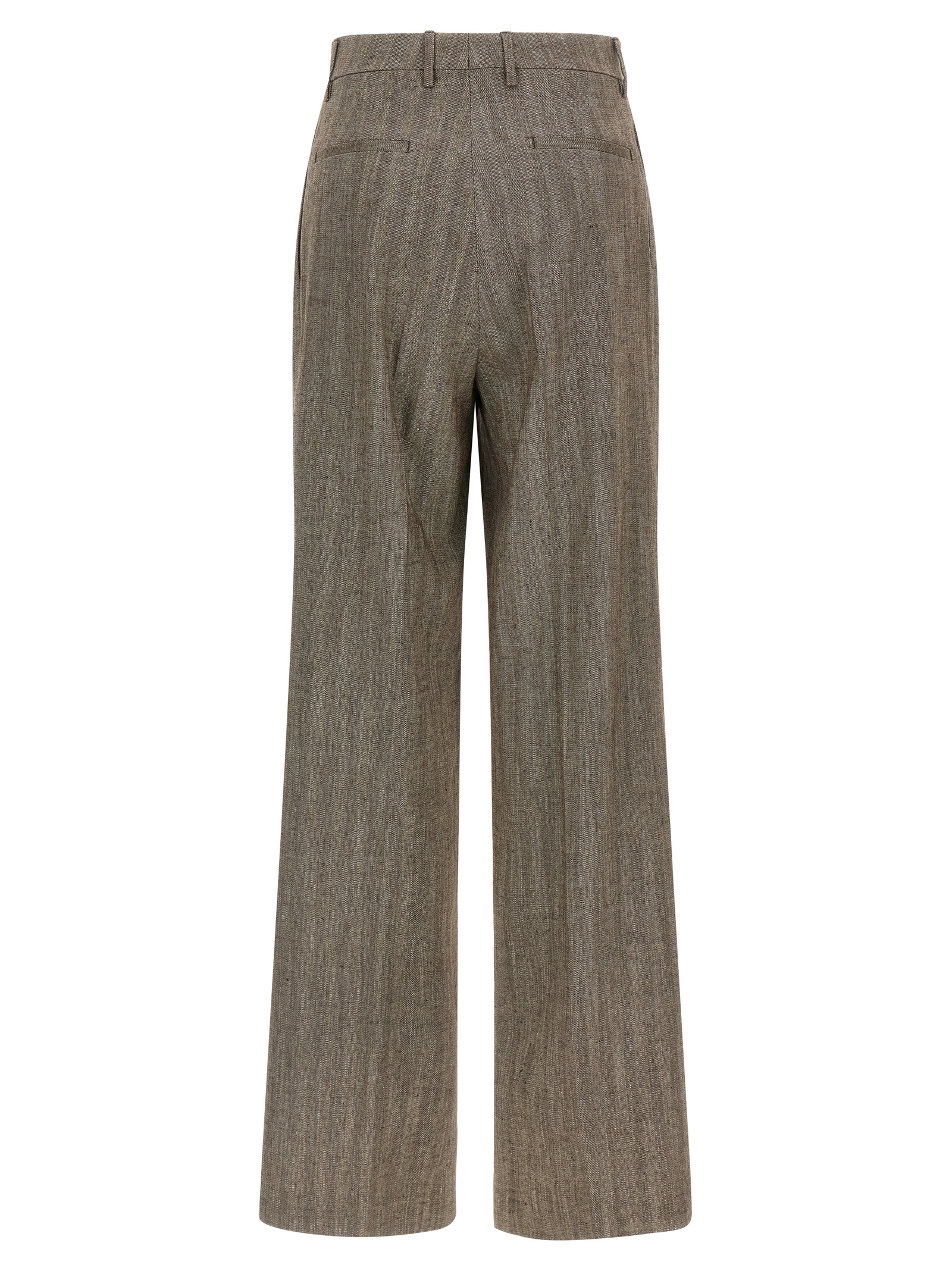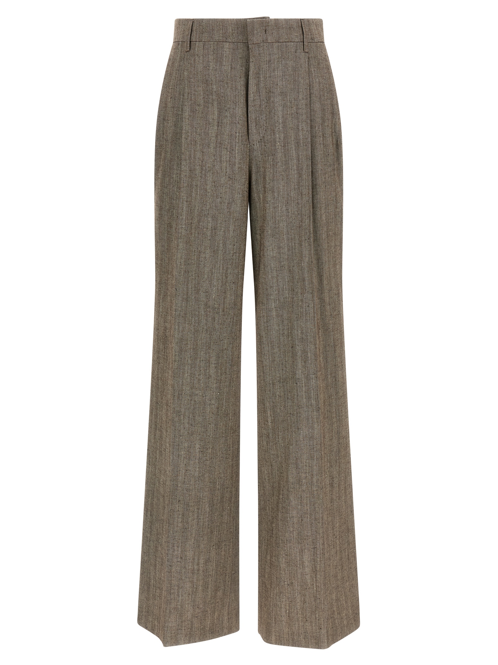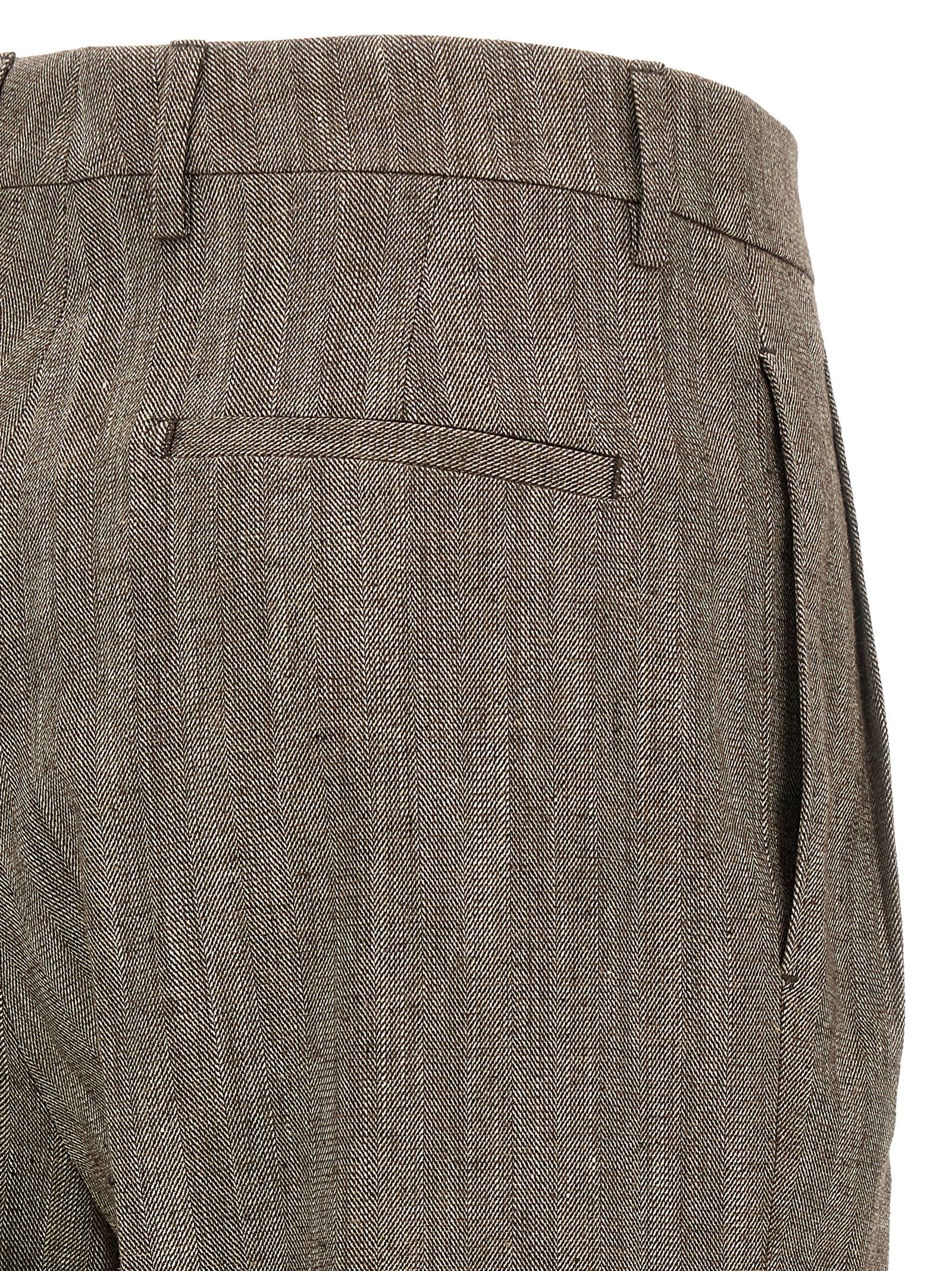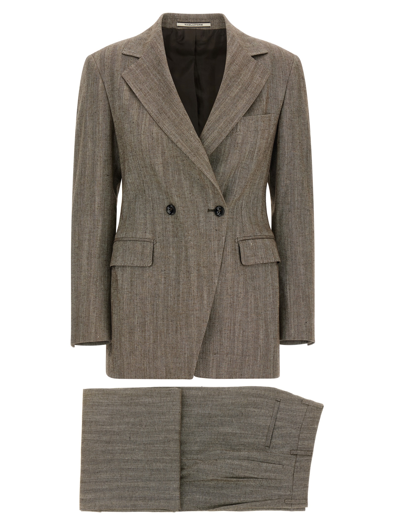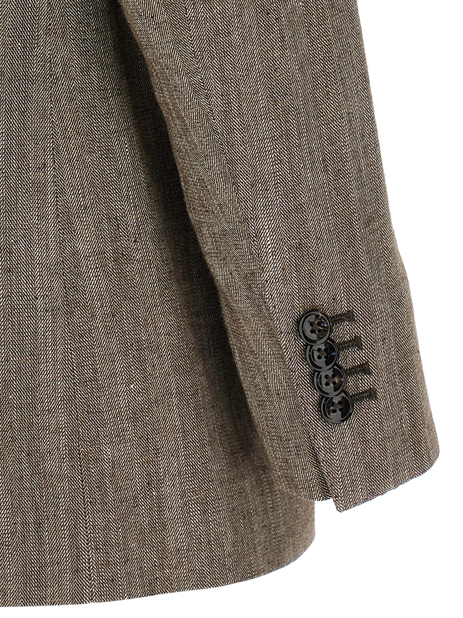 'Astra' dress in viscose, linen and cotton blend with chevron pattern, consisting of double-breasted blazer with two front horn button closure, mirror lapels, breast pocket, flap pockets, structured shoulder strap, long sleeves, back split, cupro lining and trousers with stretched pleat, wide and straight leg, pin tucks, front French pockets, back welt pockets, zip and front hook closure, Cotton lining.