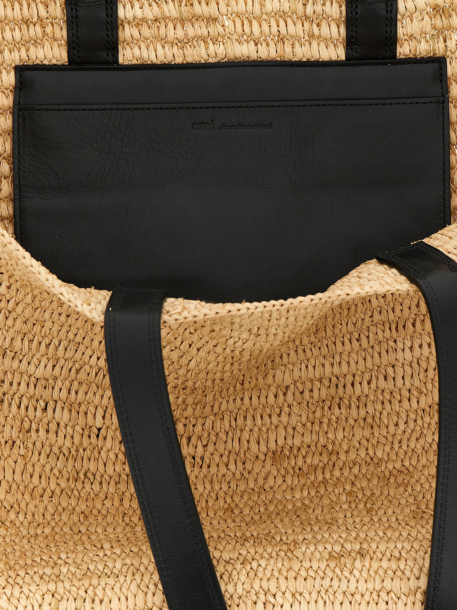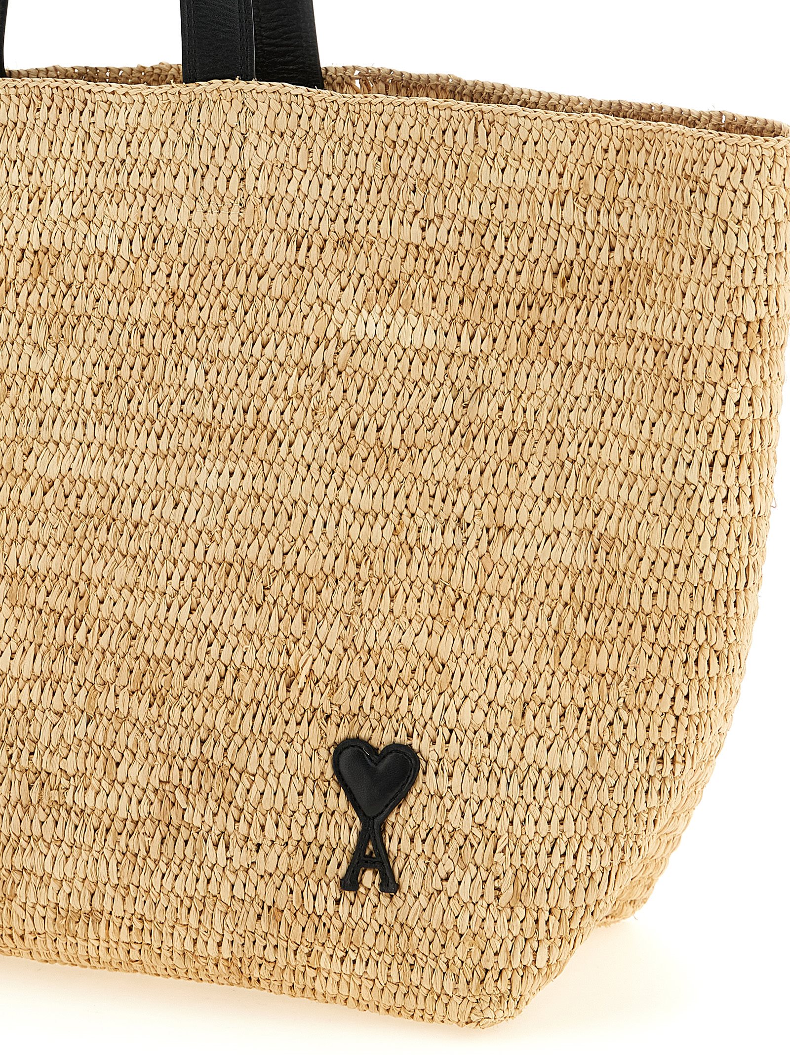 Braided raffia shopping bag with contrasting smooth leather details, front 'Ami de Coeur' patch, double fixed handle, inner pocket, unlined. Handcrafted product, any imperfections are to be considered characteristics of uniqueness.