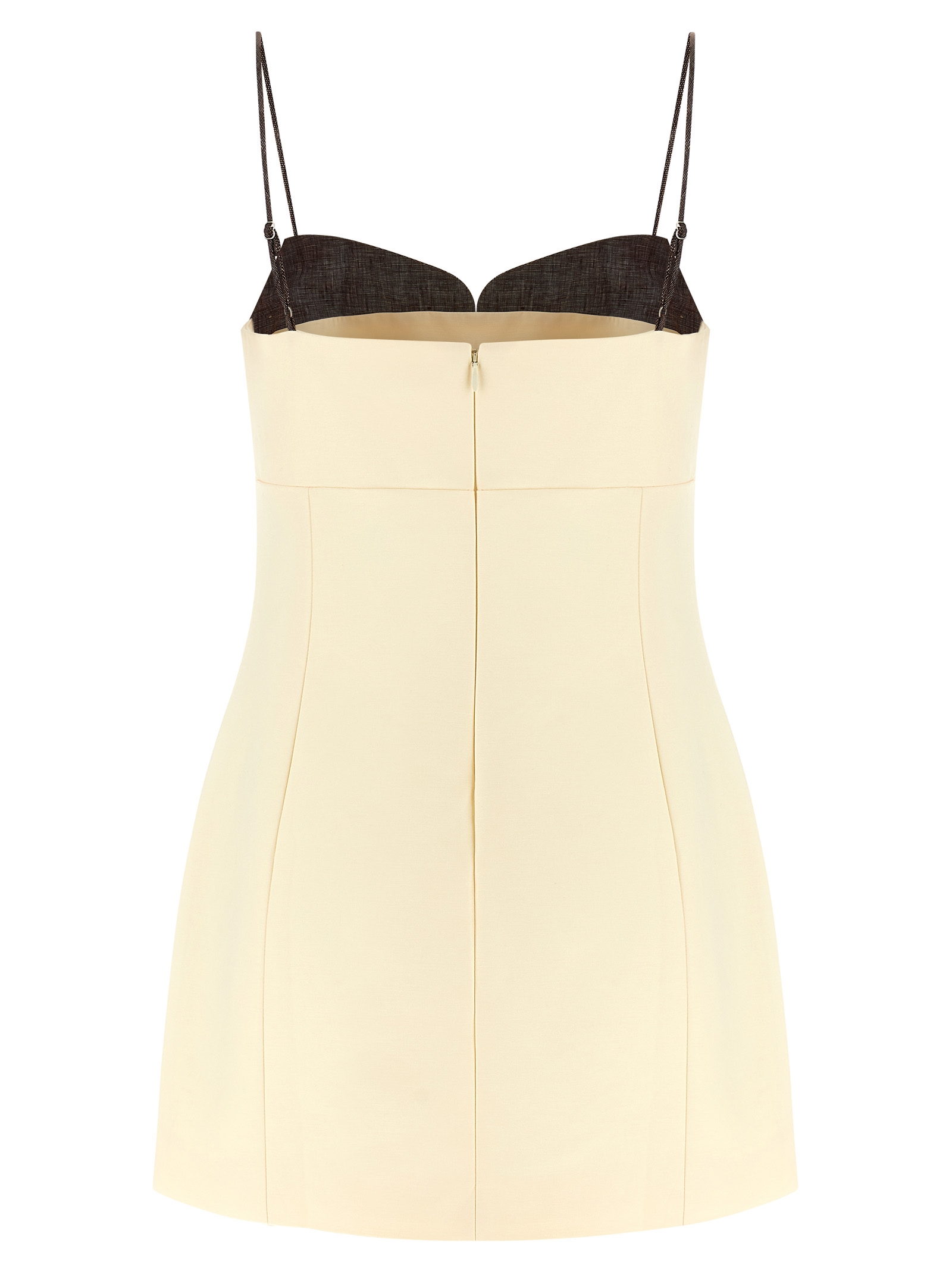 'Tailored' heavy cotton mini dress with contrasting linen details, panel construction, front and back shaping pleats, front heart-shaped neckline, thin adjustable straps, sleeveless, pockets, back zip closure, cupro lining.