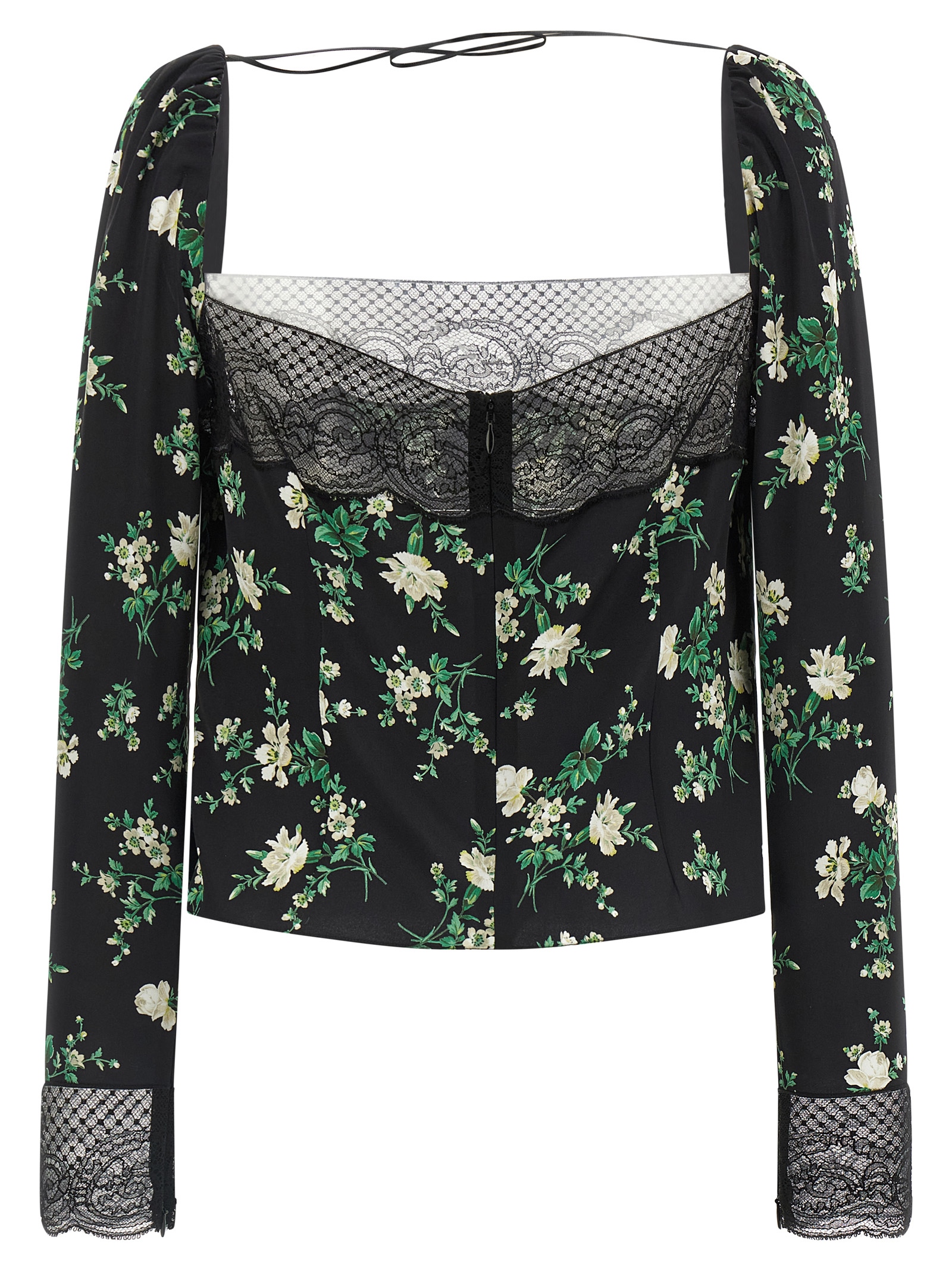 Top in silk blend with all-over flower print, deep front and back neckline with semi-transparent lace inserts, long sleeves with lace and cuffs that can be opened with invisible zip, back zip closure.Характеристики товара