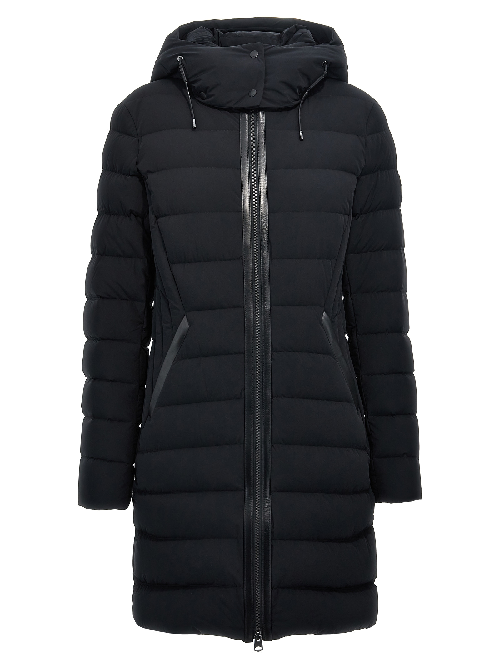 Длинная нейлоновая куртка "Фаррен", утепленная утиным пером, с кожаными деталями, съемным капюшоном, застежкой-молнией, карманами и длинными рукавами.